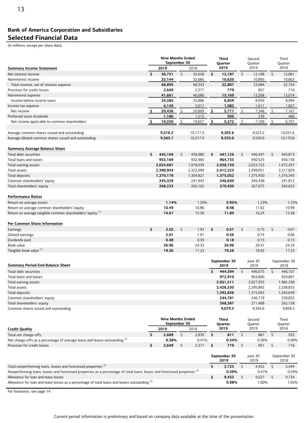 13 Bank of America Corporation and Subsidiaries Selected Financial Data (In millions, except per share data) Nine Months Ended Third Second Third September 30 Quarter Quarter Quarter Summary Income Statement 2019 2018 2019 2019 2018 Net interest income $ 36,751 $ 35,658 $ 12,187 $ 12,189 $ 12,061 Noninterest income 32,144 32,685 10,620 10,895 10,663 Total revenue, net of interest expense 68,895 68,343 22,807 23,084 22,724 Provision for credit losses 2,649 2,377 779 857 716 Noninterest expense 41,661 40,080 15,169 13,268 13,014 Income before income taxes 24,585 25,886 6,859 8,959 8,994 Income tax expense 4,149 5,017 1,082 1,611 1,827 Net income $ 20,436 $ 20,869 $ 5,777 $ 7,348 $ 7,167 Preferred stock dividends 1,186 1,212 505 239 466 Net income applicable to common shareholders $ 19,250 $ 19,657 $ 5,272 $ 7,109 $ 6,701 Average common shares issued and outstanding 9,516.2 10,177.5 9,303.6 9,523.2 10,031.6 Average diluted common shares issued and outstanding 9,565.7 10,317.9 9,353.0 9,559.6 10,170.8 Summary Average Balance Sheet Total debt securities $ 445,104 $ 436,080 $ 447,126 $ 446,447 $ 445,813 Total loans and leases 953,169 932,485 964,733 950,525 930,736 Total earning assets 2,024,687 1,978,039 2,038,720 2,023,722 1,972,437 Total assets 2,390,943 2,322,099 2,412,223 2,399,051 2,317,829 Total deposits 1,370,178 1,304,827 1,375,052 1,375,450 1,316,345 Common shareholders’ equity 245,329 241,943 246,630 245,438 241,812 Total shareholders’ equity 268,223 265,102 270,430 267,975 264,653 Performance Ratios Return on average assets 1.14% 1.20% 0.95% 1.23% 1.23% Return on average common shareholders’ equity 10.49 10.86 8.48 11.62 10.99 Return on average tangible common shareholders’ equity (1) 14.67 15.30 11.84 16.24 15.48 Per Common Share Information Earnings $ 2.02 $ 1.93 $ 0.57 $ 0.75 $ 0.67 Diluted earnings 2.01 1.91 0.56 0.74 0.66 Dividends paid 0.48 0.39 0.18 0.15 0.15 Book value 26.96 24.33 26.96 26.41 24.33 Tangible book value (1) 19.26 17.23 19.26 18.92 17.23 September 30 June 30 September 30 Summary Period-End Balance Sheet 2019 2019 2018 Total debt securities $ 444,594 $ 446,075 $ 446,107 Total loans and leases 972,910 963,800 929,801 Total earning assets 2,051,511 2,027,935 1,982,338 Total assets 2,426,330 2,395,892 2,338,833 Total deposits 1,392,836 1,375,093 1,345,649 Common shareholders’ equity 244,781 246,719 239,832 Total shareholders’ equity 268,387 271,408 262,158 Common shares issued and outstanding 9,079.3 9,342.6 9,858.3 Nine Months Ended Third Second Third September 30 Quarter Quarter Quarter Credit Quality 2019 2018 2019 2019 2018 Total net charge-offs $ 2,689 $ 2,839 $ 811 $ 887 $ 932 Net charge-offs as a percentage of average loans and leases outstanding (2) 0.38% 0.41% 0.34% 0.38% 0.40% Provision for credit losses $ 2,649 $ 2,377 $ 779 $ 857 $ 716 September 30 June 30 September 30 2019 2019 2018 Total nonperforming loans, leases and foreclosed properties (3) $ 3,723 $ 4,452 $ 5,449 Nonperforming loans, leases and foreclosed properties as a percentage of total loans, leases and foreclosed properties (2) 0.39% 0.47% 0.59% Allowance for loan and lease losses $ 9,433 $ 9,527 $ 9,734 Allowance for loan and lease losses as a percentage of total loans and leases outstanding (2) 0.98% 1.00% 1.05% For footnotes, see page 14. Current period information is preliminary and based on company data available at the time of the presentation.