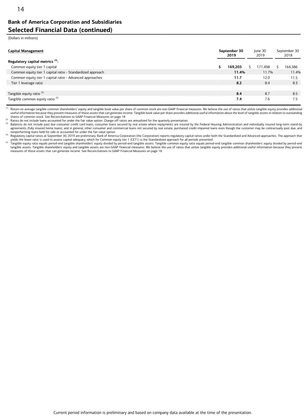 14 Bank of America Corporation and Subsidiaries Selected Financial Data (continued) (Dollars in millions) Capital Management September 30 June 30 September 30 2019 2019 2018 Regulatory capital metrics (4): Common equity tier 1 capital $ 169,203 $ 171,498 $ 164,386 Common equity tier 1 capital ratio - Standardized approach 11.4% 11.7% 11.4% Common equity tier 1 capital ratio - Advanced approaches 11.7 12.0 11.5 Tier 1 leverage ratio 8.2 8.4 8.3 Tangible equity ratio (5) 8.4 8.7 8.5 Tangible common equity ratio (5) 7.4 7.6 7.5 (1) Return on average tangible common shareholders’ equity and tangible book value per share of common stock are non-GAAP financial measures. We believe the use of ratios that utilize tangible equity provides additional useful information because they present measures of those assets that can generate income. Tangible book value per share provides additional useful information about the level of tangible assets in relation to outstanding shares of common stock. See Reconciliations to GAAP Financial Measures on page 18. (2) Ratios do not include loans accounted for under the fair value option. Charge-off ratios are annualized for the quarterly presentation. (3) Balances do not include past due consumer credit card loans, consumer loans secured by real estate where repayments are insured by the Federal Housing Administration and individually insured long-term stand-by agreements (fully insured home loans), and in general, other consumer and commercial loans not secured by real estate; purchased credit-impaired loans even though the customer may be contractually past due; and nonperforming loans held for sale or accounted for under the fair value option. (4) Regulatory capital ratios at September 30, 2019 are preliminary. Bank of America Corporation (the Corporation) reports regulatory capital ratios under both the Standardized and Advanced approaches. The approach that yields the lower ratio is used to assess capital adequacy, which for Common equity tier 1 (CET1) is the Standardized approach for all periods presented. (5) Tangible equity ratio equals period-end tangible shareholders’ equity divided by period-end tangible assets. Tangible common equity ratio equals period-end tangible common shareholders’ equity divided by period-end tangible assets. Tangible shareholders’ equity and tangible assets are non-GAAP financial measures. We believe the use of ratios that utilize tangible equity provides additional useful information because they present measures of those assets that can generate income. See Reconciliations to GAAP Financial Measures on page 18. Current period information is preliminary and based on company data available at the time of the presentation.