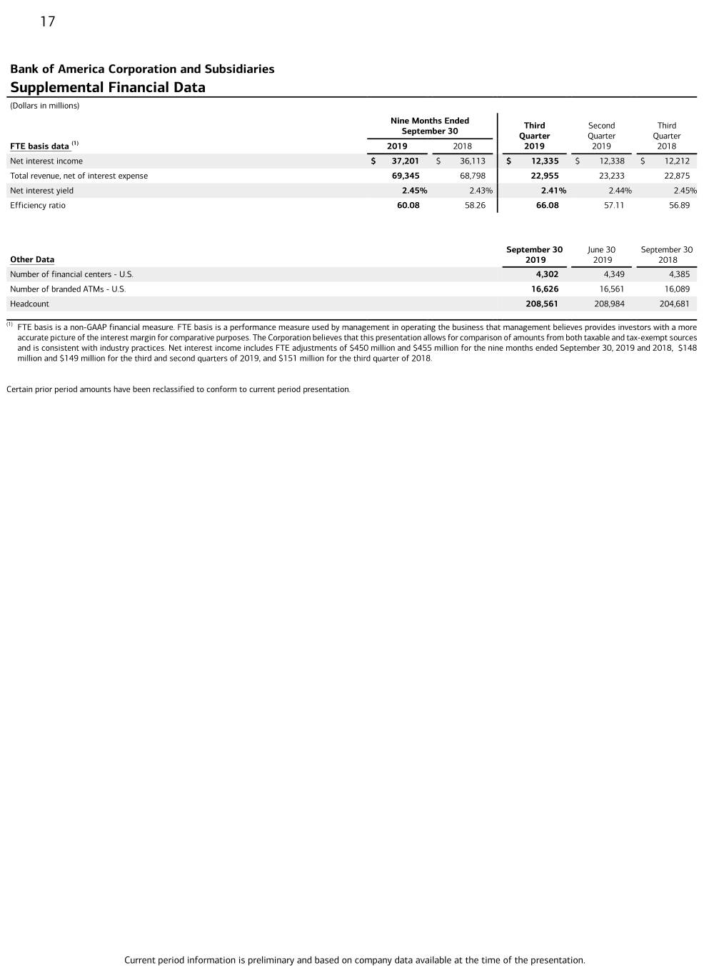 17 Bank of America Corporation and Subsidiaries Supplemental Financial Data (Dollars in millions) Nine Months Ended Third Second Third September 30 Quarter Quarter Quarter FTE basis data (1) 2019 2018 2019 2019 2018 Net interest income $ 37,201 $ 36,113 $ 12,335 $ 12,338 $ 12,212 Total revenue, net of interest expense 69,345 68,798 22,955 23,233 22,875 Net interest yield 2.45% 2.43% 2.41% 2.44% 2.45% Efficiency ratio 60.08 58.26 66.08 57.11 56.89 September 30 June 30 September 30 Other Data 2019 2019 2018 Number of financial centers - U.S. 4,302 4,349 4,385 Number of branded ATMs - U.S. 16,626 16,561 16,089 Headcount 208,561 208,984 204,681 (1) FTE basis is a non-GAAP financial measure. FTE basis is a performance measure used by management in operating the business that management believes provides investors with a more accurate picture of the interest margin for comparative purposes. The Corporation believes that this presentation allows for comparison of amounts from both taxable and tax-exempt sources and is consistent with industry practices. Net interest income includes FTE adjustments of $450 million and $455 million for the nine months ended September 30, 2019 and 2018, $148 million and $149 million for the third and second quarters of 2019, and $151 million for the third quarter of 2018. Certain prior period amounts have been reclassified to conform to current period presentation. Current period information is preliminary and based on company data available at the time of the presentation.