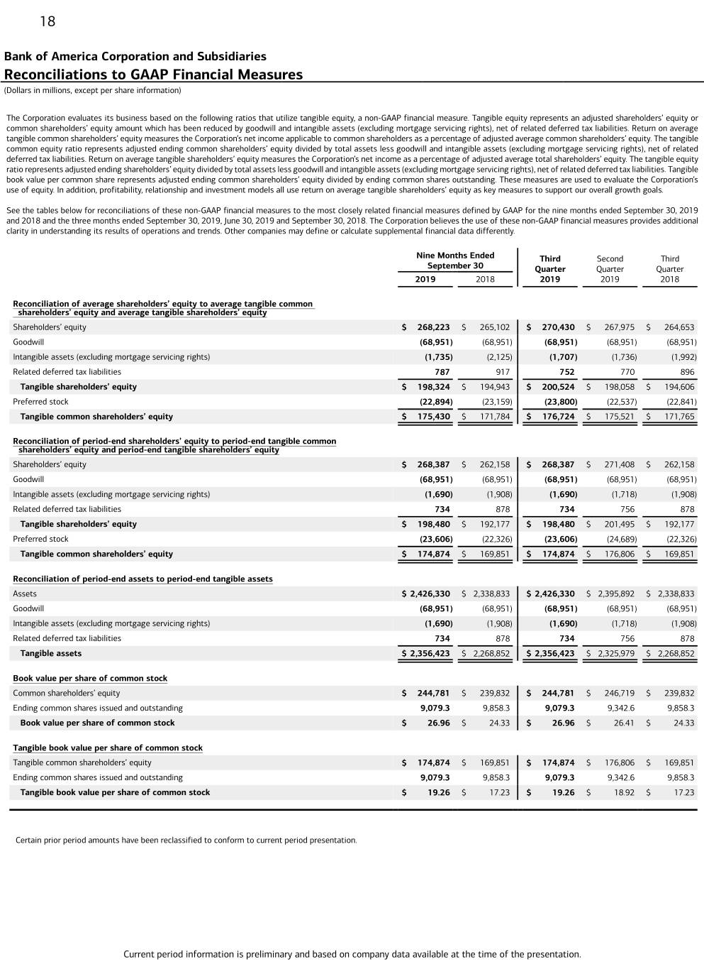 18 Bank of America Corporation and Subsidiaries Reconciliations to GAAP Financial Measures (Dollars in millions, except per share information) The Corporation evaluates its business based on the following ratios that utilize tangible equity, a non-GAAP financial measure. Tangible equity represents an adjusted shareholders’ equity or common shareholders’ equity amount which has been reduced by goodwill and intangible assets (excluding mortgage servicing rights), net of related deferred tax liabilities. Return on average tangible common shareholders’ equity measures the Corporation’s net income applicable to common shareholders as a percentage of adjusted average common shareholders’ equity. The tangible common equity ratio represents adjusted ending common shareholders’ equity divided by total assets less goodwill and intangible assets (excluding mortgage servicing rights), net of related deferred tax liabilities. Return on average tangible shareholders’ equity measures the Corporation’s net income as a percentage of adjusted average total shareholders’ equity. The tangible equity ratio represents adjusted ending shareholders’ equity divided by total assets less goodwill and intangible assets (excluding mortgage servicing rights), net of related deferred tax liabilities. Tangible book value per common share represents adjusted ending common shareholders’ equity divided by ending common shares outstanding. These measures are used to evaluate the Corporation’s use of equity. In addition, profitability, relationship and investment models all use return on average tangible shareholders’ equity as key measures to support our overall growth goals. See the tables below for reconciliations of these non-GAAP financial measures to the most closely related financial measures defined by GAAP for the nine months ended September 30, 2019 and 2018 and the three months ended September 30, 2019, June 30, 2019 and September 30, 2018. The Corporation believes the use of these non-GAAP financial measures provides additional clarity in understanding its results of operations and trends. Other companies may define or calculate supplemental financial data differently. Nine Months Ended Third Second Third September 30 Quarter Quarter Quarter 2019 2018 2019 2019 2018 Reconciliation of average shareholders’ equity to average tangible common shareholders’ equity and average tangible shareholders’ equity Shareholders’ equity $ 268,223 $ 265,102 $ 270,430 $ 267,975 $ 264,653 Goodwill (68,951) (68,951) (68,951) (68,951) (68,951) Intangible assets (excluding mortgage servicing rights) (1,735) (2,125) (1,707) (1,736) (1,992) Related deferred tax liabilities 787 917 752 770 896 Tangible shareholders’ equity $ 198,324 $ 194,943 $ 200,524 $ 198,058 $ 194,606 Preferred stock (22,894) (23,159) (23,800) (22,537) (22,841) Tangible common shareholders’ equity $ 175,430 $ 171,784 $ 176,724 $ 175,521 $ 171,765 Reconciliation of period-end shareholders’ equity to period-end tangible common shareholders’ equity and period-end tangible shareholders’ equity Shareholders’ equity $ 268,387 $ 262,158 $ 268,387 $ 271,408 $ 262,158 Goodwill (68,951) (68,951) (68,951) (68,951) (68,951) Intangible assets (excluding mortgage servicing rights) (1,690) (1,908) (1,690) (1,718) (1,908) Related deferred tax liabilities 734 878 734 756 878 Tangible shareholders’ equity $ 198,480 $ 192,177 $ 198,480 $ 201,495 $ 192,177 Preferred stock (23,606) (22,326) (23,606) (24,689) (22,326) Tangible common shareholders’ equity $ 174,874 $ 169,851 $ 174,874 $ 176,806 $ 169,851 Reconciliation of period-end assets to period-end tangible assets Assets $ 2,426,330 $ 2,338,833 $ 2,426,330 $ 2,395,892 $ 2,338,833 Goodwill (68,951) (68,951) (68,951) (68,951) (68,951) Intangible assets (excluding mortgage servicing rights) (1,690) (1,908) (1,690) (1,718) (1,908) Related deferred tax liabilities 734 878 734 756 878 Tangible assets $ 2,356,423 $ 2,268,852 $ 2,356,423 $ 2,325,979 $ 2,268,852 Book value per share of common stock Common shareholders’ equity $ 244,781 $ 239,832 $ 244,781 $ 246,719 $ 239,832 Ending common shares issued and outstanding 9,079.3 9,858.3 9,079.3 9,342.6 9,858.3 Book value per share of common stock $ 26.96 $ 24.33 $ 26.96 $ 26.41 $ 24.33 Tangible book value per share of common stock Tangible common shareholders’ equity $ 174,874 $ 169,851 $ 174,874 $ 176,806 $ 169,851 Ending common shares issued and outstanding 9,079.3 9,858.3 9,079.3 9,342.6 9,858.3 Tangible book value per share of common stock $ 19.26 $ 17.23 $ 19.26 $ 18.92 $ 17.23 Certain prior period amounts have been reclassified to conform to current period presentation. Current period information is preliminary and based on company data available at the time of the presentation.