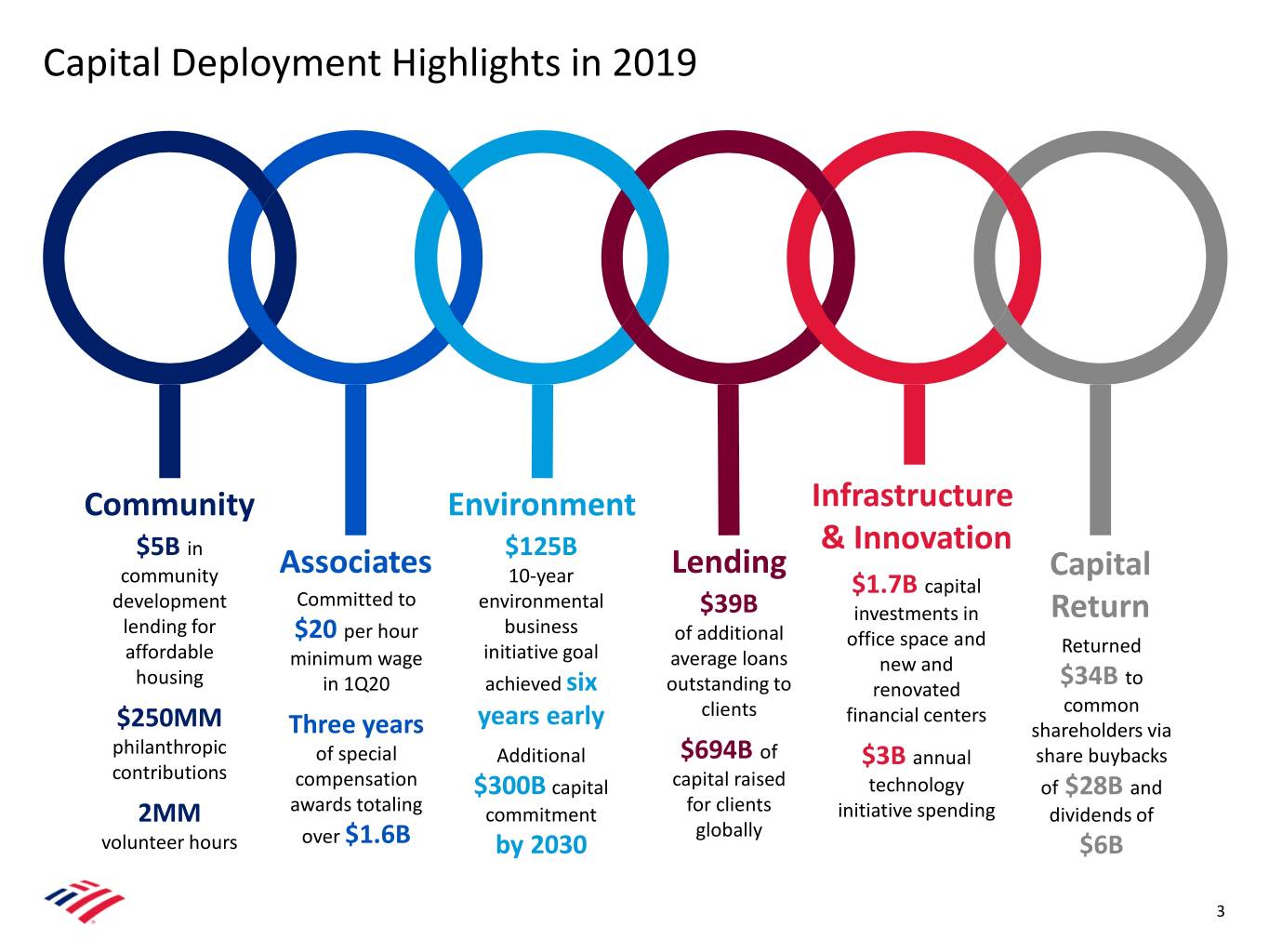 Capital Deployment Highlights in 2019 Community Environment Infrastructure $5B in $125B & Innovation Associates Lending Capital community 10-year $1.7B capital development Committed to environmental $39B investments in lending for business Return $20 per hour of additional office space and affordable initiative goal Returned minimum wage average loans new and housing to in 1Q20 achieved six outstanding to renovated $34B clients financial centers common $250MM Three years years early shareholders via philanthropic of special Additional $694B of $3B annual share buybacks contributions compensation $300B capital capital raised technology of $28B and 2MM awards totaling commitment for clients initiative spending dividends of globally volunteer hours over $1.6B by 2030 $6B 3