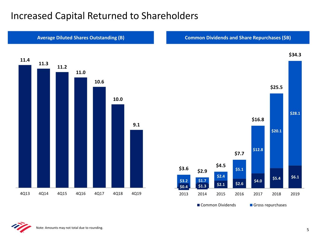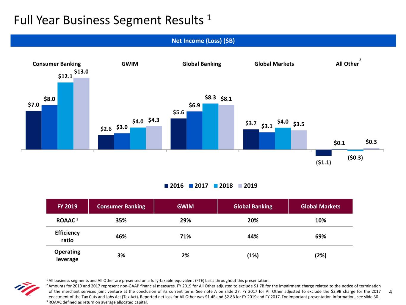 Full Year Business Segment Results 1 Net Income (Loss) ($B) 2 Consumer Banking GWIM Global Banking Global Markets All Other $13.0 $12.1 $8.0 $8.3 $8.1 $7.0 $6.9 $5.6 $4.3 $4.0 $3.7 $4.0 $3.5 $2.6 $3.0 $3.1 $0.1 $0.3 ($0.3) ($1.1) 2016 2017 2018 2019 FY 2019 Consumer Banking GWIM Global Banking Global Markets ROAAC 3 35% 29% 20% 10% Efficiency 46% 71% 44% 69% ratio Operating 3% 2% (1%) (2%) leverage 1 All business segments and All Other are presented on a fully-taxable equivalent (FTE) basis throughout this presentation. 2 Amounts for 2019 and 2017 represent non-GAAP financial measures. FY 2019 for All Other adjusted to exclude $1.7B for the impairment charge related to the notice of termination of the merchant services joint venture at the conclusion of its current term. See note A on slide 27. FY 2017 for All Other adjusted to exclude the $2.9B charge for the 2017 4 enactment of the Tax Cuts and Jobs Act (Tax Act). Reported net loss for All Other was $1.4B and $2.8B for FY 2019 and FY 2017. For important presentation information, see slide 30. 3 ROAAC defined as return on average allocated capital.
