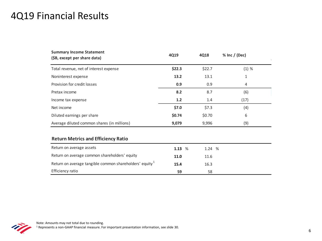 Full Year 2019 Financial Results FY19 vs. FY19 ex-3Q19 JV FY19 FY18 Summary Income Statement FY18 vs. FY18 1 ($B, except per share data) Ex- 3Q19 JV Reported Reported % Inc / (Dec) % Inc / (Dec) impairment 1 Total revenue, net of interest expense $91.2 $91.2 $91.0 0 % 0 % Noninterest expense 54.9 52.8 53.2 3 (1) Provision for credit losses 3.6 3.6 3.3 9 9 Pretax income 32.8 34.8 34.6 (5) 1 Income tax expense 5.3 5.7 6.4 (17) (11) Net income $27.4 $29.1 $28.1 (3) 3 Diluted earnings per share $2.75 $2.93 $2.61 5 12 Average diluted common shares (in millions) 9,443 9,443 10,237 (8) (8) Return Metrics and Efficiency Ratio Return on average assets 1.14 % 1.21 % 1.21 % (7) bps 0 bps Return on average common shareholders' equity 10.6 11.3 11.0 (42) 24 2 Return on average tangible common shareholders' equity 14.9 15.8 15.5 (69) 22 Efficiency ratio 60 58 58 177 (50) Note: Amounts may not total due to rounding. 1 As previously reported, 3Q19 included a non-cash, pretax impairment charge of $2.1B related to the notice of termination of the merchant services joint venture at the conclusion of its current term, which reduced FY19 results by $0.18 per diluted common share. Amounts in this column represent non-GAAP financial measures. For a reconciliation to GAAP of the presented financial metrics, see note A on slide 27. For important presentation information, see slide 30. 2 2 Represents a non-GAAP financial measure. For important presentation information, see slide 30.