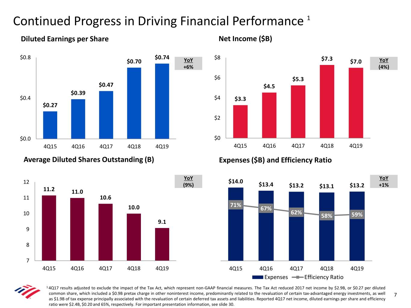 4Q19 Financial Results Summary Income Statement 4Q19 4Q18 % Inc / (Dec) ($B, except per share data) Total revenue, net of interest expense $22.3 $22.7 (1) % Noninterest expense 13.2 13.1 1 Provision for credit losses 0.9 0.9 4 Pretax income 8.2 8.7 (6) Income tax expense 1.2 1.4 (17) Net income $7.0 $7.3 (4) Diluted earnings per share $0.74 $0.70 6 Average diluted common shares (in millions) 9,079 9,996 (9) Return Metrics and Efficiency Ratio Return on average assets 1.13 % 1.24 % (11) bps Return on average common shareholders' equity 11.0 11.6 (57) 1 Return on average tangible common shareholders' equity 15.4 16.3 (86) Efficiency ratio 59 58 147 Note: Amounts may not total due to rounding. 1 Represents a non-GAAP financial measure. For important presentation information, see slide 30. 6