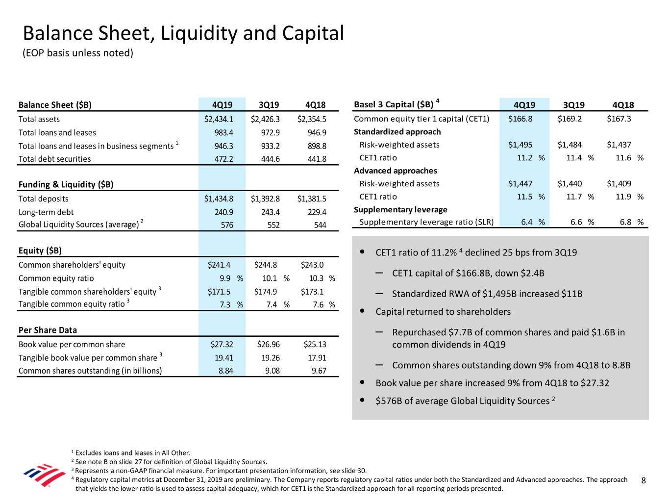 Continued Progress in Driving Financial Performance 1 Diluted Earnings per Share Net Income ($B) $0.8 $0.74 $8 $0.70 YoY $7.3 $7.0 YoY +6% (4%) $6 $5.3 $0.47 $4.5 $0.39 $0.4 $4 $3.3 $0.27 $2 $0.0 $0 4Q15 4Q16 4Q17 4Q18 4Q19 4Q15 4Q16 4Q17 4Q18 4Q19 Average Diluted Shares Outstanding (B) Expenses ($B) and Efficiency Ratio YoY YoY 12 $14.0 (9%) $13.4 $13.2 $13.1 $13.2 +1% 11.2 11.0 11 10.6 71% 10.0 67% 62% 10 58% 59% 9.1 9 8 7 4Q15 4Q16 4Q17 4Q18 4Q19 4Q15 4Q16 4Q17 4Q18 4Q19 Expenses Efficiency Ratio 1 4Q17 results adjusted to exclude the impact of the Tax Act, which represent non-GAAP financial measures. The Tax Act reduced 2017 net income by $2.9B, or $0.27 per diluted common share, which included a $0.9B pretax charge in other noninterest income, predominantly related to the revaluation of certain tax-advantaged energy investments, as well 7 as $1.9B of tax expense principally associated with the revaluation of certain deferred tax assets and liabilities. Reported 4Q17 net income, diluted earnings per share and efficiency ratio were $2.4B, $0.20 and 65%, respectively. For important presentation information, see slide 30.