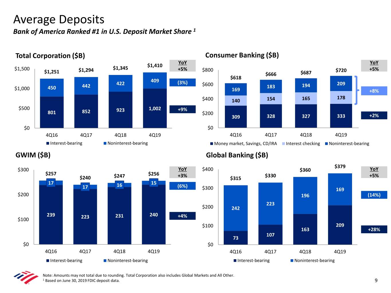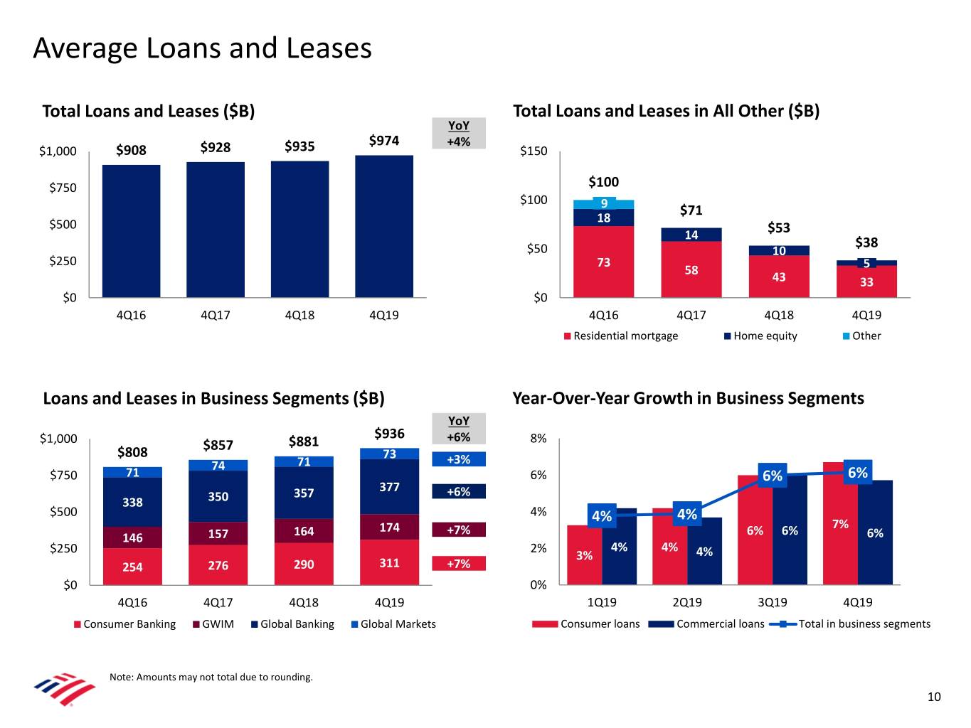 Average Deposits Bank of America Ranked #1 in U.S. Deposit Market Share 1 Total Corporation ($B) Consumer Banking ($B) YoY YoY $1,410 $1,500 $1,294 $1,345 +5% $800 $720 +5% $1,251 $666 $687 $618 409 422 (3%) $600 209 450 442 183 194 $1,000 169 +8% 178 $400 140 154 165 $500 923 1,002 +9% 801 852 $200 309 328 327 333 +2% $0 $0 4Q16 4Q17 4Q18 4Q19 4Q16 4Q17 4Q18 4Q19 Interest-bearing Noninterest-bearing Money market, Savings, CD/IRA Interest checking Noninterest-bearing GWIM ($B) Global Banking ($B) $379 $300 YoY $400 $360 YoY $257 $256 $330 +5% $240 $247 +3% $315 17 15 16 (6%) 17 $300 169 $200 196 (14%) 223 $200 242 239 231 240 +4% $100 223 $100 209 163 +28% 107 73 $0 $0 4Q16 4Q17 4Q18 4Q19 4Q16 4Q17 4Q18 4Q19 Interest-bearing Noninterest-bearing Interest-bearing Noninterest-bearing Note: Amounts may not total due to rounding. Total Corporation also includes Global Markets and All Other. 1 Based on June 30, 2019 FDIC deposit data. 9