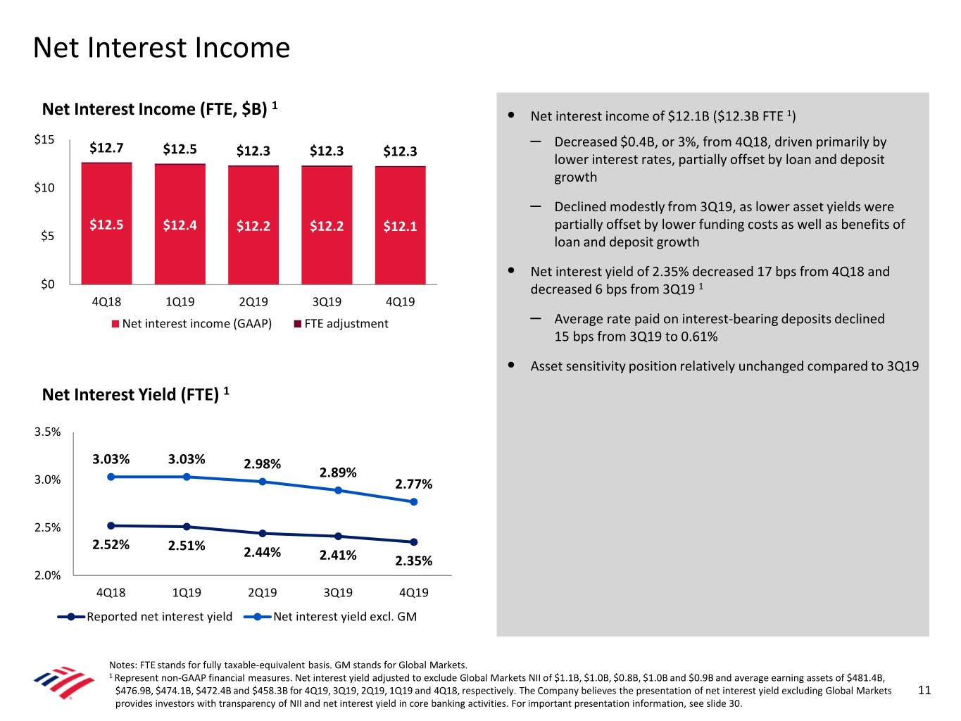Average Loans and Leases Total Loans and Leases ($B) Total Loans and Leases in All Other ($B) YoY $974 +4% $1,000 $908 $928 $935 $150 $750 $100 $100 9 $71 $500 18 14 $53 $38 $50 10 $250 73 58 5 43 33 $0 $0 4Q16 4Q17 4Q18 4Q19 4Q16 4Q17 4Q18 4Q19 Residential mortgage Home equity Other Loans and Leases in Business Segments ($B) Year-Over-Year Growth in Business Segments YoY $936 +6% 8% $1,000 $857 $881 $808 73 74 71 +3% $750 71 6% 6% 6% 357 377 +6% 338 350 $500 4% 4% 4% 174 +7% 6% 6% 7% 146 157 164 6% $250 2% 4% 4% 3% 4% 254 276 290 311 +7% $0 0% 4Q16 4Q17 4Q18 4Q19 1Q19 2Q19 3Q19 4Q19 Consumer Banking GWIM Global Banking Global Markets Consumer loans Commercial loans Total in business segments Note: Amounts may not total due to rounding. 10