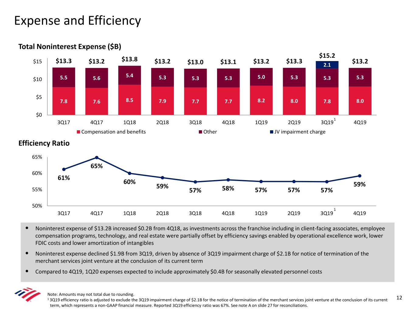 Expense and Efficiency Total Noninterest Expense ($B) $15.2 $15 $13.3 $13.8 $13.3 $13.2 $13.2 $13.0 $13.1 $13.2 2.1 $13.2 5.4 $10 5.5 5.6 5.3 5.3 5.3 5.0 5.3 5.3 5.3 $5 7.8 7.6 8.5 7.9 7.7 7.7 8.2 8.0 7.8 8.0 $0 1 3Q17 4Q17 1Q18 2Q18 3Q18 4Q18 1Q19 2Q19 3Q19 4Q19 Compensation and benefits Other JV impairment charge Efficiency Ratio 65% 65% 60% 61% 60% 59% 59% 55% 57% 58% 57% 57% 57% 50% 1 3Q17 4Q17 1Q18 2Q18 3Q18 4Q18 1Q19 2Q19 3Q19 4Q19 • Noninterest expense of $13.2B increased $0.2B from 4Q18, as investments across the franchise including in client-facing associates, employee compensation programs, technology, and real estate were partially offset by efficiency savings enabled by operational excellence work, lower FDIC costs and lower amortization of intangibles 1 • Noninterest expense declined $1.9B from 3Q19, driven by absence of 3Q19 impairment charge of $2.1B for notice of termination of the merchant services joint venture at the conclusion of its current term • Compared to 4Q19, 1Q20 expenses expected to include approximately $0.4B for seasonally elevated personnel costs Note: Amounts may not total due to rounding. 1 3Q19 efficiency ratio is adjusted to exclude the 3Q19 impairment charge of $2.1B for the notice of termination of the merchant services joint venture at the conclusion of its current 12 term, which represents a non-GAAP financial measure. Reported 3Q19 efficiency ratio was 67%. See note A on slide 27 for reconciliations.