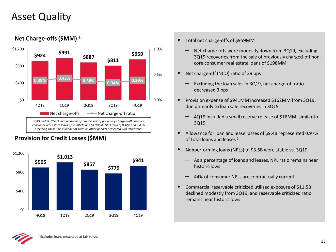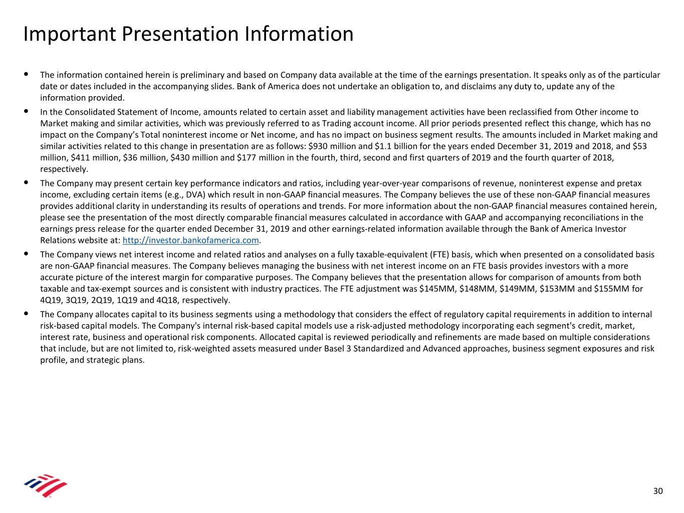 Important Presentation Information • The information contained herein is preliminary and based on Company data available at the time of the earnings presentation. It speaks only as of the particular date or dates included in the accompanying slides. Bank of America does not undertake an obligation to, and disclaims any duty to, update any of the information provided. • In the Consolidated Statement of Income, amounts related to certain asset and liability management activities have been reclassified from Other income to Market making and similar activities, which was previously referred to as Trading account income. All prior periods presented reflect this change, which has no impact on the Company’s Total noninterest income or Net income, and has no impact on business segment results. The amounts included in Market making and similar activities related to this change in presentation are as follows: $930 million and $1.1 billion for the years ended December 31, 2019 and 2018, and $53 million, $411 million, $36 million, $430 million and $177 million in the fourth, third, second and first quarters of 2019 and the fourth quarter of 2018, respectively. • The Company may present certain key performance indicators and ratios, including year-over-year comparisons of revenue, noninterest expense and pretax income, excluding certain items (e.g., DVA) which result in non-GAAP financial measures. The Company believes the use of these non-GAAP financial measures provides additional clarity in understanding its results of operations and trends. For more information about the non-GAAP financial measures contained herein, please see the presentation of the most directly comparable financial measures calculated in accordance with GAAP and accompanying reconciliations in the earnings press release for the quarter ended December 31, 2019 and other earnings-related information available through the Bank of America Investor Relations website at: http://investor.bankofamerica.com. • The Company views net interest income and related ratios and analyses on a fully taxable-equivalent (FTE) basis, which when presented on a consolidated basis are non-GAAP financial measures. The Company believes managing the business with net interest income on an FTE basis provides investors with a more accurate picture of the interest margin for comparative purposes. The Company believes that the presentation allows for comparison of amounts from both taxable and tax-exempt sources and is consistent with industry practices. The FTE adjustment was $145MM, $148MM, $149MM, $153MM and $155MM for 4Q19, 3Q19, 2Q19, 1Q19 and 4Q18, respectively. • The Company allocates capital to its business segments using a methodology that considers the effect of regulatory capital requirements in addition to internal risk-based capital models. The Company's internal risk-based capital models use a risk-adjusted methodology incorporating each segment's credit, market, interest rate, business and operational risk components. Allocated capital is reviewed periodically and refinements are made based on multiple considerations that include, but are not limited to, risk-weighted assets measured under Basel 3 Standardized and Advanced approaches, business segment exposures and risk profile, and strategic plans. 30