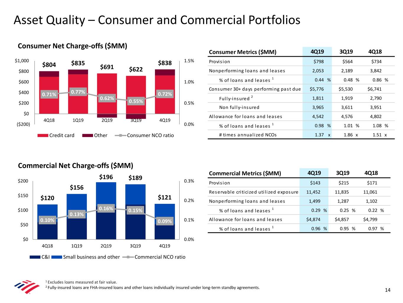 Asset Quality 1 Net Charge-offs ($MM) • Total net charge-offs of $959MM $1,200 1.0% – Net charge-offs were modestly down from 3Q19, excluding $991 $959 $924 $887 3Q19 recoveries from the sale of previously charged-off non- $811 core consumer real estate loans of $198MM $800 0.5% • Net charge-off (NCO) ratio of 39 bps 0.43% 0.39% 0.38% 0.39% $400 0.34% – Excluding the loan sales in 3Q19, net charge-off ratio decreased 3 bps $0 0.0% • Provision expense of $941MM increased $162MM from 3Q19, 4Q18 1Q19 2Q19 3Q19 4Q19 due primarily to loan sale recoveries in 3Q19 Net charge-offs Net charge-off ratio – 4Q19 included a small reserve release of $18MM, similar to 3Q19 and 2Q19 included recoveries from the sale of previously charged-off non-core consumer real estate loans of $198MM and $118MM; NCO ratio of 0.42% and 0.43% 3Q19 excluding these sales; impact of sales on other periods presented was immaterial • Allowance for loan and lease losses of $9.4B represented 0.97% Provision for Credit Losses ($MM) of total loans and leases 1 • Nonperforming loans (NPLs) of $3.6B were stable vs. 3Q19 $1,200 $1,013 $941 – As a percentage of loans and leases, NPL ratio remains near $905 $857 $779 historic lows $800 – 44% of consumer NPLs are contractually current • Commercial reservable criticized utilized exposure of $11.5B $400 declined modestly from 3Q19, and reservable criticized ratio remains near historic lows $0 4Q18 1Q19 2Q19 3Q19 4Q19 1 Excludes loans measured at fair value. 13