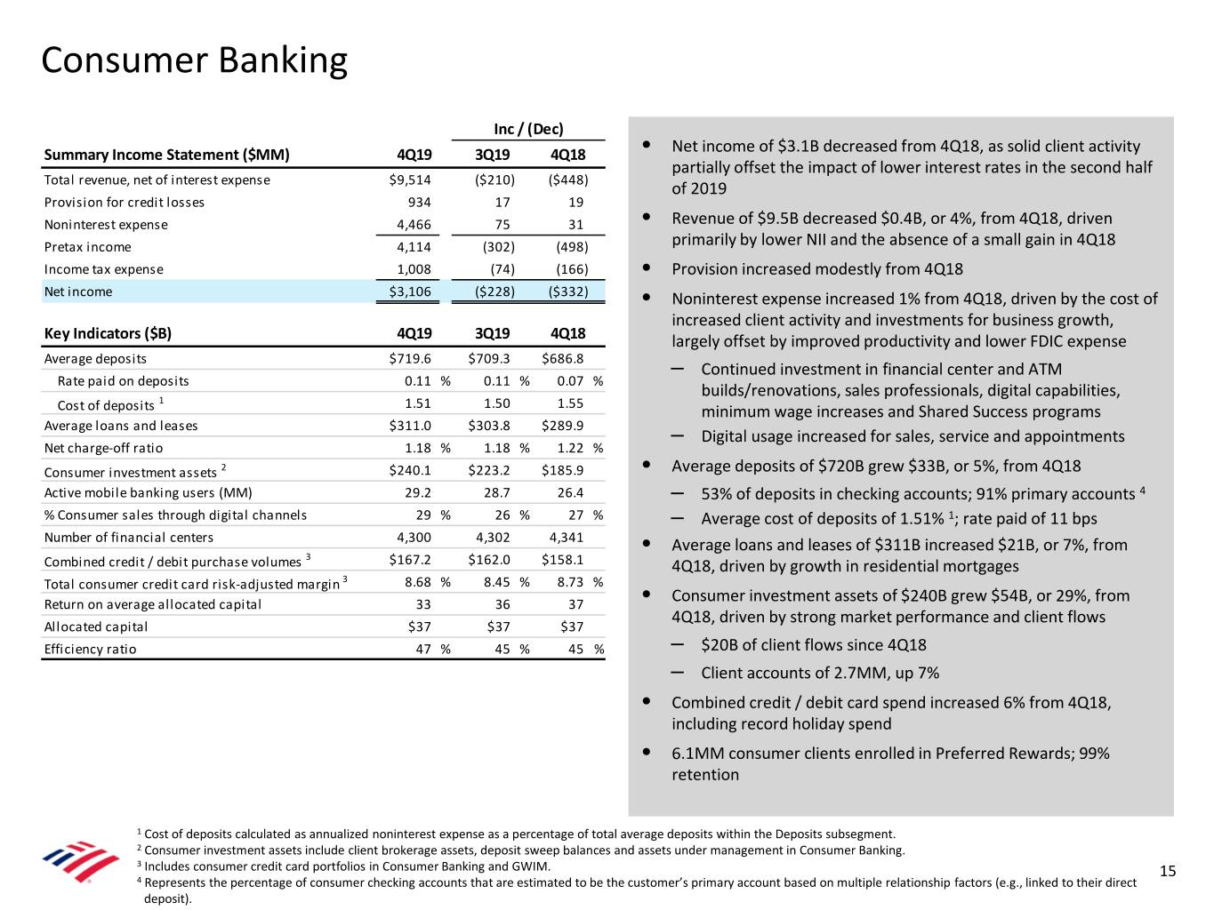 Asset Quality – Consumer and Commercial Portfolios Consumer Net Charge-offs ($MM) Consumer Metrics ($MM) 4Q19 3Q19 4Q18 $1,000 $835 $838 1.5% Provision $798 $564 $734 $804 $691 $800 $622 Nonperforming loans and leases 2,053 2,189 3,842 1 $600 1.0% % of loans and leases 0.44 % 0.48 % 0.86 % Consumer 30+ days performing past due $5,776 $5,530 $6,741 $400 0.71% 0.77% 0.72% 0.62% Fully-insured 2 1,811 1,919 2,790 $200 0.55% 0.5% Non fully-insured 3,965 3,611 3,951 $0 Allowance for loans and leases 4,542 4,576 4,802 4Q18 1Q19 2Q19 3Q19 4Q19 ($200) 0.0% % of loans and leases 1 0.98 % 1.01 % 1.08 % Credit card Other Consumer NCO ratio # times annualized NCOs 1.37 x 1.86 x 1.51 x Commercial Net Charge-offs ($MM) Commercial Metrics ($MM) 4Q19 3Q19 4Q18 $196 $189 $200 0.3% Provision $143 $215 $171 $156 Reservable criticized utilized exposure 11,452 11,835 11,061 $150 $120 $121 0.2% Nonperforming loans and leases 1,499 1,287 1,102 $100 0.16% 0.15% % of loans and leases 1 0.29 % 0.25 % 0.22 % 0.13% 0.10% 0.09% 0.1% Allowance for loans and leases $4,874 $4,857 $4,799 $50 % of loans and leases 1 0.96 % 0.95 % 0.97 % $0 0.0% 4Q18 1Q19 2Q19 3Q19 4Q19 C&I Small business and other Commercial NCO ratio 1 Excludes loans measured at fair value. 2 Fully-insured loans are FHA-insured loans and other loans individually insured under long-term standby agreements. 14