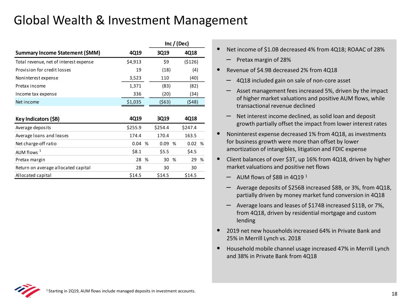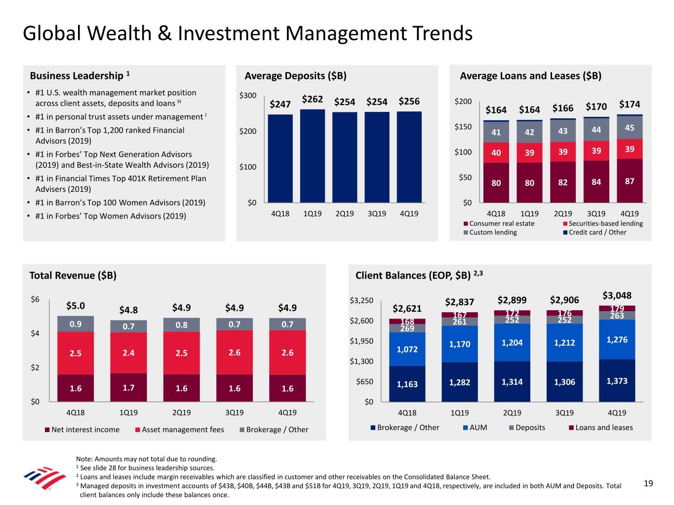 Global Wealth & Investment Management Inc / (Dec) Net income of $1.0B decreased 4% from 4Q18; ROAAC of 28% Summary Income Statement ($MM) 4Q19 3Q19 4Q18 • Total revenue, net of interest expense $4,913 $9 ($126) – Pretax margin of 28% Provision for credit losses 19 (18) (4) • Revenue of $4.9B decreased 2% from 4Q18 Noninterest expense 3,523 110 (40) – 4Q18 included gain on sale of non-core asset Pretax income 1,371 (83) (82) Income tax expense 336 (20) (34) – Asset management fees increased 5%, driven by the impact of higher market valuations and positive AUM flows, while Net income $1,035 ($63) ($48) transactional revenue declined Key Indicators ($B) 4Q19 3Q19 4Q18 – Net interest income declined, as solid loan and deposit growth partially offset the impact from lower interest rates Average deposits $255.9 $254.4 $247.4 Average loans and leases 174.4 170.4 163.5 • Noninterest expense decreased 1% from 4Q18, as investments Net charge-off ratio 0.04 % 0.09 % 0.02 % for business growth were more than offset by lower 1 amortization of intangibles, litigation and FDIC expense AUM flows $8.1 $5.5 $4.5 Pretax margin 28 % 30 % 29 % • Client balances of over $3T, up 16% from 4Q18, driven by higher Return on average allocated capital 28 30 30 market valuations and positive net flows Allocated capital $14.5 $14.5 $14.5 – AUM flows of $8B in 4Q19 1 – Average deposits of $256B increased $8B, or 3%, from 4Q18, partially driven by money market fund conversion in 4Q18 – Average loans and leases of $174B increased $11B, or 7%, from 4Q18, driven by residential mortgage and custom lending • 2019 net new households increased 64% in Private Bank and 25% in Merrill Lynch vs. 2018 • Household mobile channel usage increased 47% in Merrill Lynch and 38% in Private Bank from 4Q18 1 Starting in 2Q19, AUM flows include managed deposits in investment accounts. 18