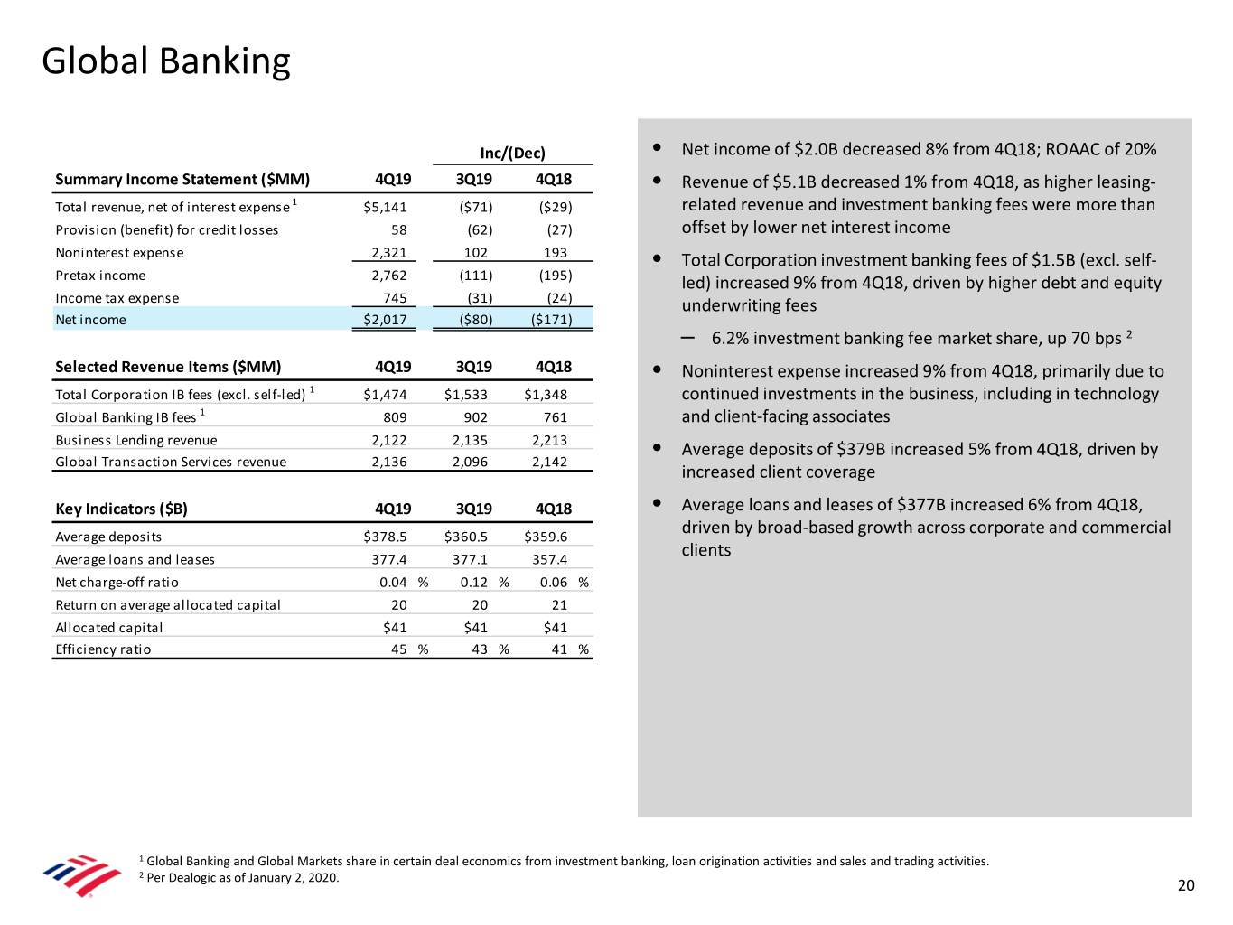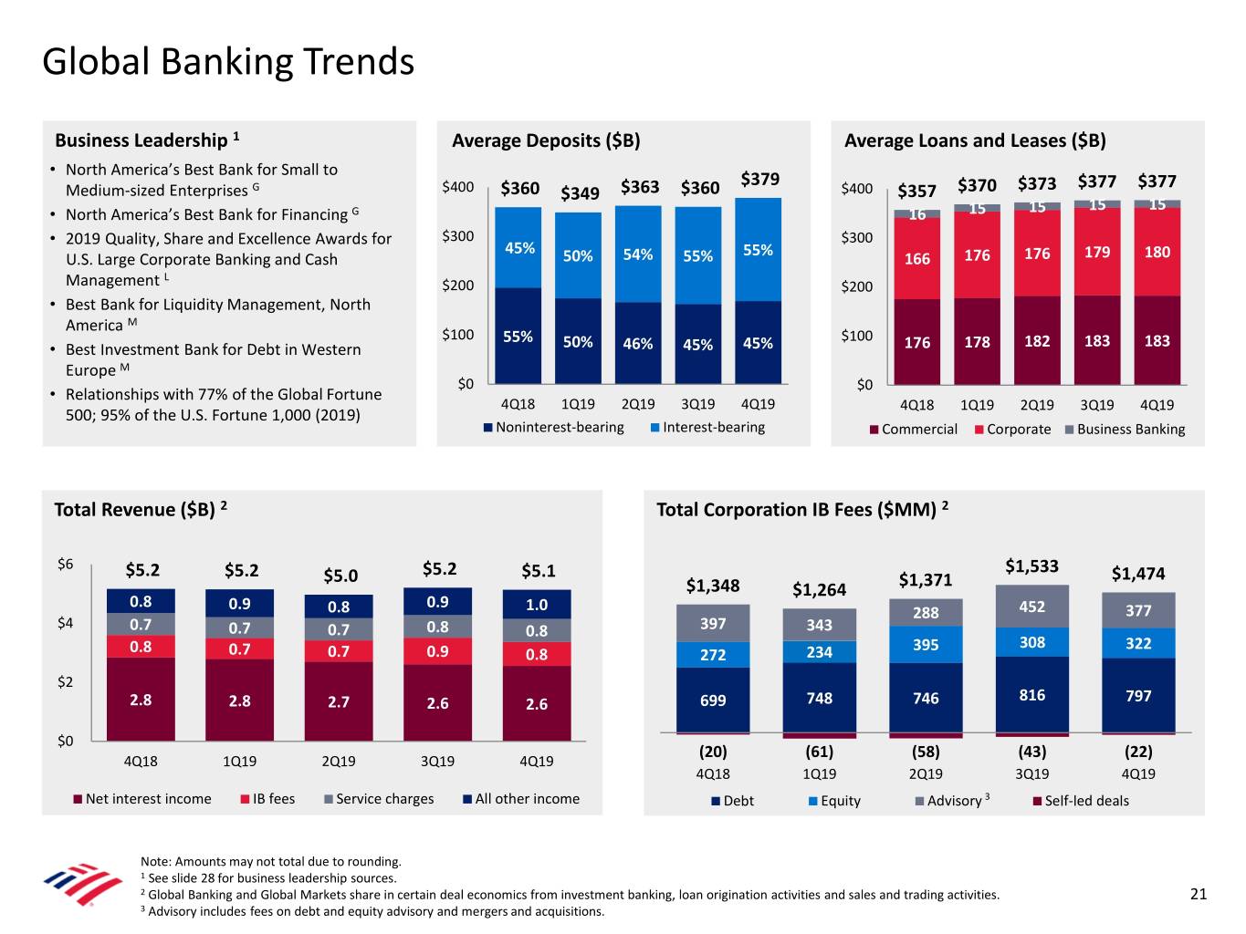 Global Banking Inc/(Dec) • Net income of $2.0B decreased 8% from 4Q18; ROAAC of 20% Summary Income Statement ($MM) 4Q19 3Q19 4Q18 • Revenue of $5.1B decreased 1% from 4Q18, as higher leasing- Total revenue, net of interest expense 1 $5,141 ($71) ($29) related revenue and investment banking fees were more than Provision (benefit) for credit losses 58 (62) (27) offset by lower net interest income Noninterest expense 2,321 102 193 • Total Corporation investment banking fees of $1.5B (excl. self- Pretax income 2,762 (111) (195) led) increased 9% from 4Q18, driven by higher debt and equity Income tax expense 745 (31) (24) underwriting fees Net income $2,017 ($80) ($171) – 6.2% investment banking fee market share, up 70 bps 2 Selected Revenue Items ($MM) 4Q19 3Q19 4Q18 • Noninterest expense increased 9% from 4Q18, primarily due to Total Corporation IB fees (excl. self-led) 1 $1,474 $1,533 $1,348 continued investments in the business, including in technology Global Banking IB fees 1 809 902 761 and client-facing associates Business Lending revenue 2,122 2,135 2,213 • Average deposits of $379B increased 5% from 4Q18, driven by Global Transaction Services revenue 2,136 2,096 2,142 increased client coverage Key Indicators ($B) 4Q19 3Q19 4Q18 • Average loans and leases of $377B increased 6% from 4Q18, Average deposits $378.5 $360.5 $359.6 driven by broad-based growth across corporate and commercial Average loans and leases 377.4 377.1 357.4 clients Net charge-off ratio 0.04 % 0.12 % 0.06 % Return on average allocated capital 20 20 21 Allocated capital $41 $41 $41 Efficiency ratio 45 % 43 % 41 % 1 Global Banking and Global Markets share in certain deal economics from investment banking, loan origination activities and sales and trading activities. 2 Per Dealogic as of January 2, 2020. 20