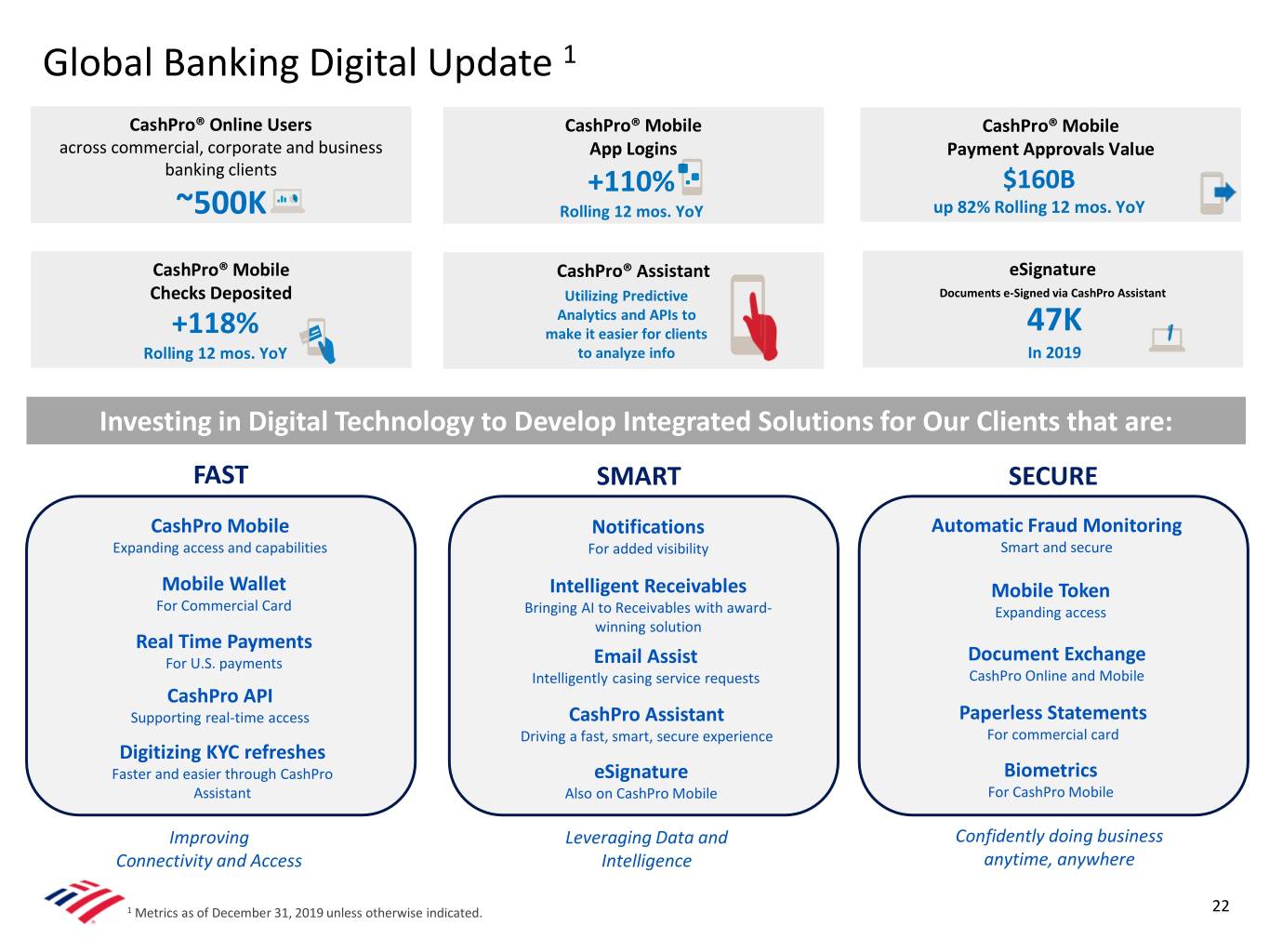 Global Banking Digital Update 1 CashPro® Online Users CashPro® Mobile CashPro® Mobile across commercial, corporate and business App Logins Payment Approvals Value banking clients +110% $160B ~500K Rolling 12 mos. YoY up 82% Rolling 12 mos. YoY CashPro® Mobile CashPro® Assistant eSignature Checks Deposited Utilizing Predictive Documents e-Signed via CashPro Assistant Analytics and APIs to +118% make it easier for clients 47K Rolling 12 mos. YoY to analyze info In 2019 Investing in Digital Technology to Develop Integrated Solutions for Our Clients that are: FAST SMART SECURE CashPro Mobile Notifications Automatic Fraud Monitoring Expanding access and capabilities For added visibility Smart and secure Mobile Wallet Intelligent Receivables Mobile Token For Commercial Card Bringing AI to Receivables with award- Expanding access winning solution Real Time Payments For U.S. payments Email Assist Document Exchange Intelligently casing service requests CashPro Online and Mobile CashPro API Supporting real-time access CashPro Assistant Paperless Statements Driving a fast, smart, secure experience For commercial card Digitizing KYC refreshes Faster and easier through CashPro eSignature Biometrics Assistant Also on CashPro Mobile For CashPro Mobile Improving Leveraging Data and Confidently doing business Connectivity and Access Intelligence anytime, anywhere 1 Metrics as of December 31, 2019 unless otherwise indicated. 22