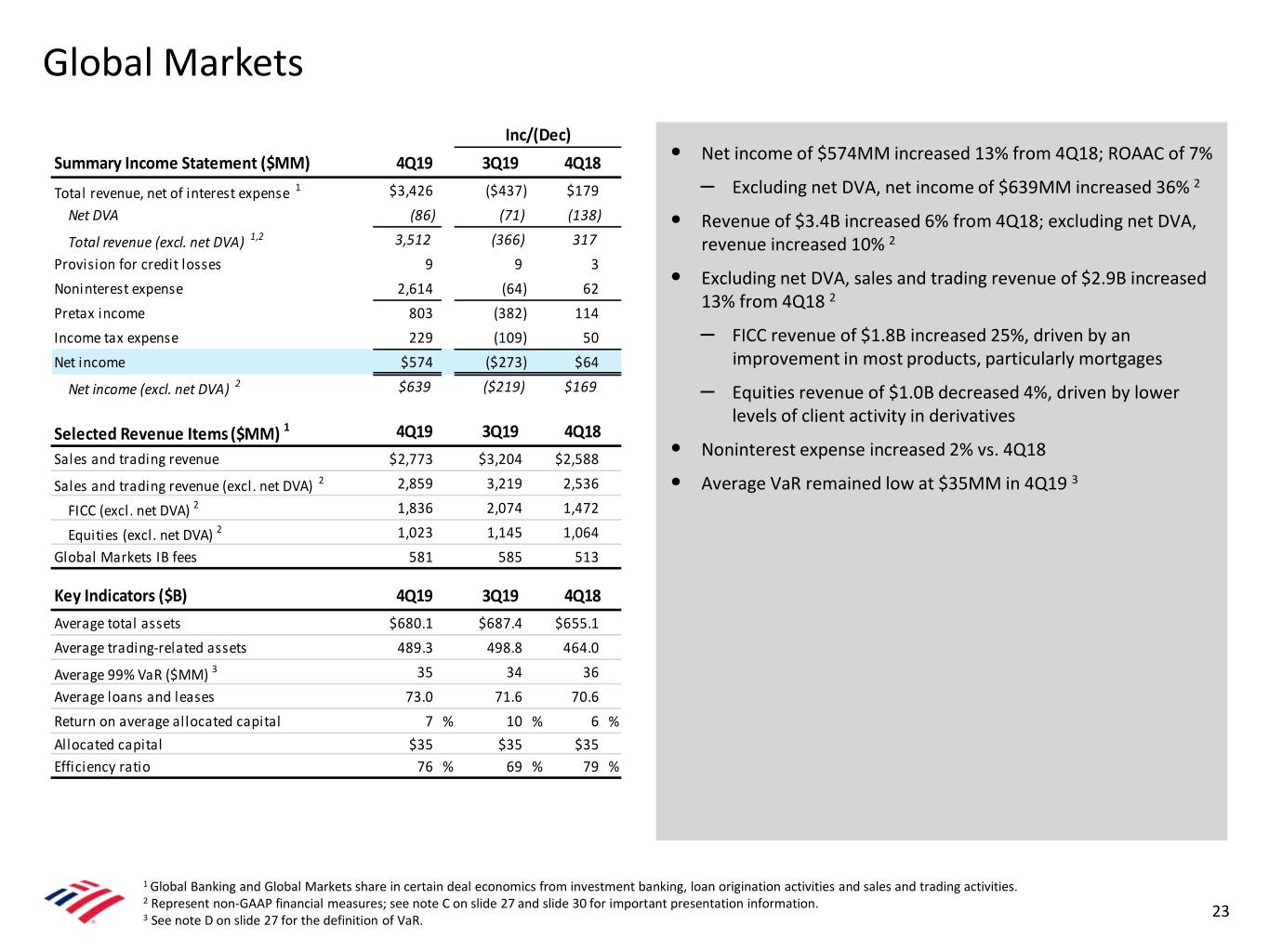 Global Markets Inc/(Dec) Net income of $574MM increased 13% from 4Q18; ROAAC of 7% Summary Income Statement ($MM) 4Q19 3Q19 4Q18 • • [ Bullets to come ] 2 Total revenue, net of interest expense 1 $3,426 ($437) $179 – Excluding net DVA, net income of $639MM increased 36% Net DVA (86) (71) (138) • Revenue of $3.4B increased 6% from 4Q18; excluding net DVA, Total revenue (excl. net DVA) 1,2 3,512 (366) 317 revenue increased 10% 2 Provision for credit losses 9 9 3 Excluding net DVA, sales and trading revenue of $2.9B increased Noninterest expense 2,614 (64) 62 • 13% from 4Q18 2 Pretax income 803 (382) 114 Income tax expense 229 (109) 50 – FICC revenue of $1.8B increased 25%, driven by an Net income $574 ($273) $64 improvement in most products, particularly mortgages 2 Net income (excl. net DVA) $639 ($219) $169 – Equities revenue of $1.0B decreased 4%, driven by lower levels of client activity in derivatives Selected Revenue Items ($MM) 1 4Q19 3Q19 4Q18 Sales and trading revenue $2,773 $3,204 $2,588 • Noninterest expense increased 2% vs. 4Q18 Sales and trading revenue (excl. net DVA) 2 2,859 3,219 2,536 • Average VaR remained low at $35MM in 4Q19 3 FICC (excl. net DVA) 2 1,836 2,074 1,472 Equities (excl. net DVA) 2 1,023 1,145 1,064 Global Markets IB fees 581 585 513 Key Indicators ($B) 4Q19 3Q19 4Q18 Average total assets $680.1 $687.4 $655.1 Average trading-related assets 489.3 498.8 464.0 Average 99% VaR ($MM) 3 35 34 36 Average loans and leases 73.0 71.6 70.6 Return on average allocated capital 7 % 10 % 6 % Allocated capital $35 $35 $35 Efficiency ratio 76 % 69 % 79 % 1 Global Banking and Global Markets share in certain deal economics from investment banking, loan origination activities and sales and trading activities. 2 Represent non-GAAP financial measures; see note C on slide 27 and slide 30 for important presentation information. 23 3 See note D on slide 27 for the definition of VaR.