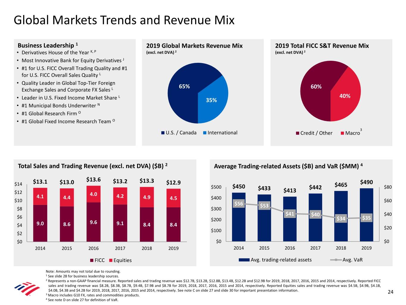 Global Markets Trends and Revenue Mix Business Leadership 1 2019 Global Markets Revenue Mix 2019 Total FICC S&T Revenue Mix • Derivatives House of the Year K, P (excl. net DVA) 2 (excl. net DVA) 2 • Most Innovative Bank for Equity Derivatives J • #1 for U.S. FICC Overall Trading Quality and #1 for U.S. FICC Overall Sales Quality L • Quality Leader in Global Top-Tier Foreign 65% Exchange Sales and Corporate FX Sales L 60% L 40% • Leader in U.S. Fixed Income Market Share 35% • #1 Municipal Bonds Underwriter N • #1 Global Research Firm O • #1 Global Fixed Income Research Team O 3 U.S. / Canada International Credit / Other Macro Total Sales and Trading Revenue (excl. net DVA) ($B) 2 Average Trading-related Assets ($B) and VaR ($MM) 4 $13.6 $14 $13.1 $13.0 $13.2 $13.3 $12.9 $490 $500 $450 $442 $465 $80 $433 $413 $12 4.0 4.1 4.4 4.2 4.9 $400 $10 4.5 $60 $56 $53 $8 $300 $41 $40 $6 $40 $200 $34 $35 $4 9.0 8.6 9.6 9.1 8.4 8.4 $20 $100 $2 $0 $0 $0 2014 2015 2016 2017 2018 2019 2014 2015 2016 2017 2018 2019 FICC Equities Avg. trading-related assets Avg. VaR Note: Amounts may not total due to rounding. 1 See slide 28 for business leadership sources. 2 Represents a non-GAAP financial measure. Reported sales and trading revenue was $12.7B, $13.2B, $12.8B, $13.4B, $12.2B and $12.9B for 2019, 2018, 2017, 2016, 2015 and 2014, respectively. Reported FICC sales and trading revenue was $8.2B, $8.3B, $8.7B, $9.4B, $7.9B and $8.7B for 2019, 2018, 2017, 2016, 2015 and 2014, respectively. Reported Equities sales and trading revenue was $4.5B, $4.9B, $4.1B, $4.0B, $4.3B and $4.2B for 2019, 2018, 2017, 2016, 2015 and 2014, respectively. See note C on slide 27 and slide 30 for important presentation information. 24 3 Macro includes G10 FX, rates and commodities products. 4 See note D on slide 27 for definition of VaR.