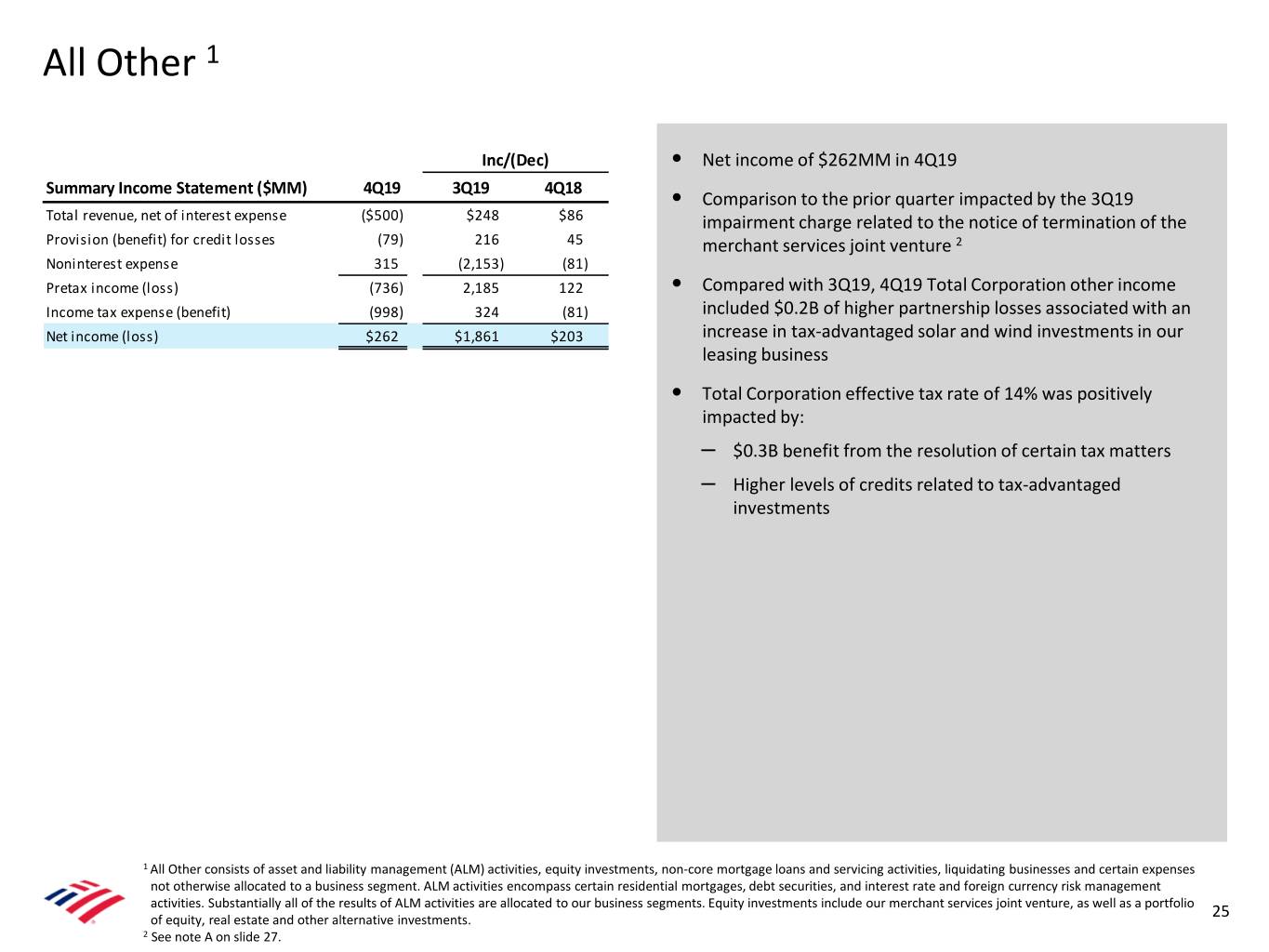 All Other 1 Inc/(Dec) • Net income of $262MM in 4Q19 Summary Income Statement ($MM) 4Q19 3Q19 4Q18 • Comparison to the prior quarter impacted by the 3Q19 Total revenue, net of interest expense ($500) $248 $86 impairment charge related to the notice of termination of the Provision (benefit) for credit losses (79) 216 45 merchant services joint venture 2 Noninterest expense 315 (2,153) (81) Pretax income (loss) (736) 2,185 122 • Compared with 3Q19, 4Q19 Total Corporation other income Income tax expense (benefit) (998) 324 (81) included $0.2B of higher partnership losses associated with an Net income (loss) $262 $1,861 $203 increase in tax-advantaged solar and wind investments in our leasing business • Total Corporation effective tax rate of 14% was positively impacted by: – $0.3B benefit from the resolution of certain tax matters – Higher levels of credits related to tax-advantaged investments 1 All Other consists of asset and liability management (ALM) activities, equity investments, non-core mortgage loans and servicing activities, liquidating businesses and certain expenses not otherwise allocated to a business segment. ALM activities encompass certain residential mortgages, debt securities, and interest rate and foreign currency risk management activities. Substantially all of the results of ALM activities are allocated to our business segments. Equity investments include our merchant services joint venture, as well as a portfolio of equity, real estate and other alternative investments. 25 2 See note A on slide 27.