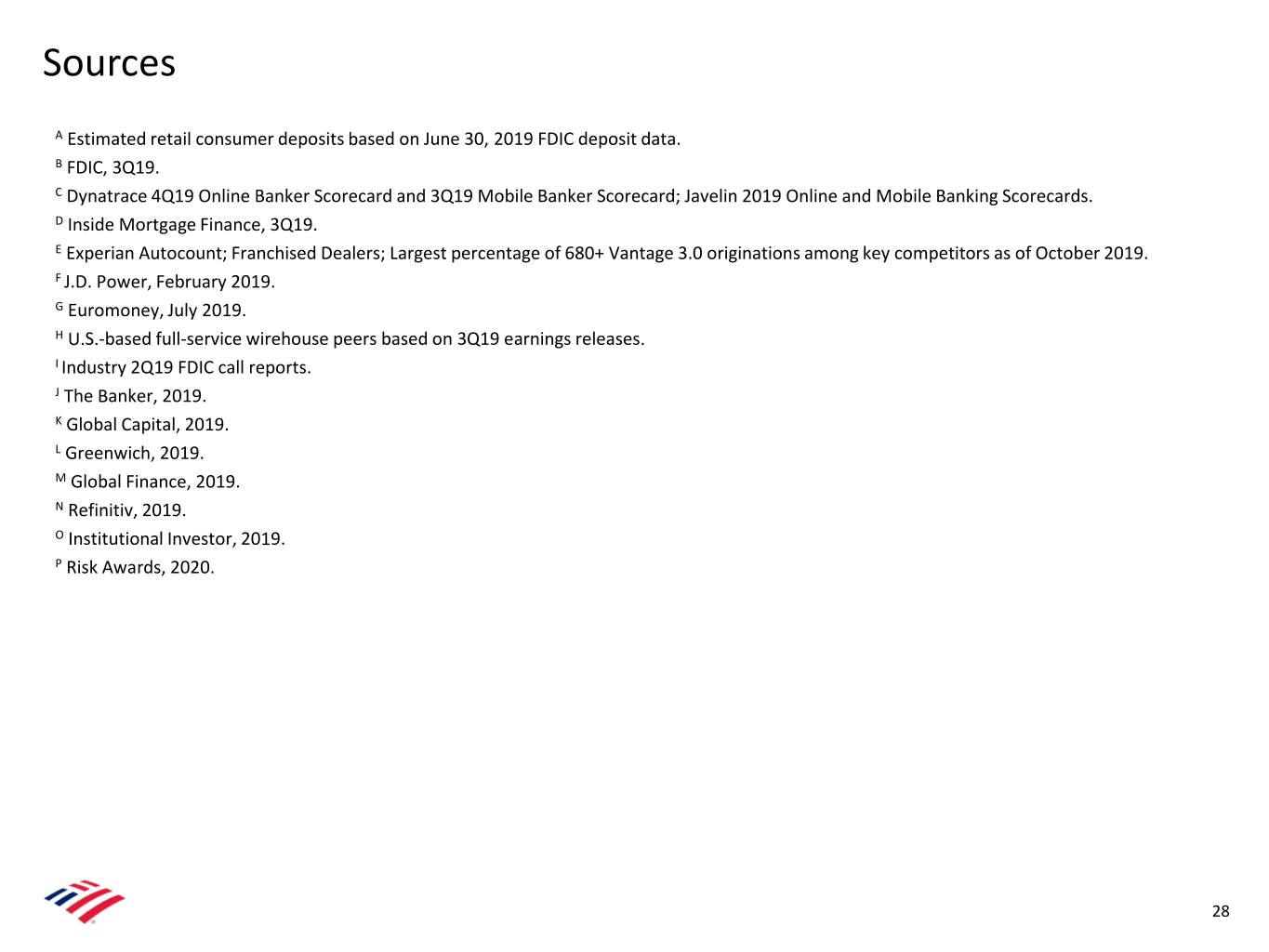 Sources A Estimated retail consumer deposits based on June 30, 2019 FDIC deposit data. B FDIC, 3Q19. C Dynatrace 4Q19 Online Banker Scorecard and 3Q19 Mobile Banker Scorecard; Javelin 2019 Online and Mobile Banking Scorecards. D Inside Mortgage Finance, 3Q19. E Experian Autocount; Franchised Dealers; Largest percentage of 680+ Vantage 3.0 originations among key competitors as of October 2019. F J.D. Power, February 2019. G Euromoney, July 2019. H U.S.-based full-service wirehouse peers based on 3Q19 earnings releases. I Industry 2Q19 FDIC call reports. J The Banker, 2019. K Global Capital, 2019. L Greenwich, 2019. M Global Finance, 2019. N Refinitiv, 2019. O Institutional Investor, 2019. P Risk Awards, 2020. 28