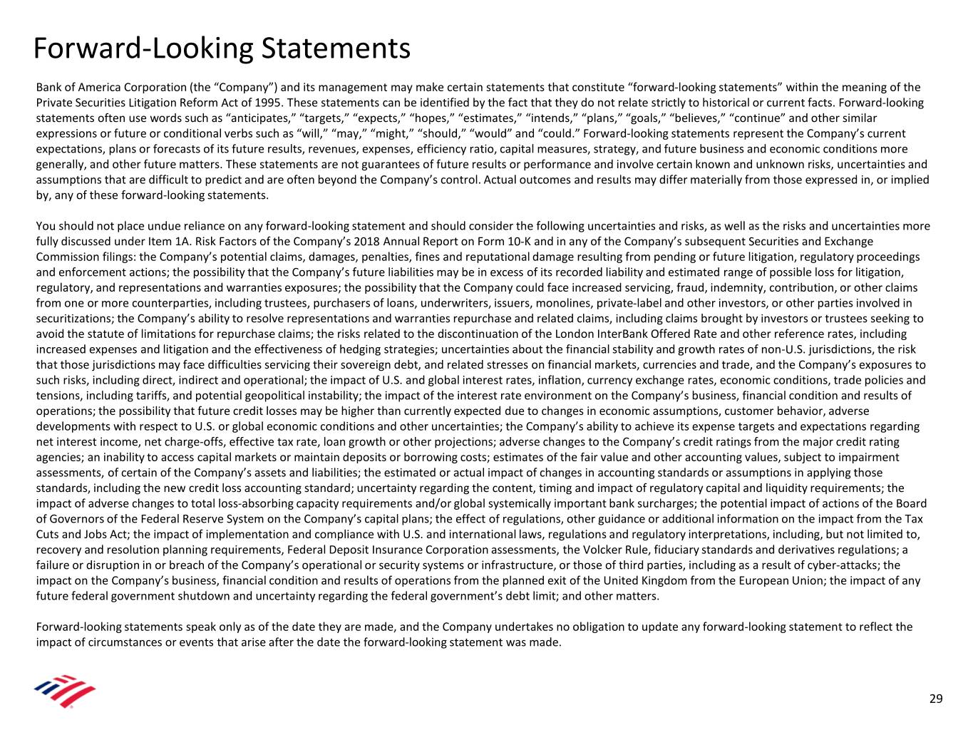 Forward-Looking Statements Bank of America Corporation (the “Company”) and its management may make certain statements that constitute “forward-looking statements” within the meaning of the Private Securities Litigation Reform Act of 1995. These statements can be identified by the fact that they do not relate strictly to historical or current facts. Forward-looking statements often use words such as “anticipates,” “targets,” “expects,” “hopes,” “estimates,” “intends,” “plans,” “goals,” “believes,” “continue” and other similar expressions or future or conditional verbs such as “will,” “may,” “might,” “should,” “would” and “could.” Forward-looking statements represent the Company’s current expectations, plans or forecasts of its future results, revenues, expenses, efficiency ratio, capital measures, strategy, and future business and economic conditions more generally, and other future matters. These statements are not guarantees of future results or performance and involve certain known and unknown risks, uncertainties and assumptions that are difficult to predict and are often beyond the Company’s control. Actual outcomes and results may differ materially from those expressed in, or implied by, any of these forward-looking statements. You should not place undue reliance on any forward-looking statement and should consider the following uncertainties and risks, as well as the risks and uncertainties more fully discussed under Item 1A. Risk Factors of the Company’s 2018 Annual Report on Form 10-K and in any of the Company’s subsequent Securities and Exchange Commission filings: the Company’s potential claims, damages, penalties, fines and reputational damage resulting from pending or future litigation, regulatory proceedings and enforcement actions; the possibility that the Company’s future liabilities may be in excess of its recorded liability and estimated range of possible loss for litigation, regulatory, and representations and warranties exposures; the possibility that the Company could face increased servicing, fraud, indemnity, contribution, or other claims from one or more counterparties, including trustees, purchasers of loans, underwriters, issuers, monolines, private-label and other investors, or other parties involved in securitizations; the Company’s ability to resolve representations and warranties repurchase and related claims, including claims brought by investors or trustees seeking to avoid the statute of limitations for repurchase claims; the risks related to the discontinuation of the London InterBank Offered Rate and other reference rates, including increased expenses and litigation and the effectiveness of hedging strategies; uncertainties about the financial stability and growth rates of non-U.S. jurisdictions, the risk that those jurisdictions may face difficulties servicing their sovereign debt, and related stresses on financial markets, currencies and trade, and the Company’s exposures to such risks, including direct, indirect and operational; the impact of U.S. and global interest rates, inflation, currency exchange rates, economic conditions, trade policies and tensions, including tariffs, and potential geopolitical instability; the impact of the interest rate environment on the Company’s business, financial condition and results of operations; the possibility that future credit losses may be higher than currently expected due to changes in economic assumptions, customer behavior, adverse developments with respect to U.S. or global economic conditions and other uncertainties; the Company’s ability to achieve its expense targets and expectations regarding net interest income, net charge-offs, effective tax rate, loan growth or other projections; adverse changes to the Company’s credit ratings from the major credit rating agencies; an inability to access capital markets or maintain deposits or borrowing costs; estimates of the fair value and other accounting values, subject to impairment assessments, of certain of the Company’s assets and liabilities; the estimated or actual impact of changes in accounting standards or assumptions in applying those standards, including the new credit loss accounting standard; uncertainty regarding the content, timing and impact of regulatory capital and liquidity requirements; the impact of adverse changes to total loss-absorbing capacity requirements and/or global systemically important bank surcharges; the potential impact of actions of the Board of Governors of the Federal Reserve System on the Company’s capital plans; the effect of regulations, other guidance or additional information on the impact from the Tax Cuts and Jobs Act; the impact of implementation and compliance with U.S. and international laws, regulations and regulatory interpretations, including, but not limited to, recovery and resolution planning requirements, Federal Deposit Insurance Corporation assessments, the Volcker Rule, fiduciary standards and derivatives regulations; a failure or disruption in or breach of the Company’s operational or security systems or infrastructure, or those of third parties, including as a result of cyber-attacks; the impact on the Company’s business, financial condition and results of operations from the planned exit of the United Kingdom from the European Union; the impact of any future federal government shutdown and uncertainty regarding the federal government’s debt limit; and other matters. Forward-looking statements speak only as of the date they are made, and the Company undertakes no obligation to update any forward-looking statement to reflect the impact of circumstances or events that arise after the date the forward-looking statement was made. 29
