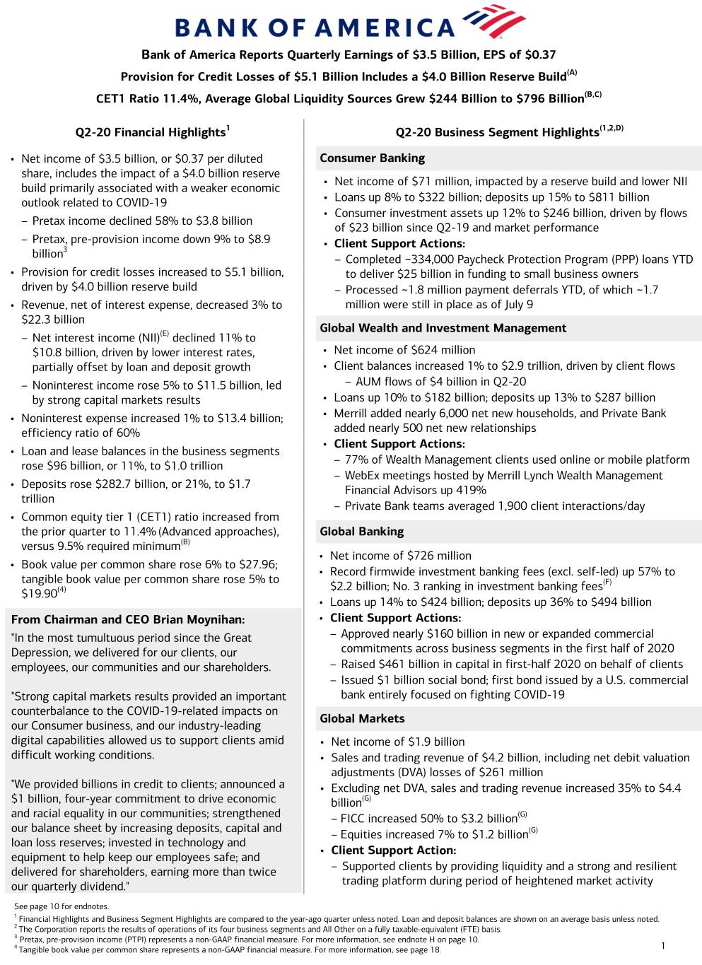 Bank of America Reports Quarterly Earnings of $3.5 Billion, EPS of $0.37 Provision for Credit Losses of $5.1 Billion Includes a $4.0 Billion Reserve Build(A) CET1 Ratio 11.4%, Average Global Liquidity Sources Grew $244 Billion to $796 Billion(B,C) Q2-20 Financial Highlights1 Q2-20 Business Segment Highlights(1,2,D) • Net income of $3.5 billion, or $0.37 per diluted Consumer Banking share, includes the impact of a $4.0 billion reserve • Net income of $71 million, impacted by a reserve build and lower NII build primarily associated with a weaker economic outlook related to COVID-19 • Loans up 8% to $322 billion; deposits up 15% to $811 billion • Consumer investment assets up 12% to $246 billion, driven by flows – Pretax income declined 58% to $3.8 billion of $23 billion since Q2-19 and market performance – Pretax, pre-provision income down 9% to $8.9 3 • Client Support Actions: billion – Completed ~334,000 Paycheck Protection Program (PPP) loans YTD • Provision for credit losses increased to $5.1 billion, to deliver $25 billion in funding to small business owners driven by $4.0 billion reserve build – Processed ~1.8 million payment deferrals YTD, of which ~1.7 • Revenue, net of interest expense, decreased 3% to million were still in place as of July 9 $22.3 billion Global Wealth and Investment Management – Net interest income (NII)(E) declined 11% to $10.8 billion, driven by lower interest rates, • Net income of $624 million partially offset by loan and deposit growth • Client balances increased 1% to $2.9 trillion, driven by client flows – Noninterest income rose 5% to $11.5 billion, led – AUM flows of $4 billion in Q2-20 by strong capital markets results • Loans up 10% to $182 billion; deposits up 13% to $287 billion • Noninterest expense increased 1% to $13.4 billion; • Merrill added nearly 6,000 net new households, and Private Bank efficiency ratio of 60% added nearly 500 net new relationships • Client Support Actions: • Loan and lease balances in the business segments – 77% of Wealth Management clients used online or mobile platform rose $96 billion, or 11%, to $1.0 trillion – WebEx meetings hosted by Merrill Lynch Wealth Management • Deposits rose $282.7 billion, or 21%, to $1.7 Financial Advisors up 419% trillion – Private Bank teams averaged 1,900 client interactions/day • Common equity tier 1 (CET1) ratio increased from the prior quarter to 11.4% (Advanced approaches), Global Banking versus 9.5% required minimum(B) • Net income of $726 million • Book value per common share rose 6% to $27.96; • Record firmwide investment banking fees (excl. self-led) up 57% to tangible book value per common share rose 5% to $2.2 billion; No. 3 ranking in investment banking fees(F) $19.90(4) • Loans up 14% to $424 billion; deposits up 36% to $494 billion From Chairman and CEO Brian Moynihan: • Client Support Actions: "In the most tumultuous period since the Great – Approved nearly $160 billion in new or expanded commercial Depression, we delivered for our clients, our commitments across business segments in the first half of 2020 employees, our communities and our shareholders. – Raised $461 billion in capital in first-half 2020 on behalf of clients – Issued $1 billion social bond; first bond issued by a U.S. commercial "Strong capital markets results provided an important bank entirely focused on fighting COVID-19 counterbalance to the COVID-19-related impacts on Global Markets our Consumer business, and our industry-leading digital capabilities allowed us to support clients amid • Net income of $1.9 billion difficult working conditions. • Sales and trading revenue of $4.2 billion, including net debit valuation adjustments (DVA) losses of $261 million "We provided billions in credit to clients; announced a • Excluding net DVA, sales and trading revenue increased 35% to $4.4 $1 billion, four-year commitment to drive economic billion(G) and racial equality in our communities; strengthened – FICC increased 50% to $3.2 billion(G) our balance sheet by increasing deposits, capital and (G) – Equities increased 7% to $1.2 billion loan loss reserves; invested in technology and • Client Support Action: equipment to help keep our employees safe; and delivered for shareholders, earning more than twice – Supported clients by providing liquidity and a strong and resilient our quarterly dividend." trading platform during period of heightened market activity See page 10 for endnotes. 1 Financial Highlights and Business Segment Highlights are compared to the year-ago quarter unless noted. Loan and deposit balances are shown on an average basis unless noted. 2 The Corporation reports the results of operations of its four business segments and All Other on a fully taxable-equivalent (FTE) basis. 3 Pretax, pre-provision income (PTPI) represents a non-GAAP financial measure. For more information, see endnote H on page 10. 4 Tangible book value per common share represents a non-GAAP financial measure. For more information, see page 18. 1