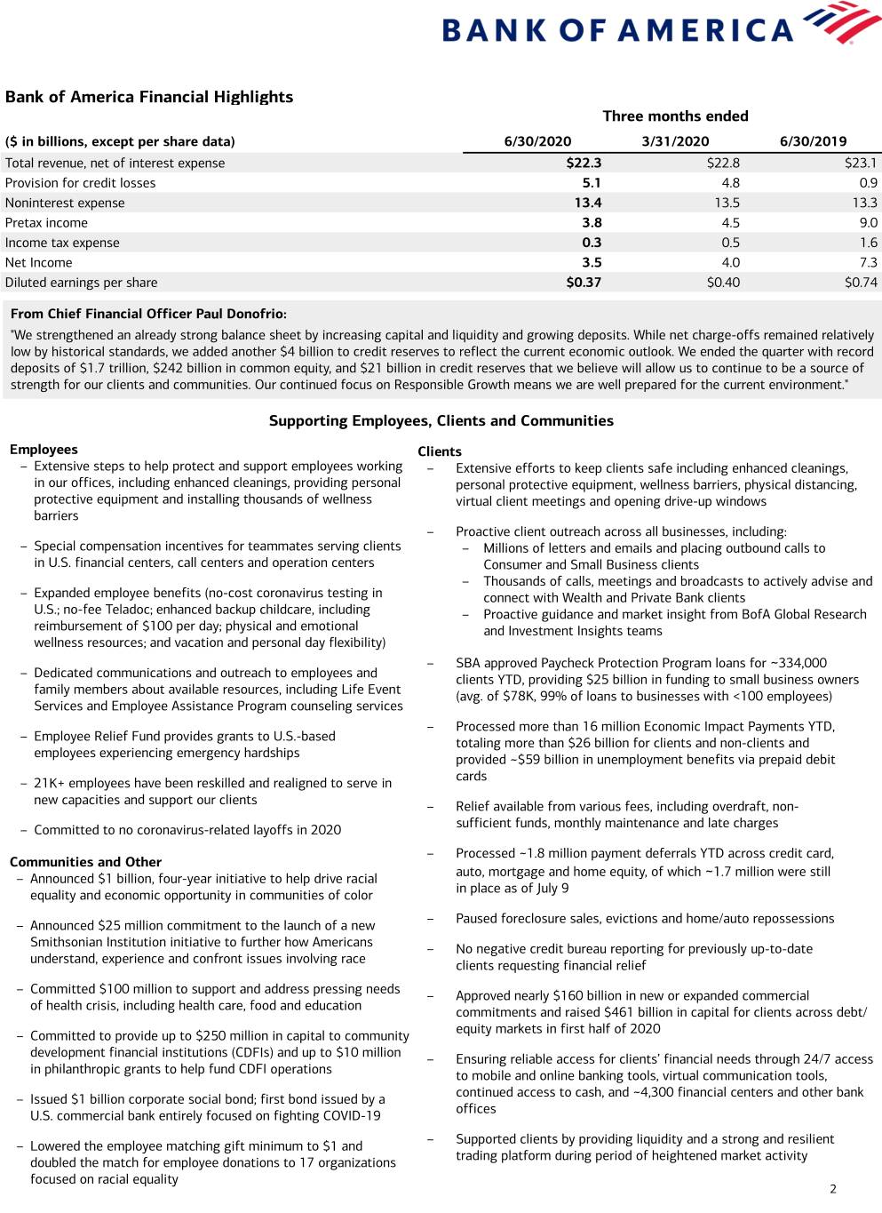 Bank of America Financial Highlights Three months ended ($ in billions, except per share data) 6/30/2020 3/31/2020 6/30/2019 Total revenue, net of interest expense $22.3 $22.8 $23.1 Provision for credit losses 5.1 4.8 0.9 Noninterest expense 13.4 13.5 13.3 Pretax income 3.8 4.5 9.0 Income tax expense 0.3 0.5 1.6 Net Income 3.5 4.0 7.3 Diluted earnings per share $0.37 $0.40 $0.74 From Chief Financial Officer Paul Donofrio: "We strengthened an already strong balance sheet by increasing capital and liquidity and growing deposits. While net charge-offs remained relatively low by historical standards, we added another $4 billion to credit reserves to reflect the current economic outlook. We ended the quarter with record deposits of $1.7 trillion, $242 billion in common equity, and $21 billion in credit reserves that we believe will allow us to continue to be a source of strength for our clients and communities. Our continued focus on Responsible Growth means we are well prepared for the current environment." Supporting Employees, Clients and Communities Employees Clients – Extensive steps to help protect and support employees working – Extensive efforts to keep clients safe including enhanced cleanings, in our offices, including enhanced cleanings, providing personal personal protective equipment, wellness barriers, physical distancing, protective equipment and installing thousands of wellness virtual client meetings and opening drive-up windows barriers – Proactive client outreach across all businesses, including: – Special compensation incentives for teammates serving clients – Millions of letters and emails and placing outbound calls to in U.S. financial centers, call centers and operation centers Consumer and Small Business clients – Thousands of calls, meetings and broadcasts to actively advise and – Expanded employee benefits (no-cost coronavirus testing in connect with Wealth and Private Bank clients U.S.; no-fee Teladoc; enhanced backup childcare, including – Proactive guidance and market insight from BofA Global Research reimbursement of $100 per day; physical and emotional and Investment Insights teams wellness resources; and vacation and personal day flexibility) – SBA approved Paycheck Protection Program loans for ~334,000 – Dedicated communications and outreach to employees and clients YTD, providing $25 billion in funding to small business owners family members about available resources, including Life Event (avg. of $78K, 99% of loans to businesses with <100 employees) Services and Employee Assistance Program counseling services – Processed more than 16 million Economic Impact Payments YTD, – Employee Relief Fund provides grants to U.S.-based totaling more than $26 billion for clients and non-clients and employees experiencing emergency hardships provided ~$59 billion in unemployment benefits via prepaid debit cards – 21K+ employees have been reskilled and realigned to serve in new capacities and support our clients – Relief available from various fees, including overdraft, non- sufficient funds, monthly maintenance and late charges – Committed to no coronavirus-related layoffs in 2020 – Processed ~1.8 million payment deferrals YTD across credit card, Communities and Other auto, mortgage and home equity, of which 1.7 million were still – Announced $1 billion, four-year initiative to help drive racial ~ in place as of July 9 equality and economic opportunity in communities of color – Paused foreclosure sales, evictions and home/auto repossessions – Announced $25 million commitment to the launch of a new Smithsonian Institution initiative to further how Americans – No negative credit bureau reporting for previously up-to-date understand, experience and confront issues involving race clients requesting financial relief – Committed $100 million to support and address pressing needs – Approved nearly $160 billion in new or expanded commercial of health crisis, including health care, food and education commitments and raised $461 billion in capital for clients across debt/ equity markets in first half of 2020 – Committed to provide up to $250 million in capital to community development financial institutions (CDFIs) and up to $10 million – Ensuring reliable access for clients’ financial needs through 24/7 access in philanthropic grants to help fund CDFI operations to mobile and online banking tools, virtual communication tools, continued access to cash, and ~4,300 financial centers and other bank – Issued $1 billion corporate social bond; first bond issued by a offices U.S. commercial bank entirely focused on fighting COVID-19 – Supported clients by providing liquidity and a strong and resilient – Lowered the employee matching gift minimum to $1 and trading platform during period of heightened market activity doubled the match for employee donations to 17 organizations focused on racial equality 2