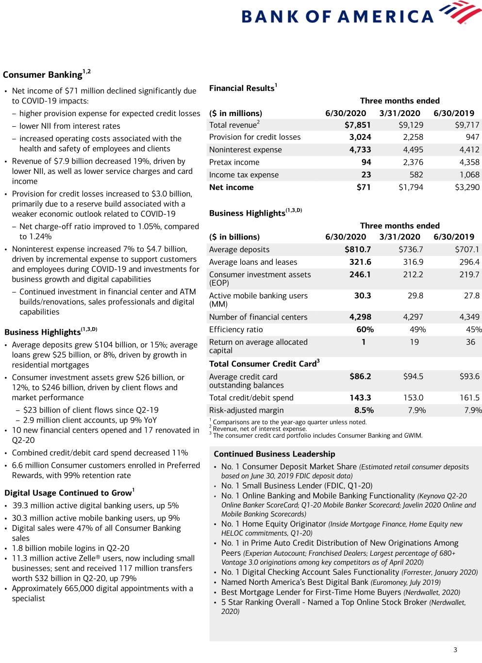 Consumer Banking1,2 1 • Net income of $71 million declined significantly due Financial Results to COVID-19 impacts: Three months ended – higher provision expense for expected credit losses ($ in millions) 6/30/2020 3/31/2020 6/30/2019 2 – lower NII from interest rates Total revenue $7,851 $9,129 $9,717 – increased operating costs associated with the Provision for credit losses 3,024 2,258 947 health and safety of employees and clients Noninterest expense 4,733 4,495 4,412 • Revenue of $7.9 billion decreased 19%, driven by Pretax income 94 2,376 4,358 lower NII, as well as lower service charges and card Income tax expense 23 582 1,068 income Net income $71 $1,794 $3,290 • Provision for credit losses increased to $3.0 billion, primarily due to a reserve build associated with a weaker economic outlook related to COVID-19 Business Highlights(1,3,D) – Net charge-off ratio improved to 1.05%, compared Three months ended to 1.24% ($ in billions) 6/30/2020 3/31/2020 6/30/2019 • Noninterest expense increased 7% to $4.7 billion, Average deposits $810.7 $736.7 $707.1 driven by incremental expense to support customers Average loans and leases 321.6 316.9 296.4 and employees during COVID-19 and investments for Consumer investment assets 246.1 212.2 219.7 business growth and digital capabilities (EOP) – Continued investment in financial center and ATM Active mobile banking users 30.3 29.8 27.8 builds/renovations, sales professionals and digital (MM) capabilities Number of financial centers 4,298 4,297 4,349 Business Highlights(1,3,D) Efficiency ratio 60% 49% 45% • Average deposits grew $104 billion, or 15%; average Return on average allocated 1 19 36 capital loans grew $25 billion, or 8%, driven by growth in 3 residential mortgages Total Consumer Credit Card • Consumer investment assets grew $26 billion, or Average credit card $86.2 $94.5 $93.6 12%, to $246 billion, driven by client flows and outstanding balances market performance Total credit/debit spend 143.3 153.0 161.5 – $23 billion of client flows since Q2-19 Risk-adjusted margin 8.5% 7.9% 7.9% – 2.9 million client accounts, up 9% YoY 1 Comparisons are to the year-ago quarter unless noted. • 10 new financial centers opened and 17 renovated in 2 Revenue, net of interest expense. 3 The consumer credit card portfolio includes Consumer Banking and GWIM. Q2-20 • Combined credit/debit card spend decreased 11% Continued Business Leadership • 6.6 million Consumer customers enrolled in Preferred • No. 1 Consumer Deposit Market Share (Estimated retail consumer deposits Rewards, with 99% retention rate based on June 30, 2019 FDIC deposit data) • 1 No. 1 Small Business Lender (FDIC, Q1-20) Digital Usage Continued to Grow • No. 1 Online Banking and Mobile Banking Functionality (Keynova Q2-20 • 39.3 million active digital banking users, up 5% Online Banker ScoreCard; Q1-20 Mobile Banker Scorecard; Javelin 2020 Online and • 30.3 million active mobile banking users, up 9% Mobile Banking Scorecards) • No. 1 Home Equity Originator (Inside Mortgage Finance, Home Equity new • Digital sales were 47% of all Consumer Banking HELOC commitments, Q1-20) sales • No. 1 in Prime Auto Credit Distribution of New Originations Among • 1.8 billion mobile logins in Q2-20 Peers (Experian Autocount; Franchised Dealers; Largest percentage of 680+ • 11.3 million active Zelle® users, now including small Vantage 3.0 originations among key competitors as of April 2020) businesses; sent and received 117 million transfers • No. 1 Digital Checking Account Sales Functionality (Forrester, January 2020) worth $32 billion in Q2-20, up 79% • Named North America’s Best Digital Bank (Euromoney, July 2019) • Approximately 665,000 digital appointments with a • Best Mortgage Lender for First-Time Home Buyers (Nerdwallet, 2020) specialist • 5 Star Ranking Overall - Named a Top Online Stock Broker (Nerdwallet, 2020) 3