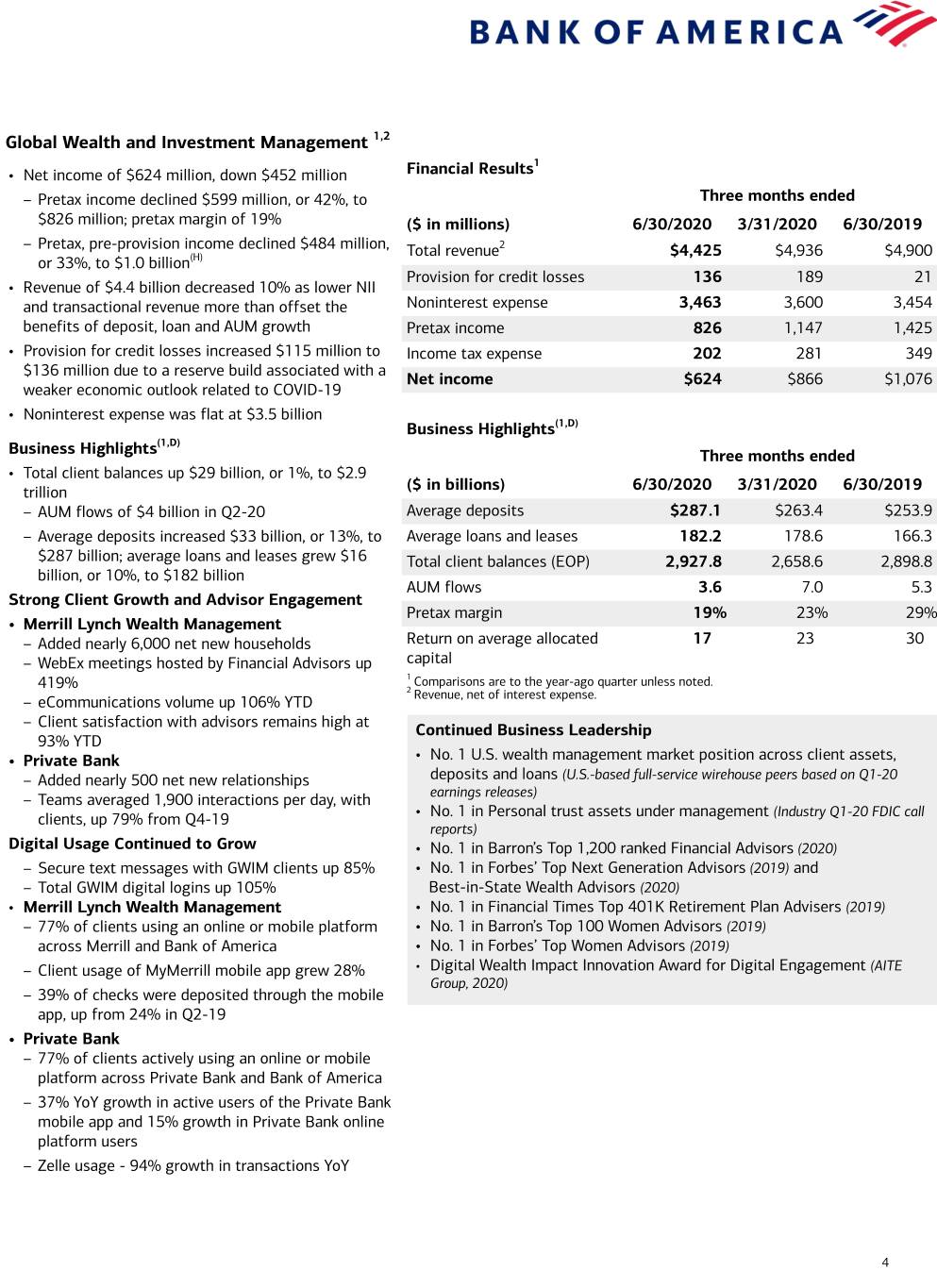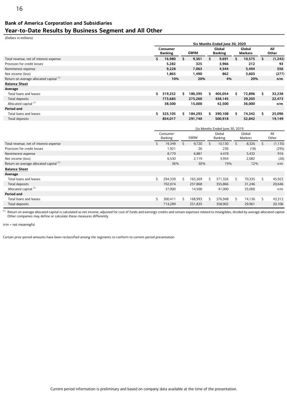15 Bank of America Corporation and Subsidiaries Quarterly Results by Business Segment and All Other (Dollars in millions) Second Quarter 2020 Consumer Global Global All Banking GWIM Banking Markets Other Total revenue, net of interest expense $ 7,851 $ 4,425 $ 5,091 $ 5,349 $ (262) Provision for credit losses 3,024 136 1,873 105 (21) Noninterest expense 4,733 3,463 2,223 2,682 309 Net income 71 624 726 1,896 216 Return on average allocated capital (1) 1% 17% 7% 21% n/m Balance Sheet Average Total loans and leases $ 321,558 $ 182,150 $ 423,625 $ 74,131 $ 29,923 Total deposits 810,700 287,109 493,918 45,083 21,387 Allocated capital (1) 38,500 15,000 42,500 36,000 n/m Quarter end Total loans and leases $ 325,105 $ 184,293 $ 390,108 $ 74,342 $ 25,096 Total deposits 854,017 291,740 500,918 52,842 19,149 First Quarter 2020 Consumer Global Global All Banking GWIM Banking Markets Other Total revenue, net of interest expense $ 9,129 $ 4,936 $ 4,600 $ 5,226 $ (980) Provision for credit losses 2,258 189 2,093 107 114 Noninterest expense 4,495 3,600 2,321 2,812 247 Net income (loss) 1,794 866 136 1,707 (493) Return on average allocated capital (1) 19% 23% 1% 19% n/m Balance Sheet Average Total loans and leases $ 316,946 $ 178,639 $ 386,483 $ 71,660 $ 36,555 Total deposits 736,669 263,411 382,373 33,323 23,560 Allocated capital (1) 38,500 15,000 42,500 36,000 n/m Quarter end Total loans and leases $ 317,535 $ 181,492 $ 437,122 $ 78,591 $ 36,045 Total deposits 762,387 282,395 477,108 38,536 22,899 Second Quarter 2019 Consumer Global Global All Banking GWIM Banking Markets Other Total revenue, net of interest expense $ 9,717 $ 4,900 $ 4,975 $ 4,144 $ (503) Provision for credit losses 947 21 125 5 (241) Noninterest expense 4,412 3,454 2,211 2,675 516 Net income 3,290 1,076 1,926 1,047 9 Return on average allocated capital (1) 36% 30% 19% 12% n/m Balance Sheet Average Total loans and leases $ 296,388 $ 166,324 $ 372,531 $ 70,587 $ 44,695 Total deposits 707,091 253,940 362,619 31,128 20,672 Allocated capital (1) 37,000 14,500 41,000 35,000 n/m Quarter end Total loans and leases $ 300,411 $ 168,993 $ 376,948 $ 74,136 $ 43,312 Total deposits 714,289 251,835 358,902 29,961 20,106 (1) Return on average allocated capital is calculated as net income, adjusted for cost of funds and earnings credits and certain expenses related to intangibles, divided by average allocated capital. Other companies may define or calculate these measures differently. n/m = not meaningful Certain prior-period amounts have been reclassified among the segments to conform to current-period presentation. The Company reports the results of operations of its four business segments and All Other on a fully taxable-equivalent (FTE) basis. Current period information is preliminary and based on company data available at the time of the presentation.