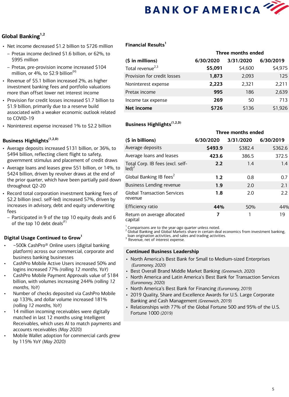Global Banking1,2 1 • Net income decreased $1.2 billion to $726 million Financial Results – Pretax income declined $1.6 billion, or 62%, to Three months ended $995 million ($ in millions) 6/30/2020 3/31/2020 6/30/2019 – Pretax, pre-provision income increased $104 Total revenue2,3 $5,091 $4,600 $4,975 million, or 4%, to $2.9 billion(H) Provision for credit losses 1,873 2,093 125 • Revenue of $5.1 billion increased 2%, as higher Noninterest expense 2,223 2,321 2,211 investment banking fees and portfolio valuations more than offset lower net interest income Pretax income 995 186 2,639 • Provision for credit losses increased $1.7 billion to Income tax expense 269 50 713 $1.9 billion, primarily due to a reserve build Net income $726 $136 $1,926 associated with a weaker economic outlook related to COVID-19 (1,2,D) • Noninterest expense increased 1% to $2.2 billion Business Highlights Three months ended Business Highlights(1,2,D) ($ in billions) 6/30/2020 3/31/2020 6/30/2019 • Average deposits increased $131 billion, or 36%, to Average deposits $493.9 $382.4 $362.6 $494 billion, reflecting client flight to safety, Average loans and leases 423.6 386.5 372.5 government stimulus and placement of credit draws Total Corp. IB fees (excl. self- 2.2 1.4 1.4 • Average loans and leases grew $51 billion, or 14%, to led)2 $424 billion, driven by revolver draws at the end of Global Banking IB fees2 the prior quarter, which have been partially paid down 1.2 0.8 0.7 throughout Q2-20 Business Lending revenue 1.9 2.0 2.1 • Record total corporation investment banking fees of Global Transaction Services 1.8 2.0 2.2 $2.2 billion (excl. self-led) increased 57%, driven by revenue increases in advisory, debt and equity underwriting Efficiency ratio 44% 50% 44% fees Return on average allocated 7 1 19 – Participated in 9 of the top 10 equity deals and 6 capital of the top 10 debt deals(F) 1 Comparisons are to the year-ago quarter unless noted. 2 Global Banking and Global Markets share in certain deal economics from investment banking, 1 loan origination activities, and sales and trading activities. Digital Usage Continued to Grow 3 Revenue, net of interest expense. • ~500k CashPro® Online users (digital banking platform) across our commercial, corporate and Continued Business Leadership business banking businesses • North America’s Best Bank for Small to Medium-sized Enterprises • CashPro Mobile Active Users increased 50% and (Euromoney, 2020) logins increased 77% (rolling 12 months, YoY) • Best Overall Brand Middle Market Banking (Greenwich, 2020) • CashPro Mobile Payment Approvals value of $184 • North America and Latin America's Best Bank for Transaction Services billion, with volumes increasing 244% (rolling 12 (Euromoney, 2020) months, YoY) • North America’s Best Bank for Financing (Euromoney, 2019) • Number of checks deposited via CashPro Mobile • 2019 Quality, Share and Excellence Awards for U.S. Large Corporate up 133%, and dollar volume increased 181% Banking and Cash Management (Greenwich, 2019) (rolling 12 months, YoY) • Relationships with 77% of the Global Fortune 500 and 95% of the U.S. • 14 million incoming receivables were digitally Fortune 1000 (2019) matched in last 12 months using Intelligent Receivables, which uses AI to match payments and accounts receivables (May 2020) • Mobile Wallet adoption for commercial cards grew by 115% YoY (May 2020) 5