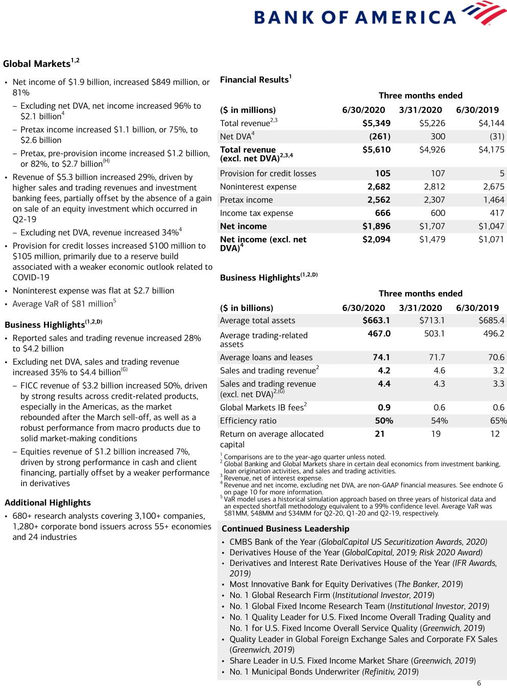 Global Markets1,2 1 • Net income of $1.9 billion, increased $849 million, or Financial Results 81% Three months ended – Excluding net DVA, net income increased 96% to ($ in millions) 6/30/2020 3/31/2020 6/30/2019 $2.1 billion4 Total revenue2,3 $5,349 $5,226 $4,144 – Pretax income increased $1.1 billion, or 75%, to 4 $2.6 billion Net DVA (261) 300 (31) – Pretax, pre-provision income increased $1.2 billion, Total revenue $5,610 $4,926 $4,175 (excl. net DVA)2,3,4 or 82%, to $2.7 billion(H) • Revenue of $5.3 billion increased 29%, driven by Provision for credit losses 105 107 5 higher sales and trading revenues and investment Noninterest expense 2,682 2,812 2,675 banking fees, partially offset by the absence of a gain Pretax income 2,562 2,307 1,464 on sale of an equity investment which occurred in Income tax expense 666 600 417 Q2-19 Net income $1,896 $1,707 $1,047 – Excluding net DVA, revenue increased 34%4 Net income (excl. net $2,094 $1,479 $1,071 • Provision for credit losses increased $100 million to DVA)4 $105 million, primarily due to a reserve build associated with a weaker economic outlook related to COVID-19 Business Highlights(1,2,D) • Noninterest expense was flat at $2.7 billion Three months ended 5 • Average VaR of $81 million ($ in billions) 6/30/2020 3/31/2020 6/30/2019 (1,2,D) Average total assets $663.1 $713.1 $685.4 Business Highlights 467.0 503.1 496.2 • Reported sales and trading revenue increased 28% Average trading-related assets to $4.2 billion Average loans and leases 74.1 71.7 70.6 • Excluding net DVA, sales and trading revenue 2 increased 35% to $4.4 billion(G) Sales and trading revenue 4.2 4.6 3.2 – FICC revenue of $3.2 billion increased 50%, driven Sales and trading revenue 4.4 4.3 3.3 2,(G) by strong results across credit-related products, (excl. net DVA) especially in the Americas, as the market Global Markets IB fees2 0.9 0.6 0.6 rebounded after the March sell-off, as well as a Efficiency ratio 50% 54% 65% robust performance from macro products due to Return on average allocated 21 19 12 solid market-making conditions capital – Equities revenue of $1.2 billion increased 7%, 1 Comparisons are to the year-ago quarter unless noted. driven by strong performance in cash and client 2 Global Banking and Global Markets share in certain deal economics from investment banking, financing, partially offset by a weaker performance loan origination activities, and sales and trading activities. 3 Revenue, net of interest expense. in derivatives 4 Revenue and net income, excluding net DVA, are non-GAAP financial measures. See endnote G on page 10 for more information. 5 VaR model uses a historical simulation approach based on three years of historical data and Additional Highlights an expected shortfall methodology equivalent to a 99% confidence level. Average VaR was • 680+ research analysts covering 3,100+ companies, $81MM, $48MM and $34MM for Q2-20, Q1-20 and Q2-19, respectively. 1,280+ corporate bond issuers across 55+ economies Continued Business Leadership and 24 industries • CMBS Bank of the Year (GlobalCapital US Securitization Awards, 2020) • Derivatives House of the Year (GlobalCapital, 2019; Risk 2020 Award) • Derivatives and Interest Rate Derivatives House of the Year (IFR Awards, 2019) • Most Innovative Bank for Equity Derivatives (The Banker, 2019) • No. 1 Global Research Firm (Institutional Investor, 2019) • No. 1 Global Fixed Income Research Team (Institutional Investor, 2019) • No. 1 Quality Leader for U.S. Fixed Income Overall Trading Quality and No. 1 for U.S. Fixed Income Overall Service Quality (Greenwich, 2019) • Quality Leader in Global Foreign Exchange Sales and Corporate FX Sales (Greenwich, 2019) • Share Leader in U.S. Fixed Income Market Share (Greenwich, 2019) • No. 1 Municipal Bonds Underwriter (Refinitiv, 2019) 6