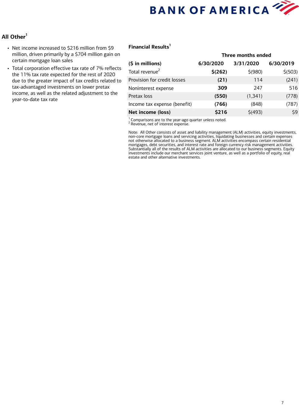 All Other1 1 • Net income increased to $216 million from $9 Financial Results million, driven primarily by a $704 million gain on Three months ended certain mortgage loan sales ($ in millions) 6/30/2020 3/31/2020 6/30/2019 • Total corporation effective tax rate of 7% reflects Total revenue2 $(262) $(980) $(503) the 11% tax rate expected for the rest of 2020 due to the greater impact of tax credits related to Provision for credit losses (21) 114 (241) tax-advantaged investments on lower pretax Noninterest expense 309 247 516 income, as well as the related adjustment to the Pretax loss (550) (1,341) (778) year-to-date tax rate Income tax expense (benefit) (766) (848) (787) Net income (loss) $216 $(493) $9 1 Comparisons are to the year-ago quarter unless noted. 2 Revenue, net of interest expense. Note: All Other consists of asset and liability management (ALM) activities, equity investments, non-core mortgage loans and servicing activities, liquidating businesses and certain expenses not otherwise allocated to a business segment. ALM activities encompass certain residential mortgages, debt securities, and interest rate and foreign currency risk management activities. Substantially all of the results of ALM activities are allocated to our business segments. Equity investments include our merchant services joint venture, as well as a portfolio of equity, real estate and other alternative investments. 7