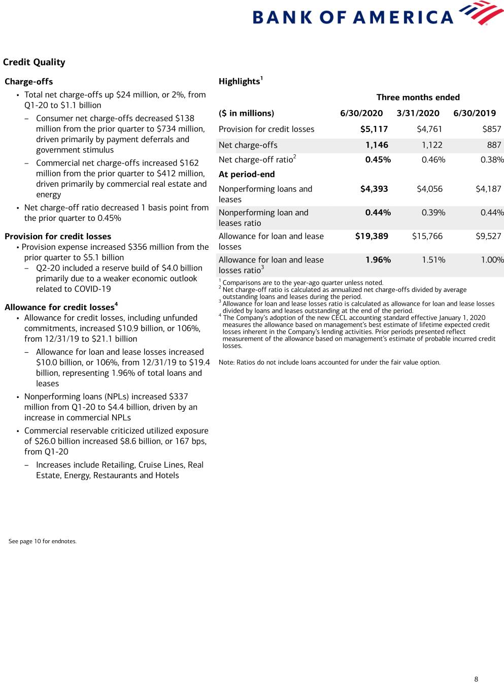 Balance Sheet, Liquidity and Capital Highlights ($ in billions except per share data, end of period, unless otherwise noted)(B,C) Three months ended 6/30/2020 3/31/2020 6/30/2019 Ending Balance Sheet Total assets $2,741.7 $2,620.0 $2,395.9 Total loans and leases 998.9 1,050.8 963.8 Total loans and leases in business segments (excluding All Other) 973.8 1,014.7 920.5 Total deposits 1,718.7 1,583.3 1,375.1 Average Balance Sheet Average total assets $2,704.2 $2,494.9 $2,399.1 Average loans and leases 1,031.4 990.3 950.5 Average deposits 1,658.2 1,439.3 1,375.5 Funding and Liquidity Long-term debt $261.6 $256.7 $238.0 Global Liquidity Sources, average(C) 796 565 552 Equity Common shareholders’ equity $242.2 $241.5 $246.7 Common equity ratio 8.8% 9.2% 10.3% Tangible common shareholders’ equity1 $172.4 $171.7 $176.8 Tangible common equity ratio1 6.5% 6.7% 7.6% Per Share Data Common shares outstanding (in billions) 8.66 8.68 9.34 Book value per common share $27.96 $27.84 $26.41 Tangible book value per common share1 19.90 19.79 18.92 Regulatory Capital(B) CET1 capital $171.0 $168.1 $171.5 Standardized approach Risk-weighted assets $1,475 $1,561 $1,467 CET1 ratio 11.6% 10.8% 11.7% Advanced approaches Risk-weighted assets $1,503 $1,512 $1,431 CET1 ratio 11.4% 11.1% 12.0% Supplementary leverage Supplementary leverage ratio (SLR) 7.0% 6.4% 6.8% 1 Represents a non-GAAP financial measure. For reconciliation, see page 18 of this press release. 9