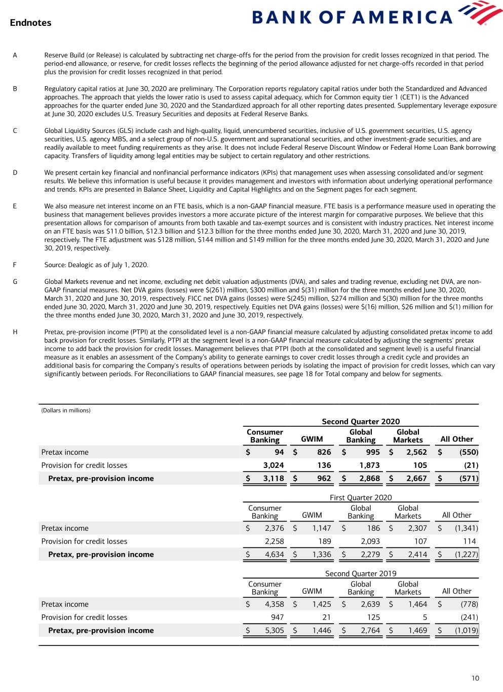 Endnotes A Reserve Build (or Release) is calculated by subtracting net charge-offs for the period from the provision for credit losses recognized in that period. The period-end allowance, or reserve, for credit losses reflects the beginning of the period allowance adjusted for net charge-offs recorded in that period plus the provision for credit losses recognized in that period. B Regulatory capital ratios at June 30, 2020 are preliminary. The Corporation reports regulatory capital ratios under both the Standardized and Advanced approaches. The approach that yields the lower ratio is used to assess capital adequacy, which for Common equity tier 1 (CET1) is the Advanced approaches for the quarter ended June 30, 2020 and the Standardized approach for all other reporting dates presented. Supplementary leverage exposure at June 30, 2020 excludes U.S. Treasury Securities and deposits at Federal Reserve Banks. C Global Liquidity Sources (GLS) include cash and high-quality, liquid, unencumbered securities, inclusive of U.S. government securities, U.S. agency securities, U.S. agency MBS, and a select group of non-U.S. government and supranational securities, and other investment-grade securities, and are readily available to meet funding requirements as they arise. It does not include Federal Reserve Discount Window or Federal Home Loan Bank borrowing capacity. Transfers of liquidity among legal entities may be subject to certain regulatory and other restrictions. D We present certain key financial and nonfinancial performance indicators (KPIs) that management uses when assessing consolidated and/or segment results. We believe this information is useful because it provides management and investors with information about underlying operational performance and trends. KPIs are presented in Balance Sheet, Liquidity and Capital Highlights and on the Segment pages for each segment. E We also measure net interest income on an FTE basis, which is a non-GAAP financial measure. FTE basis is a performance measure used in operating the business that management believes provides investors a more accurate picture of the interest margin for comparative purposes. We believe that this presentation allows for comparison of amounts from both taxable and tax-exempt sources and is consistent with industry practices. Net interest income on an FTE basis was $11.0 billion, $12.3 billion and $12.3 billion for the three months ended June 30, 2020, March 31, 2020 and June 30, 2019, respectively. The FTE adjustment was $128 million, $144 million and $149 million for the three months ended June 30, 2020, March 31, 2020 and June 30, 2019, respectively. F Source: Dealogic as of July 1, 2020. G Global Markets revenue and net income, excluding net debit valuation adjustments (DVA), and sales and trading revenue, excluding net DVA, are non- GAAP financial measures. Net DVA gains (losses) were $(261) million, $300 million and $(31) million for the three months ended June 30, 2020, March 31, 2020 and June 30, 2019, respectively. FICC net DVA gains (losses) were $(245) million, $274 million and $(30) million for the three months ended June 30, 2020, March 31, 2020 and June 30, 2019, respectively. Equities net DVA gains (losses) were $(16) million, $26 million and $(1) million for the three months ended June 30, 2020, March 31, 2020 and June 30, 2019, respectively. H Pretax, pre-provision income (PTPI) at the consolidated level is a non-GAAP financial measure calculated by adjusting consolidated pretax income to add back provision for credit losses. Similarly, PTPI at the segment level is a non-GAAP financial measure calculated by adjusting the segments' pretax income to add back the provision for credit losses. Management believes that PTPI (both at the consolidated and segment level) is a useful financial measure as it enables an assessment of the Company’s ability to generate earnings to cover credit losses through a credit cycle and provides an additional basis for comparing the Company's results of operations between periods by isolating the impact of provision for credit losses, which can vary significantly between periods. For Reconciliations to GAAP financial measures, see page 18 for Total company and below for segments. (Dollars in millions) Second Quarter 2020 Consumer Global Global Banking GWIM Banking Markets All Other Pretax income $ 94 $ 826 $ 995 $ 2,562 $ (550) Provision for credit losses 3,024 136 1,873 105 (21) Pretax, pre-provision income $ 3,118 $ 962 $ 2,868 $ 2,667 $ (571) First Quarter 2020 Consumer Global Global Banking GWIM Banking Markets All Other Pretax income $ 2,376 $ 1,147 $ 186 $ 2,307 $ (1,341) Provision for credit losses 2,258 189 2,093 107 114 Pretax, pre-provision income $ 4,634 $ 1,336 $ 2,279 $ 2,414 $ (1,227) Second Quarter 2019 Consumer Global Global Banking GWIM Banking Markets All Other Pretax income $ 4,358 $ 1,425 $ 2,639 $ 1,464 $ (778) Provision for credit losses 947 21 125 5 (241) Pretax, pre-provision income $ 5,305 $ 1,446 $ 2,764 $ 1,469 $ (1,019) 10