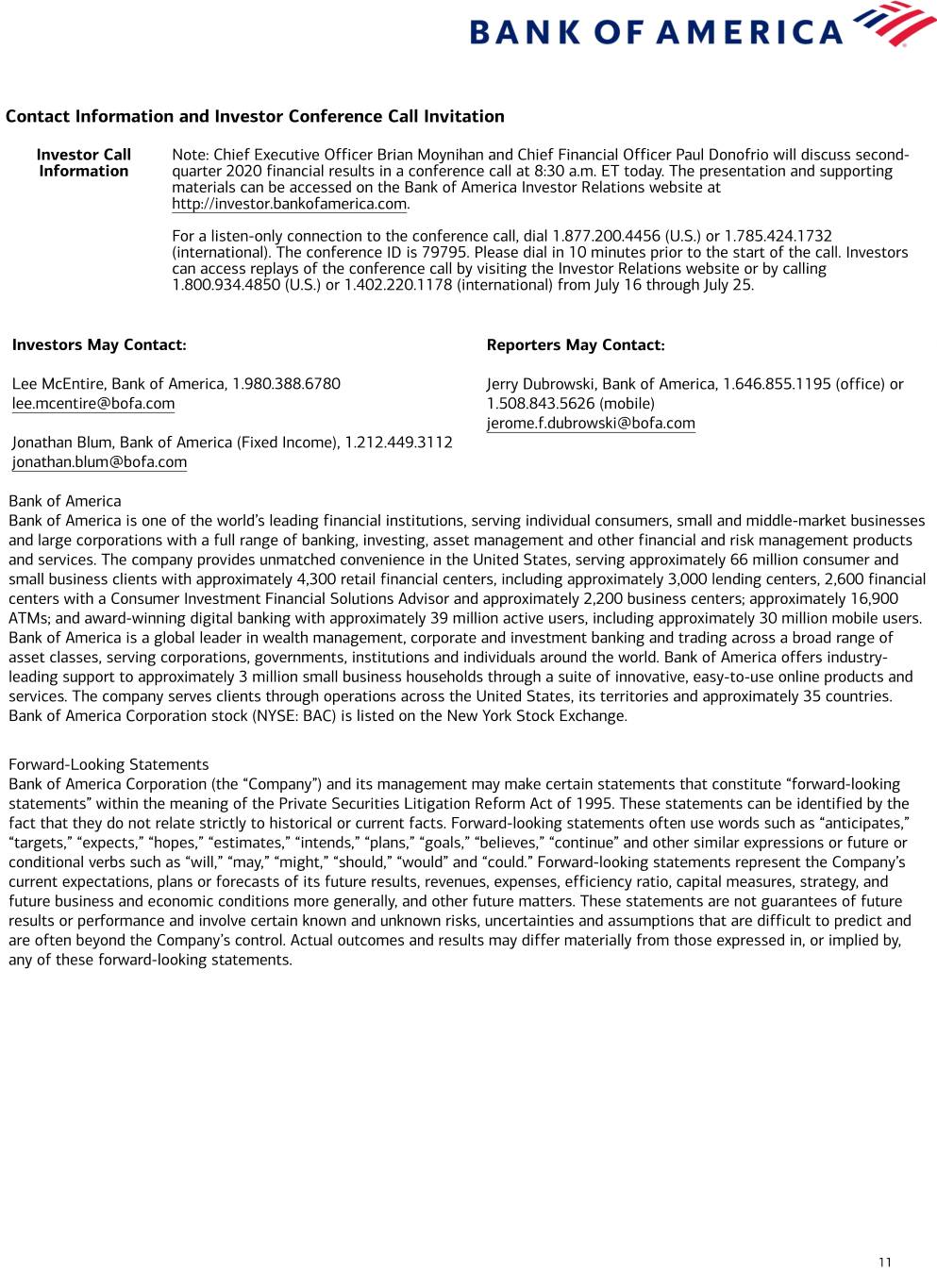 Contact Information and Investor Conference Call Invitation Investor Call Note: Chief Executive Officer Brian Moynihan and Chief Financial Officer Paul Donofrio will discuss second- Information quarter 2020 financial results in a conference call at 8:30 a.m. ET today. The presentation and supporting materials can be accessed on the Bank of America Investor Relations website at http://investor.bankofamerica.com. For a listen-only connection to the conference call, dial 1.877.200.4456 (U.S.) or 1.785.424.1732 (international). The conference ID is 79795. Please dial in 10 minutes prior to the start of the call. Investors can access replays of the conference call by visiting the Investor Relations website or by calling 1.800.934.4850 (U.S.) or 1.402.220.1178 (international) from July 16 through July 25. Investors May Contact: Reporters May Contact: Lee McEntire, Bank of America, 1.980.388.6780 Jerry Dubrowski, Bank of America, 1.646.855.1195 (office) or lee.mcentire@bofa.com 1.508.843.5626 (mobile) jerome.f.dubrowski@bofa.com Jonathan Blum, Bank of America (Fixed Income), 1.212.449.3112 jonathan.blum@bofa.com Bank of America Bank of America is one of the world’s leading financial institutions, serving individual consumers, small and middle-market businesses and large corporations with a full range of banking, investing, asset management and other financial and risk management products and services. The company provides unmatched convenience in the United States, serving approximately 66 million consumer and small business clients with approximately 4,300 retail financial centers, including approximately 3,000 lending centers, 2,600 financial centers with a Consumer Investment Financial Solutions Advisor and approximately 2,200 business centers; approximately 16,900 ATMs; and award-winning digital banking with approximately 39 million active users, including approximately 30 million mobile users. Bank of America is a global leader in wealth management, corporate and investment banking and trading across a broad range of asset classes, serving corporations, governments, institutions and individuals around the world. Bank of America offers industry- leading support to approximately 3 million small business households through a suite of innovative, easy-to-use online products and services. The company serves clients through operations across the United States, its territories and approximately 35 countries. Bank of America Corporation stock (NYSE: BAC) is listed on the New York Stock Exchange. Forward-Looking Statements Bank of America Corporation (the “Company”) and its management may make certain statements that constitute “forward-looking statements” within the meaning of the Private Securities Litigation Reform Act of 1995. These statements can be identified by the fact that they do not relate strictly to historical or current facts. Forward-looking statements often use words such as “anticipates,” “targets,” “expects,” “hopes,” “estimates,” “intends,” “plans,” “goals,” “believes,” “continue” and other similar expressions or future or conditional verbs such as “will,” “may,” “might,” “should,” “would” and “could.” Forward-looking statements represent the Company’s current expectations, plans or forecasts of its future results, revenues, expenses, efficiency ratio, capital measures, strategy, and future business and economic conditions more generally, and other future matters. These statements are not guarantees of future results or performance and involve certain known and unknown risks, uncertainties and assumptions that are difficult to predict and are often beyond the Company’s control. Actual outcomes and results may differ materially from those expressed in, or implied by, any of these forward-looking statements. 11