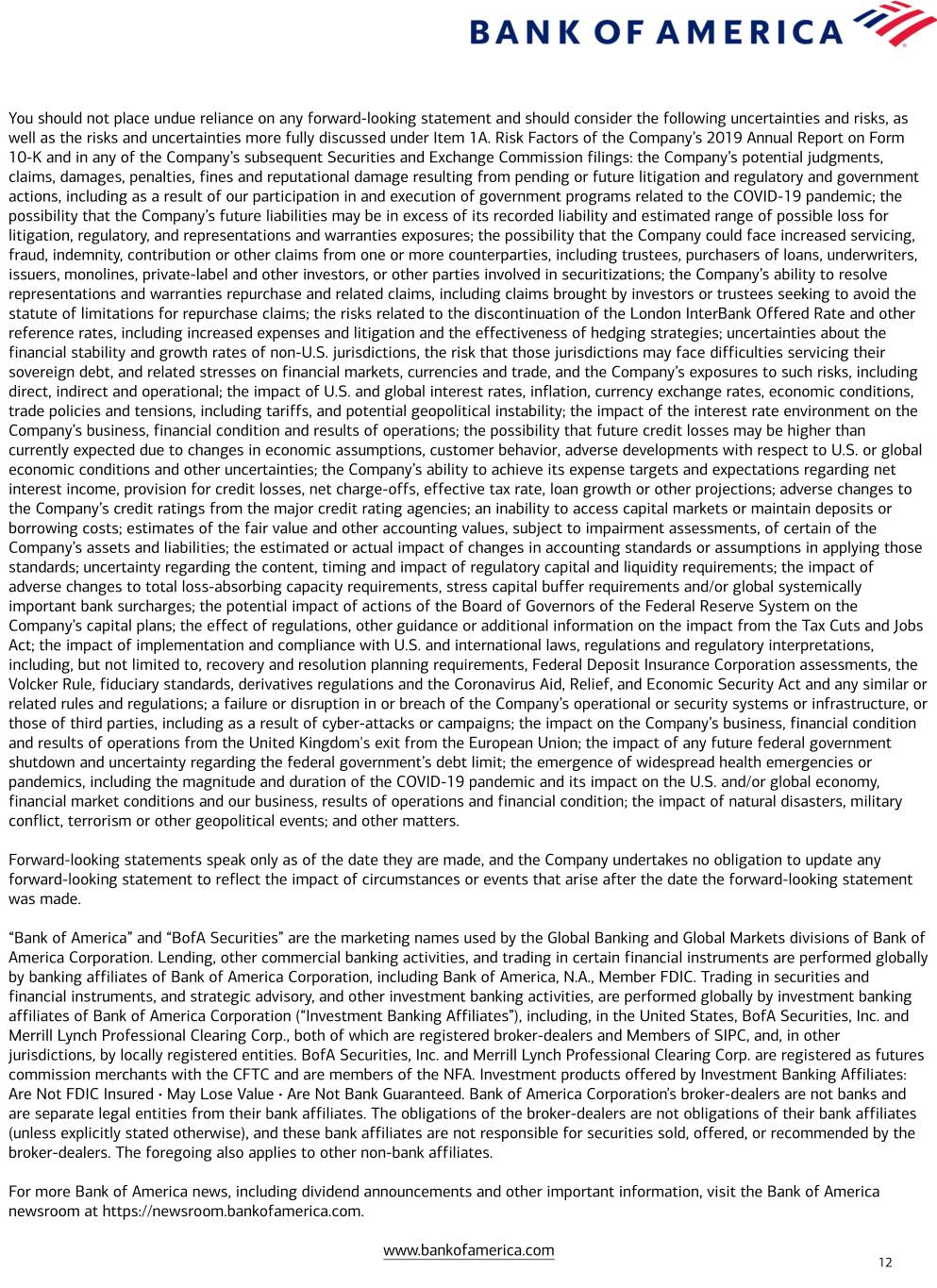 You should not place undue reliance on any forward-looking statement and should consider the following uncertainties and risks, as well as the risks and uncertainties more fully discussed under Item 1A. Risk Factors of the Company’s 2019 Annual Report on Form 10-K and in any of the Company’s subsequent Securities and Exchange Commission filings: the Company’s potential judgments, claims, damages, penalties, fines and reputational damage resulting from pending or future litigation and regulatory and government actions, including as a result of our participation in and execution of government programs related to the COVID-19 pandemic; the possibility that the Company’s future liabilities may be in excess of its recorded liability and estimated range of possible loss for litigation, regulatory, and representations and warranties exposures; the possibility that the Company could face increased servicing, fraud, indemnity, contribution or other claims from one or more counterparties, including trustees, purchasers of loans, underwriters, issuers, monolines, private-label and other investors, or other parties involved in securitizations; the Company’s ability to resolve representations and warranties repurchase and related claims, including claims brought by investors or trustees seeking to avoid the statute of limitations for repurchase claims; the risks related to the discontinuation of the London InterBank Offered Rate and other reference rates, including increased expenses and litigation and the effectiveness of hedging strategies; uncertainties about the financial stability and growth rates of non-U.S. jurisdictions, the risk that those jurisdictions may face difficulties servicing their sovereign debt, and related stresses on financial markets, currencies and trade, and the Company’s exposures to such risks, including direct, indirect and operational; the impact of U.S. and global interest rates, inflation, currency exchange rates, economic conditions, trade policies and tensions, including tariffs, and potential geopolitical instability; the impact of the interest rate environment on the Company’s business, financial condition and results of operations; the possibility that future credit losses may be higher than currently expected due to changes in economic assumptions, customer behavior, adverse developments with respect to U.S. or global economic conditions and other uncertainties; the Company’s ability to achieve its expense targets and expectations regarding net interest income, provision for credit losses, net charge-offs, effective tax rate, loan growth or other projections; adverse changes to the Company’s credit ratings from the major credit rating agencies; an inability to access capital markets or maintain deposits or borrowing costs; estimates of the fair value and other accounting values, subject to impairment assessments, of certain of the Company’s assets and liabilities; the estimated or actual impact of changes in accounting standards or assumptions in applying those standards; uncertainty regarding the content, timing and impact of regulatory capital and liquidity requirements; the impact of adverse changes to total loss-absorbing capacity requirements, stress capital buffer requirements and/or global systemically important bank surcharges; the potential impact of actions of the Board of Governors of the Federal Reserve System on the Company’s capital plans; the effect of regulations, other guidance or additional information on the impact from the Tax Cuts and Jobs Act; the impact of implementation and compliance with U.S. and international laws, regulations and regulatory interpretations, including, but not limited to, recovery and resolution planning requirements, Federal Deposit Insurance Corporation assessments, the Volcker Rule, fiduciary standards, derivatives regulations and the Coronavirus Aid, Relief, and Economic Security Act and any similar or related rules and regulations; a failure or disruption in or breach of the Company’s operational or security systems or infrastructure, or those of third parties, including as a result of cyber-attacks or campaigns; the impact on the Company’s business, financial condition and results of operations from the United Kingdom's exit from the European Union; the impact of any future federal government shutdown and uncertainty regarding the federal government’s debt limit; the emergence of widespread health emergencies or pandemics, including the magnitude and duration of the COVID-19 pandemic and its impact on the U.S. and/or global economy, financial market conditions and our business, results of operations and financial condition; the impact of natural disasters, military conflict, terrorism or other geopolitical events; and other matters. Forward-looking statements speak only as of the date they are made, and the Company undertakes no obligation to update any forward-looking statement to reflect the impact of circumstances or events that arise after the date the forward-looking statement was made. “Bank of America” and “BofA Securities” are the marketing names used by the Global Banking and Global Markets divisions of Bank of America Corporation. Lending, other commercial banking activities, and trading in certain financial instruments are performed globally by banking affiliates of Bank of America Corporation, including Bank of America, N.A., Member FDIC. Trading in securities and financial instruments, and strategic advisory, and other investment banking activities, are performed globally by investment banking affiliates of Bank of America Corporation (“Investment Banking Affiliates”), including, in the United States, BofA Securities, Inc. and Merrill Lynch Professional Clearing Corp., both of which are registered broker-dealers and Members of SIPC, and, in other jurisdictions, by locally registered entities. BofA Securities, Inc. and Merrill Lynch Professional Clearing Corp. are