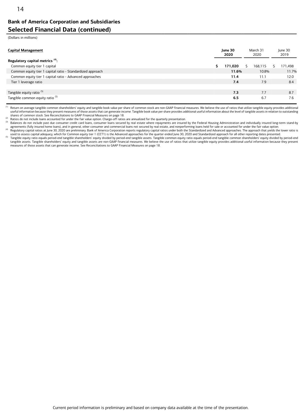 14 Bank of America Corporation and Subsidiaries Selected Financial Data (continued) (Dollars in millions) Capital Management June 30 March 31 June 30 2020 2020 2019 Regulatory capital metrics (4): Common equity tier 1 capital $ 171,020 $ 168,115 $ 171,498 Common equity tier 1 capital ratio - Standardized approach 11.6% 10.8% 11.7% Common equity tier 1 capital ratio - Advanced approaches 11.4 11.1 12.0 Tier 1 leverage ratio 7.4 7.9 8.4 Tangible equity ratio (5) 7.3 7.7 8.7 Tangible common equity ratio (5) 6.5 6.7 7.6 (1) Return on average tangible common shareholders’ equity and tangible book value per share of common stock are non-GAAP financial measures. We believe the use of ratios that utilize tangible equity provides additional useful information because they present measures of those assets that can generate income. Tangible book value per share provides additional useful information about the level of tangible assets in relation to outstanding shares of common stock. See Reconciliations to GAAP Financial Measures on page 18. (2) Ratios do not include loans accounted for under the fair value option. Charge-off ratios are annualized for the quarterly presentation. (3) Balances do not include past due consumer credit card loans, consumer loans secured by real estate where repayments are insured by the Federal Housing Administration and individually insured long-term stand-by agreements (fully insured home loans), and in general, other consumer and commercial loans not secured by real estate, and nonperforming loans held for sale or accounted for under the fair value option. (4) Regulatory capital ratios at June 30, 2020 are preliminary. Bank of America Corporation reports regulatory capital ratios under both the Standardized and Advanced approaches. The approach that yields the lower ratio is used to assess capital adequacy, which for Common equity tier 1 (CET1) is the Advanced approaches for the quarter ended June 30, 2020 and Standardized approach for all other reporting dates presented. (5) Tangible equity ratio equals period-end tangible shareholders’ equity divided by period-end tangible assets. Tangible common equity ratio equals period-end tangible common shareholders’ equity divided by period-end tangible assets. Tangible shareholders’ equity and tangible assets are non-GAAP financial measures. We believe the use of ratios that utilize tangible equity provides additional useful information because they present measures of those assets that can generate income. See Reconciliations to GAAP Financial Measures on page 18. Current period information is preliminary and based on company data available at the time of the presentation.
