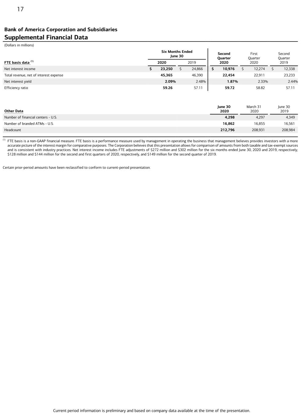 17 Bank of America Corporation and Subsidiaries Supplemental Financial Data (Dollars in millions) Six Months Ended Second First Second June 30 Quarter Quarter Quarter FTE basis data (1) 2020 2019 2020 2020 2019 Net interest income $ 23,250 $ 24,866 $ 10,976 $ 12,274 $ 12,338 Total revenue, net of interest expense 45,365 46,390 22,454 22,911 23,233 Net interest yield 2.09% 2.48% 1.87% 2.33% 2.44% Efficiency ratio 59.26 57.11 59.72 58.82 57.11 June 30 March 31 June 30 Other Data 2020 2020 2019 Number of financial centers - U.S. 4,298 4,297 4,349 Number of branded ATMs - U.S. 16,862 16,855 16,561 Headcount 212,796 208,931 208,984 (1) FTE basis is a non-GAAP financial measure. FTE basis is a performance measure used by management in operating the business that management believes provides investors with a more accurate picture of the interest margin for comparative purposes. The Corporation believes that this presentation allows for comparison of amounts from both taxable and tax-exempt sources and is consistent with industry practices. Net interest income includes FTE adjustments of $272 million and $302 million for the six months ended June 30, 2020 and 2019, respectively; $128 million and $144 million for the second and first quarters of 2020, respectively, and $149 million for the second quarter of 2019. Certain prior-period amounts have been reclassified to conform to current-period presentation. Current period information is preliminary and based on company data available at the time of the presentation.