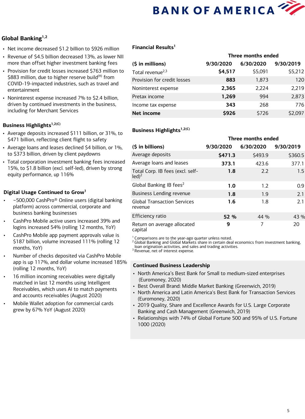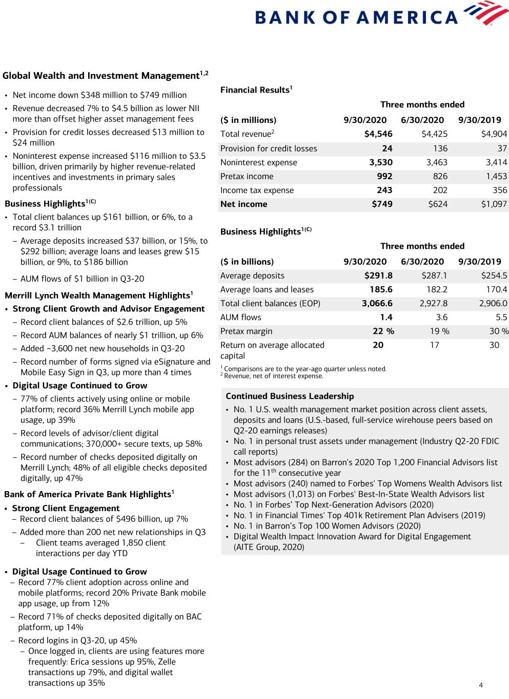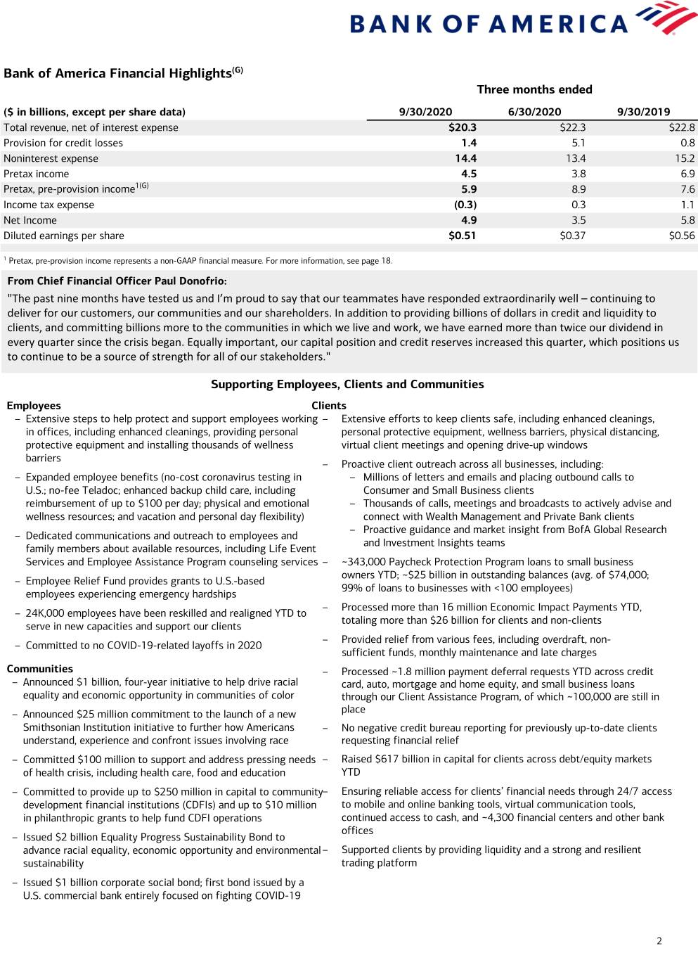 Bank of America Financial Highlights(G) Three months ended ($ in billions, except per share data) 9/30/2020 6/30/2020 9/30/2019 Total revenue, net of interest expense $20.3 $22.3 $22.8 Provision for credit losses 1.4 5.1 0.8 Noninterest expense 14.4 13.4 15.2 Pretax income 4.5 3.8 6.9 Pretax, pre-provision income1(G) 5.9 8.9 7.6 Income tax expense (0.3) 0.3 1.1 Net Income 4.9 3.5 5.8 Diluted earnings per share $0.51 $0.37 $0.56 1 Pretax, pre-provision income represents a non-GAAP financial measure. For more information, see page 18. From Chief Financial Officer Paul Donofrio: "The past nine months have tested us and I’m proud to say that our teammates have responded extraordinarily well – continuing to deliver for our customers, our communities and our shareholders. In addition to providing billions of dollars in credit and liquidity to clients, and committing billions more to the communities in which we live and work, we have earned more than twice our dividend in every quarter since the crisis began. Equally important, our capital position and credit reserves increased this quarter, which positions us to continue to be a source of strength for all of our stakeholders." Supporting Employees, Clients and Communities Employees Clients – Extensive steps to help protect and support employees working – Extensive efforts to keep clients safe, including enhanced cleanings, in offices, including enhanced cleanings, providing personal personal protective equipment, wellness barriers, physical distancing, protective equipment and installing thousands of wellness virtual client meetings and opening drive-up windows barriers – Proactive client outreach across all businesses, including: – Expanded employee benefits (no-cost coronavirus testing in – Millions of letters and emails and placing outbound calls to U.S.; no-fee Teladoc; enhanced backup child care, including Consumer and Small Business clients reimbursement of up to $100 per day; physical and emotional – Thousands of calls, meetings and broadcasts to actively advise and wellness resources; and vacation and personal day flexibility) connect with Wealth Management and Private Bank clients – Proactive guidance and market insight from BofA Global Research – Dedicated communications and outreach to employees and and Investment Insights teams family members about available resources, including Life Event Services and Employee Assistance Program counseling services – ~343,000 Paycheck Protection Program loans to small business owners YTD; ~$25 billion in outstanding balances (avg. of $74,000; – Employee Relief Fund provides grants to U.S.-based 99% of loans to businesses with <100 employees) employees experiencing emergency hardships – Processed more than 16 million Economic Impact Payments YTD, – 24K,000 employees have been reskilled and realigned YTD to totaling more than $26 billion for clients and non-clients serve in new capacities and support our clients – Provided relief from various fees, including overdraft, non- – Committed to no COVID-19-related layoffs in 2020 sufficient funds, monthly maintenance and late charges Communities – Processed ~1.8 million payment deferral requests YTD across credit – Announced $1 billion, four-year initiative to help drive racial card, auto, mortgage and home equity, and small business loans equality and economic opportunity in communities of color through our Client Assistance Program, of which ~100,000 are still in – Announced $25 million commitment to the launch of a new place Smithsonian Institution initiative to further how Americans – No negative credit bureau reporting for previously up-to-date clients understand, experience and confront issues involving race requesting financial relief – Committed $100 million to support and address pressing needs – Raised $617 billion in capital for clients across debt/equity markets of health crisis, including health care, food and education YTD – Committed to provide up to $250 million in capital to community– Ensuring reliable access for clients’ financial needs through 24/7 access development financial institutions (CDFIs) and up to $10 million to mobile and online banking tools, virtual communication tools, in philanthropic grants to help fund CDFI operations continued access to cash, and ~4,300 financial centers and other bank offices – Issued $2 billion Equality Progress Sustainability Bond to advance racial equality, economic opportunity and environmental – Supported clients by providing liquidity and a strong and resilient sustainability trading platform – Issued $1 billion corporate social bond; first bond issued by a U.S. commercial bank entirely focused on fighting COVID-19 2