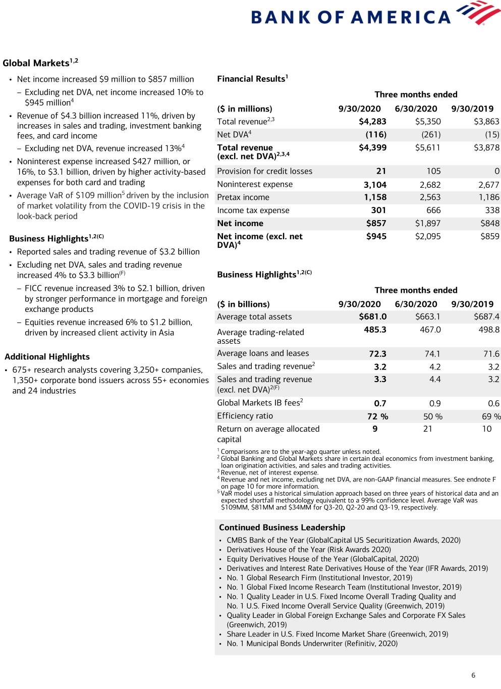 Global Markets1,2 • Net income increased $9 million to $857 million Financial Results1 – Excluding net DVA, net income increased 10% to Three months ended $945 million4 ($ in millions) 9/30/2020 6/30/2020 9/30/2019 • Revenue of $4.3 billion increased 11%, driven by 2,3 increases in sales and trading, investment banking Total revenue $4,283 $5,350 $3,863 fees, and card income Net DVA4 (116) (261) (15) – Excluding net DVA, revenue increased 13%4 Total revenue $4,399 $5,611 $3,878 (excl. net DVA)2,3,4 • Noninterest expense increased $427 million, or 16%, to $3.1 billion, driven by higher activity-based Provision for credit losses 21 105 0 expenses for both card and trading Noninterest expense 3,104 2,682 2,677 5 • Average VaR of $109 million driven by the inclusion Pretax income 1,158 2,563 1,186 of market volatility from the COVID-19 crisis in the Income tax expense 301 666 338 look-back period Net income $857 $1,897 $848 Business Highlights1,2(C) Net income (excl. net $945 $2,095 $859 DVA)4 • Reported sales and trading revenue of $3.2 billion • Excluding net DVA, sales and trading revenue increased 4% to $3.3 billion(F) Business Highlights1,2(C) – FICC revenue increased 3% to $2.1 billion, driven Three months ended by stronger performance in mortgage and foreign ($ in billions) 9/30/2020 6/30/2020 9/30/2019 exchange products Average total assets $681.0 $663.1 $687.4 – Equities revenue increased 6% to $1.2 billion, driven by increased client activity in Asia Average trading-related 485.3 467.0 498.8 assets Additional Highlights Average loans and leases 72.3 74.1 71.6 2 • 675+ research analysts covering 3,250+ companies, Sales and trading revenue 3.2 4.2 3.2 1,350+ corporate bond issuers across 55+ economies Sales and trading revenue 3.3 4.4 3.2 and 24 industries (excl. net DVA)2(F) Global Markets IB fees2 0.7 0.9 0.6 Efficiency ratio 72 % 50 % 69 % Return on average allocated 9 21 10 capital 1 Comparisons are to the year-ago quarter unless noted. 2 Global Banking and Global Markets share in certain deal economics from investment banking, loan origination activities, and sales and trading activities. 3 Revenue, net of interest expense. 4 Revenue and net income, excluding net DVA, are non-GAAP financial measures. See endnote F on page 10 for more information. 5 VaR model uses a historical simulation approach based on three years of historical data and an expected shortfall methodology equivalent to a 99% confidence level. Average VaR was $109MM, $81MM and $34MM for Q3-20, Q2-20 and Q3-19, respectively. Continued Business Leadership • CMBS Bank of the Year (GlobalCapital US Securitization Awards, 2020) • Derivatives House of the Year (Risk Awards 2020) • Equity Derivatives House of the Year (GlobalCapital, 2020) • Derivatives and Interest Rate Derivatives House of the Year (IFR Awards, 2019) • No. 1 Global Research Firm (Institutional Investor, 2019) • No. 1 Global Fixed Income Research Team (Institutional Investor, 2019) • No. 1 Quality Leader in U.S. Fixed Income Overall Trading Quality and No. 1 U.S. Fixed Income Overall Service Quality (Greenwich, 2019) • Quality Leader in Global Foreign Exchange Sales and Corporate FX Sales (Greenwich, 2019) • Share Leader in U.S. Fixed Income Market Share (Greenwich, 2019) • No. 1 Municipal Bonds Underwriter (Refinitiv, 2020) 6