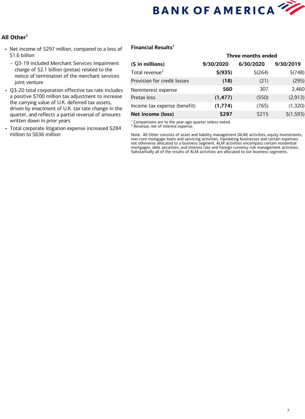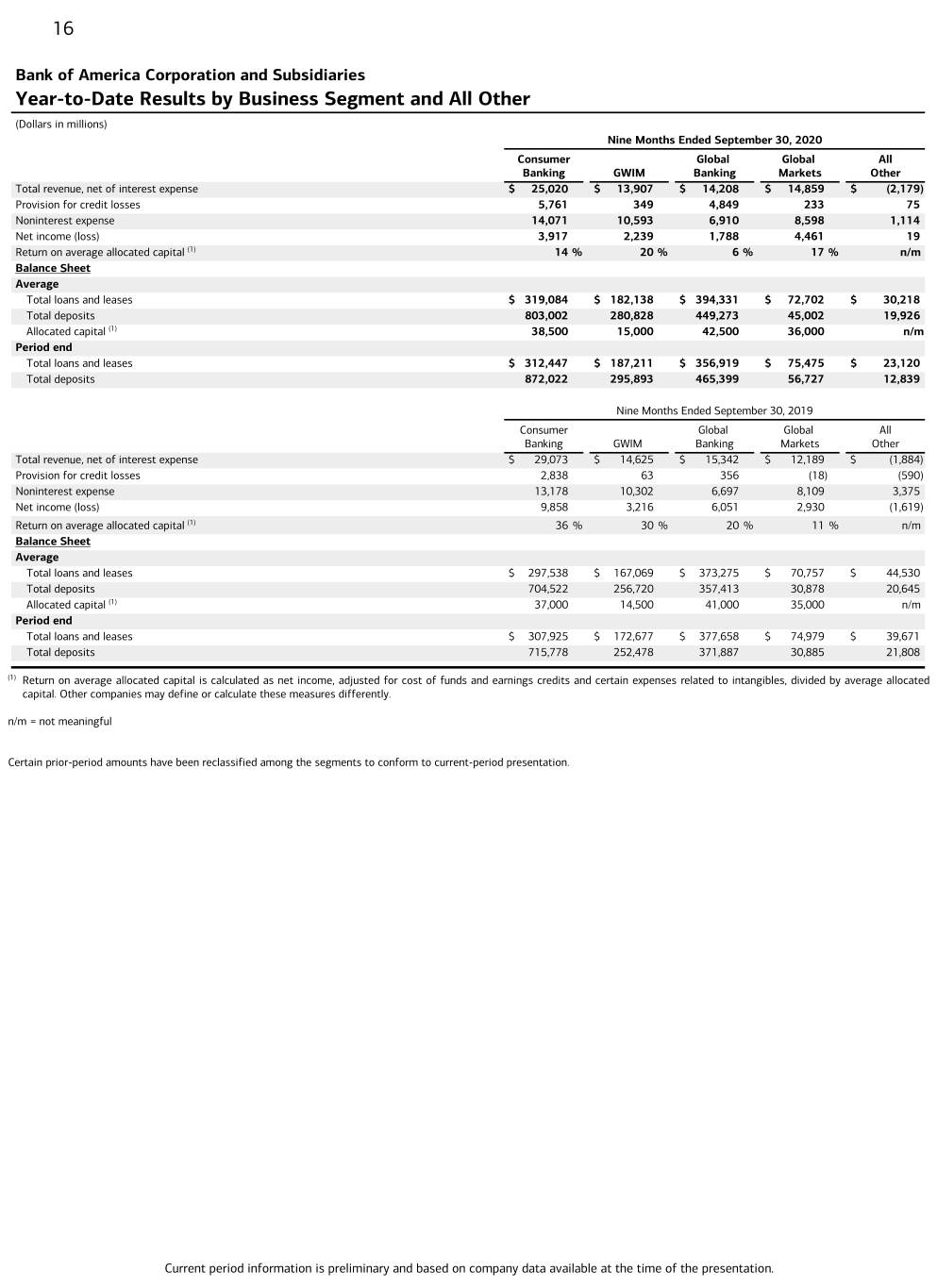15 Bank of America Corporation and Subsidiaries Quarterly Results by Business Segment and All Other (Dollars in millions) Third Quarter 2020 Consumer Global Global All Banking GWIM Banking Markets Other Total revenue, net of interest expense $ 8,039 $ 4,546 $ 4,517 $ 4,283 $ (935) Provision for credit losses 479 24 883 21 (18) Noninterest expense 4,842 3,530 2,365 3,104 560 Net income 2,052 749 926 857 297 Return on average allocated capital (1) 21 % 20 % 9 % 9 % n/m Balance Sheet Average Total loans and leases $ 318,751 $ 185,587 $ 373,118 $ 72,319 $ 24,243 Total deposits 860,999 291,845 471,288 56,475 14,881 Allocated capital (1) 38,500 15,000 42,500 36,000 n/m Quarter end Total loans and leases $ 312,447 $ 187,211 $ 356,919 $ 75,475 $ 23,120 Total deposits 872,022 295,893 465,399 56,727 12,839 Second Quarter 2020 Consumer Global Global All Banking GWIM Banking Markets Other Total revenue, net of interest expense $ 7,852 $ 4,425 $ 5,091 $ 5,350 $ (264) Provision for credit losses 3,024 136 1,873 105 (21) Noninterest expense 4,734 3,463 2,224 2,682 307 Net income (loss) 71 624 726 1,897 215 Return on average allocated capital (1) 1 % 17 % 7 % 21 % n/m Balance Sheet Average Total loans and leases $ 321,558 $ 182,150 $ 423,625 $ 74,131 $ 29,923 Total deposits 810,700 287,109 493,918 45,083 21,387 Allocated capital (1) 38,500 15,000 42,500 36,000 n/m Quarter end Total loans and leases $ 325,105 $ 184,293 $ 390,108 $ 74,342 $ 25,096 Total deposits 854,017 291,740 500,918 52,842 19,149 Third Quarter 2019 Consumer Global Global All Banking GWIM Banking Markets Other Total revenue, net of interest expense $ 9,724 $ 4,904 $ 5,212 $ 3,863 $ (748) Provision for credit losses 917 37 120 — (295) Noninterest expense 4,399 3,414 2,219 2,677 2,460 Net income 3,328 1,097 2,097 848 (1,593) Return on average allocated capital (1) 36 % 30 % 20 % 10 % n/m Balance Sheet Average Total loans and leases $ 303,832 $ 170,414 $ 377,109 $ 71,589 $ 41,789 Total deposits 709,339 254,460 360,457 30,155 20,641 Allocated capital (1) 37,000 14,500 41,000 35,000 n/m Quarter end Total loans and leases $ 307,925 $ 172,677 $ 377,658 $ 74,979 $ 39,671 Total deposits 715,778 252,478 371,887 30,885 21,808 (1) Return on average allocated capital is calculated as net income, adjusted for cost of funds and earnings credits and certain expenses related to intangibles, divided by average allocated capital. Other companies may define or calculate these measures differently. n/m = not meaningful Certain prior-period amounts have been reclassified among the segments to conform to current-period presentation. The Company reports the results of operations of its four business segments and All Other on a fully taxable-equivalent (FTE) basis. Current period information is preliminary and based on company data available at the time of the presentation.