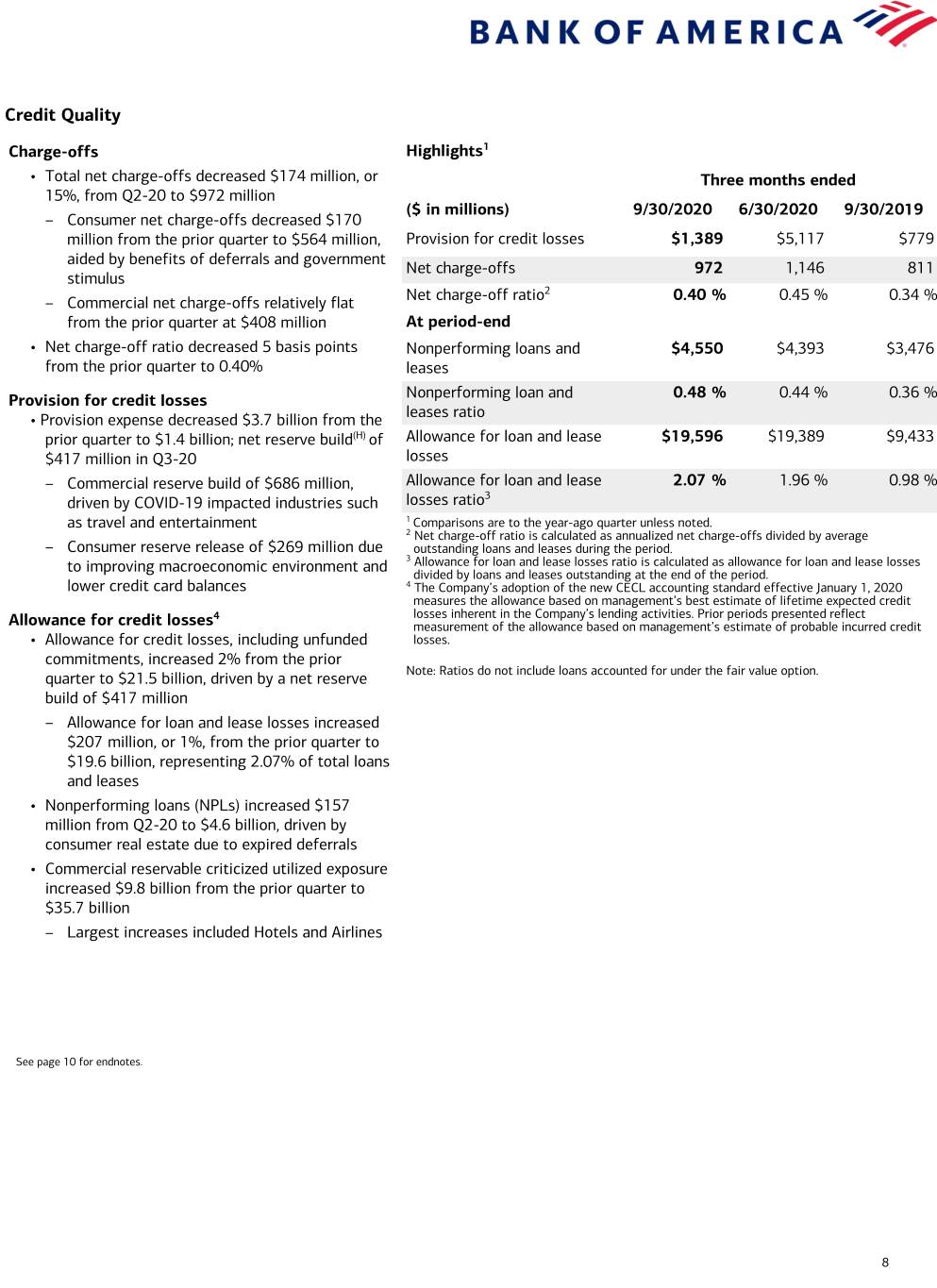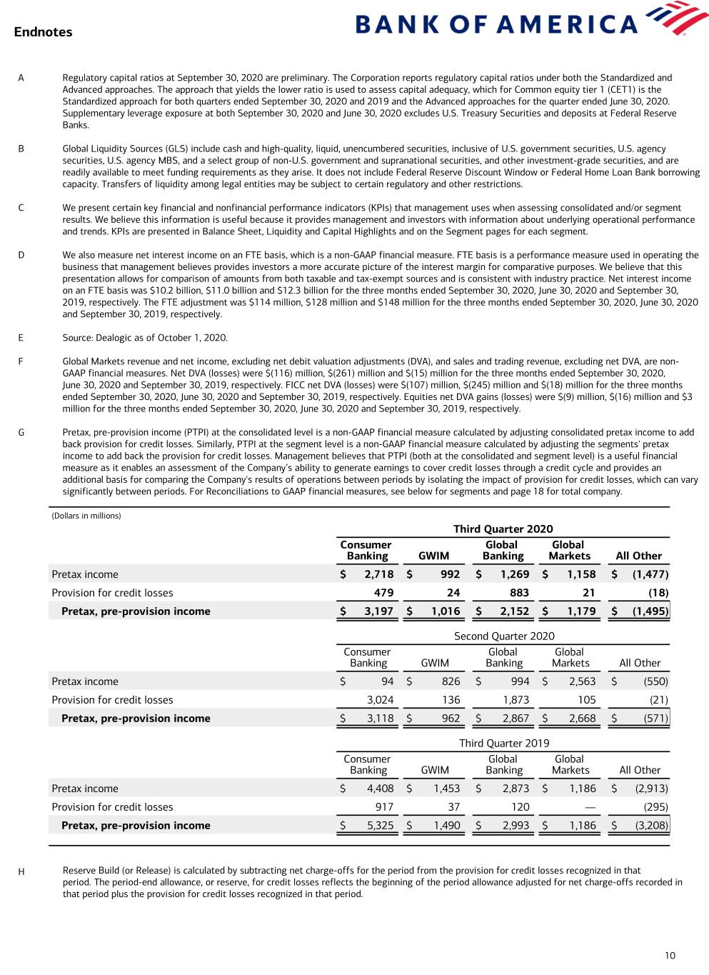 Endnotes A Regulatory capital ratios at September 30, 2020 are preliminary. The Corporation reports regulatory capital ratios under both the Standardized and Advanced approaches. The approach that yields the lower ratio is used to assess capital adequacy, which for Common equity tier 1 (CET1) is the Standardized approach for both quarters ended September 30, 2020 and 2019 and the Advanced approaches for the quarter ended June 30, 2020. Supplementary leverage exposure at both September 30, 2020 and June 30, 2020 excludes U.S. Treasury Securities and deposits at Federal Reserve Banks. B Global Liquidity Sources (GLS) include cash and high-quality, liquid, unencumbered securities, inclusive of U.S. government securities, U.S. agency securities, U.S. agency MBS, and a select group of non-U.S. government and supranational securities, and other investment-grade securities, and are readily available to meet funding requirements as they arise. It does not include Federal Reserve Discount Window or Federal Home Loan Bank borrowing capacity. Transfers of liquidity among legal entities may be subject to certain regulatory and other restrictions. C We present certain key financial and nonfinancial performance indicators (KPIs) that management uses when assessing consolidated and/or segment results. We believe this information is useful because it provides management and investors with information about underlying operational performance and trends. KPIs are presented in Balance Sheet, Liquidity and Capital Highlights and on the Segment pages for each segment. D We also measure net interest income on an FTE basis, which is a non-GAAP financial measure. FTE basis is a performance measure used in operating the business that management believes provides investors a more accurate picture of the interest margin for comparative purposes. We believe that this presentation allows for comparison of amounts from both taxable and tax-exempt sources and is consistent with industry practice. Net interest income on an FTE basis was $10.2 billion, $11.0 billion and $12.3 billion for the three months ended September 30, 2020, June 30, 2020 and September 30, 2019, respectively. The FTE adjustment was $114 million, $128 million and $148 million for the three months ended September 30, 2020, June 30, 2020 and September 30, 2019, respectively. E Source: Dealogic as of October 1, 2020. F Global Markets revenue and net income, excluding net debit valuation adjustments (DVA), and sales and trading revenue, excluding net DVA, are non- GAAP financial measures. Net DVA (losses) were $(116) million, $(261) million and $(15) million for the three months ended September 30, 2020, June 30, 2020 and September 30, 2019, respectively. FICC net DVA (losses) were $(107) million, $(245) million and $(18) million for the three months ended September 30, 2020, June 30, 2020 and September 30, 2019, respectively. Equities net DVA gains (losses) were $(9) million, $(16) million and $3 million for the three months ended September 30, 2020, June 30, 2020 and September 30, 2019, respectively. G Pretax, pre-provision income (PTPI) at the consolidated level is a non-GAAP financial measure calculated by adjusting consolidated pretax income to add back provision for credit losses. Similarly, PTPI at the segment level is a non-GAAP financial measure calculated by adjusting the segments' pretax income to add back the provision for credit losses. Management believes that PTPI (both at the consolidated and segment level) is a useful financial measure as it enables an assessment of the Company’s ability to generate earnings to cover credit losses through a credit cycle and provides an additional basis for comparing the Company's results of operations between periods by isolating the impact of provision for credit losses, which can vary significantly between periods. For Reconciliations to GAAP financial measures, see below for segments and page 18 for total company. (Dollars in millions) Third Quarter 2020 Consumer Global Global Banking GWIM Banking Markets All Other Pretax income $ 2,718 $ 992 $ 1,269 $ 1,158 $ (1,477) Provision for credit losses 479 24 883 21 (18) Pretax, pre-provision income $ 3,197 $ 1,016 $ 2,152 $ 1,179 $ (1,495) Second Quarter 2020 Consumer Global Global Banking GWIM Banking Markets All Other Pretax income $ 94 $ 826 $ 994 $ 2,563 $ (550) Provision for credit losses 3,024 136 1,873 105 (21) Pretax, pre-provision income $ 3,118 $ 962 $ 2,867 $ 2,668 $ (571) Third Quarter 2019 Consumer Global Global Banking GWIM Banking Markets All Other Pretax income $ 4,408 $ 1,453 $ 2,873 $ 1,186 $ (2,913) Provision for credit losses 917 37 120 — (295) Pretax, pre-provision income $ 5,325 $ 1,490 $ 2,993 $ 1,186 $ (3,208) H Reserve Build (or Release) is calculated by subtracting net charge-offs for the period from the provision for credit losses recognized in that period. The period-end allowance, or reserve, for credit losses reflects the beginning of the period allowance adjusted for net charge-offs recorded in that period plus the provision for credit losses recognized in that period. 10