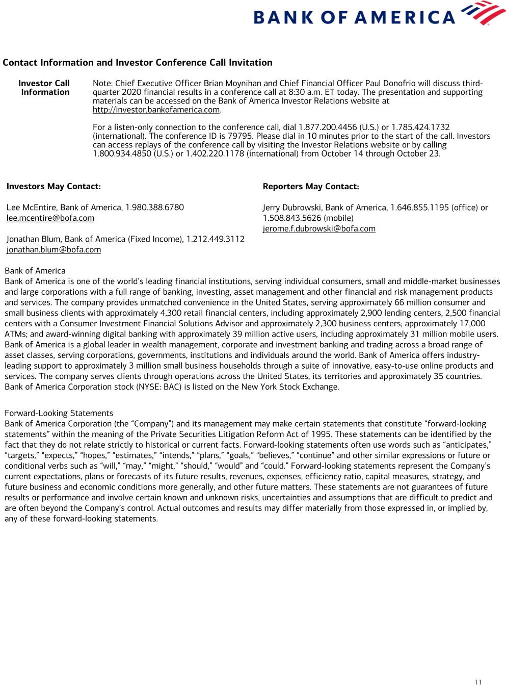 Contact Information and Investor Conference Call Invitation Investor Call Note: Chief Executive Officer Brian Moynihan and Chief Financial Officer Paul Donofrio will discuss third- Information quarter 2020 financial results in a conference call at 8:30 a.m. ET today. The presentation and supporting materials can be accessed on the Bank of America Investor Relations website at http://investor.bankofamerica.com. For a listen-only connection to the conference call, dial 1.877.200.4456 (U.S.) or 1.785.424.1732 (international). The conference ID is 79795. Please dial in 10 minutes prior to the start of the call. Investors can access replays of the conference call by visiting the Investor Relations website or by calling 1.800.934.4850 (U.S.) or 1.402.220.1178 (international) from October 14 through October 23. Investors May Contact: Reporters May Contact: Lee McEntire, Bank of America, 1.980.388.6780 Jerry Dubrowski, Bank of America, 1.646.855.1195 (office) or lee.mcentire@bofa.com 1.508.843.5626 (mobile) jerome.f.dubrowski@bofa.com Jonathan Blum, Bank of America (Fixed Income), 1.212.449.3112 jonathan.blum@bofa.com Bank of America Bank of America is one of the world’s leading financial institutions, serving individual consumers, small and middle-market businesses and large corporations with a full range of banking, investing, asset management and other financial and risk management products and services. The company provides unmatched convenience in the United States, serving approximately 66 million consumer and small business clients with approximately 4,300 retail financial centers, including approximately 2,900 lending centers, 2,500 financial centers with a Consumer Investment Financial Solutions Advisor and approximately 2,300 business centers; approximately 17,000 ATMs; and award-winning digital banking with approximately 39 million active users, including approximately 31 million mobile users. Bank of America is a global leader in wealth management, corporate and investment banking and trading across a broad range of asset classes, serving corporations, governments, institutions and individuals around the world. Bank of America offers industry- leading support to approximately 3 million small business households through a suite of innovative, easy-to-use online products and services. The company serves clients through operations across the United States, its territories and approximately 35 countries. Bank of America Corporation stock (NYSE: BAC) is listed on the New York Stock Exchange. Forward-Looking Statements Bank of America Corporation (the “Company”) and its management may make certain statements that constitute “forward-looking statements” within the meaning of the Private Securities Litigation Reform Act of 1995. These statements can be identified by the fact that they do not relate strictly to historical or current facts. Forward-looking statements often use words such as “anticipates,” “targets,” “expects,” “hopes,” “estimates,” “intends,” “plans,” “goals,” “believes,” “continue” and other similar expressions or future or conditional verbs such as “will,” “may,” “might,” “should,” “would” and “could.” Forward-looking statements represent the Company’s current expectations, plans or forecasts of its future results, revenues, expenses, efficiency ratio, capital measures, strategy, and future business and economic conditions more generally, and other future matters. These statements are not guarantees of future results or performance and involve certain known and unknown risks, uncertainties and assumptions that are difficult to predict and are often beyond the Company’s control. Actual outcomes and results may differ materially from those expressed in, or implied by, any of these forward-looking statements. 11