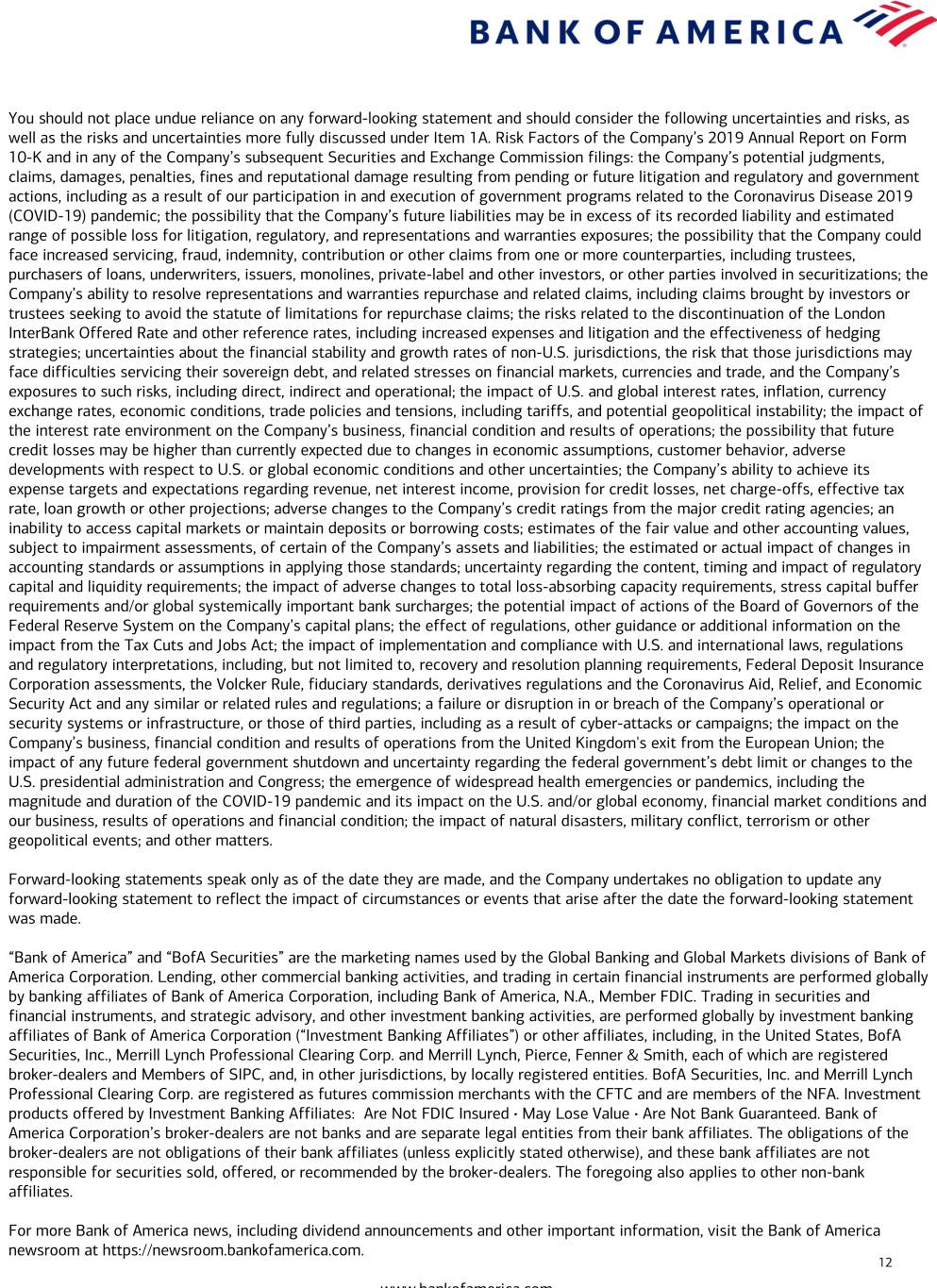 You should not place undue reliance on any forward-looking statement and should consider the following uncertainties and risks, as well as the risks and uncertainties more fully discussed under Item 1A. Risk Factors of the Company’s 2019 Annual Report on Form 10-K and in any of the Company’s subsequent Securities and Exchange Commission filings: the Company’s potential judgments, claims, damages, penalties, fines and reputational damage resulting from pending or future litigation and regulatory and government actions, including as a result of our participation in and execution of government programs related to the Coronavirus Disease 2019 (COVID-19) pandemic; the possibility that the Company’s future liabilities may be in excess of its recorded liability and estimated range of possible loss for litigation, regulatory, and representations and warranties exposures; the possibility that the Company could face increased servicing, fraud, indemnity, contribution or other claims from one or more counterparties, including trustees, purchasers of loans, underwriters, issuers, monolines, private-label and other investors, or other parties involved in securitizations; the Company’s ability to resolve representations and warranties repurchase and related claims, including claims brought by investors or trustees seeking to avoid the statute of limitations for repurchase claims; the risks related to the discontinuation of the London InterBank Offered Rate and other reference rates, including increased expenses and litigation and the effectiveness of hedging strategies; uncertainties about the financial stability and growth rates of non-U.S. jurisdictions, the risk that those jurisdictions may face difficulties servicing their sovereign debt, and related stresses on financial markets, currencies and trade, and the Company’s exposures to such risks, including direct, indirect and operational; the impact of U.S. and global interest rates, inflation, currency exchange rates, economic conditions, trade policies and tensions, including tariffs, and potential geopolitical instability; the impact of the interest rate environment on the Company’s business, financial condition and results of operations; the possibility that future credit losses may be higher than currently expected due to changes in economic assumptions, customer behavior, adverse developments with respect to U.S. or global economic conditions and other uncertainties; the Company’s ability to achieve its expense targets and expectations regarding revenue, net interest income, provision for credit losses, net charge-offs, effective tax rate, loan growth or other projections; adverse changes to the Company’s credit ratings from the major credit rating agencies; an inability to access capital markets or maintain deposits or borrowing costs; estimates of the fair value and other accounting values, subject to impairment assessments, of certain of the Company’s assets and liabilities; the estimated or actual impact of changes in accounting standards or assumptions in applying those standards; uncertainty regarding the content, timing and impact of regulatory capital and liquidity requirements; the impact of adverse changes to total loss-absorbing capacity requirements, stress capital buffer requirements and/or global systemically important bank surcharges; the potential impact of actions of the Board of Governors of the Federal Reserve System on the Company’s capital plans; the effect of regulations, other guidance or additional information on the impact from the Tax Cuts and Jobs Act; the impact of implementation and compliance with U.S. and international laws, regulations and regulatory interpretations, including, but not limited to, recovery and resolution planning requirements, Federal Deposit Insurance Corporation assessments, the Volcker Rule, fiduciary standards, derivatives regulations and the Coronavirus Aid, Relief, and Economic Security Act and any similar or related rules and regulations; a failure or disruption in or breach of the Company’s operational or security systems or infrastructure, or those of third parties, including as a result of cyber-attacks or campaigns; the impact on the Company’s business, financial condition and results of operations from the United Kingdom's exit from the European Union; the impact of any future federal government shutdown and uncertainty regarding the federal government’s debt limit or changes to the U.S. presidential administration and Congress; the emergence of widespread health emergencies or pandemics, including the magnitude and duration of the COVID-19 pandemic and its impact on the U.S. and/or global economy, financial market conditions and our business, results of operations and financial condition; the impact of natural disasters, military conflict, terrorism or other geopolitical events; and other matters. Forward-looking statements speak only as of the date they are made, and the Company undertakes no obligation to update any forward-looking statement to reflect the impact of circumstances or events that arise after the date the forward-looking statement was made. “Bank of America” and “BofA Securities” are the marketing names used by the Global Banking and Global Markets divisions of Bank of America Corporation. Lending, other commercial banking activities, and trading in certain financial instruments are performed globally by banking affiliates of Bank of America Corporation, including Bank of America, N.A., Member FDIC. Trading in securities and financial instruments, and strategic advisory, and other investment banking activities, are performed globally by investment banking affiliates of Bank of America Corporation (“Investment Banking Affiliates”) or other affiliates, including, in the United States, BofA Securities, Inc., Merrill Lynch Professional Clearing Corp. and Merrill Lynch, Pierce, Fenner & Smith, each of which are registered broker-de