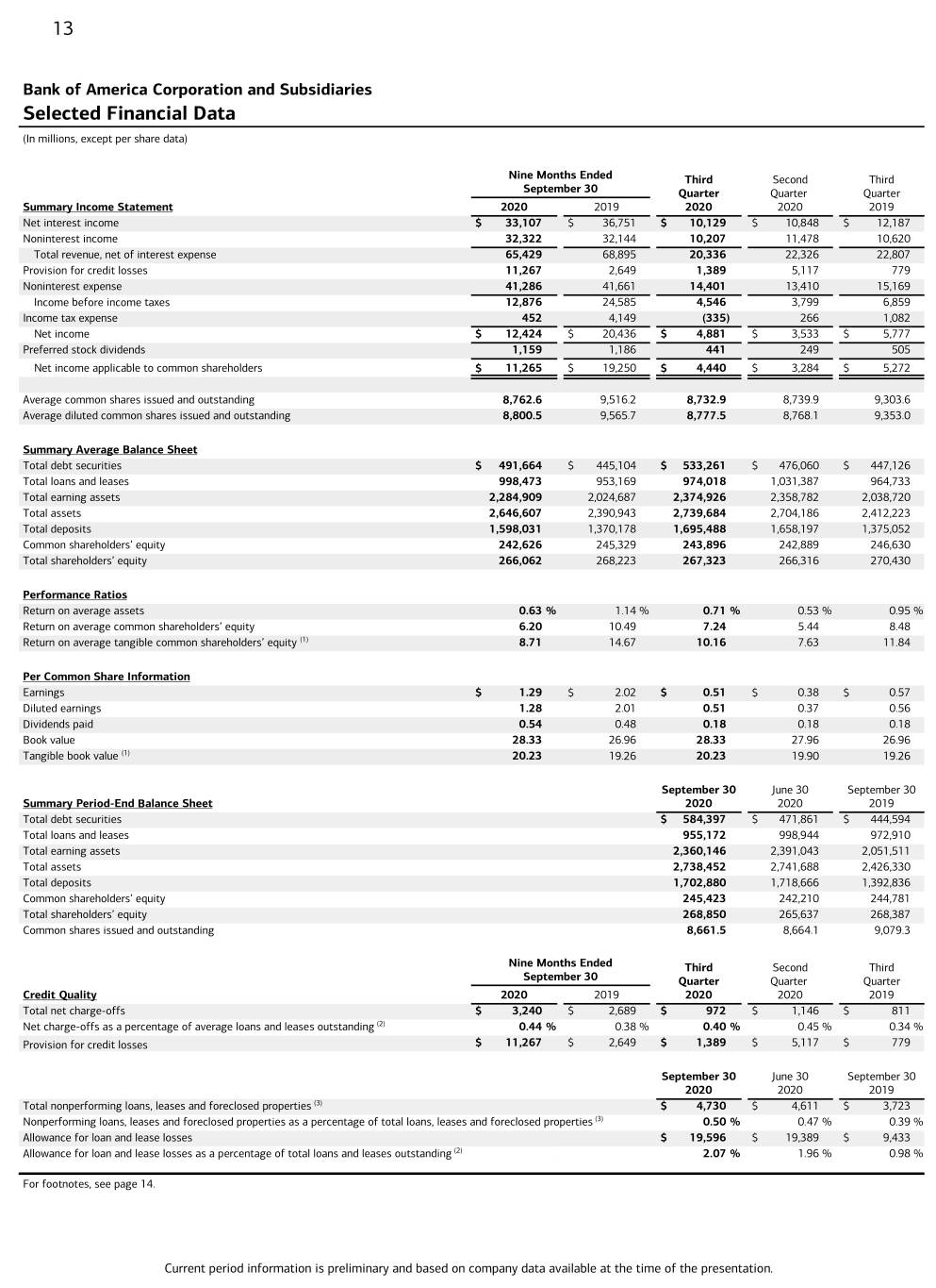 13 Bank of America Corporation and Subsidiaries Selected Financial Data (In millions, except per share data) Nine Months Ended Third Second Third September 30 Quarter Quarter Quarter Summary Income Statement 2020 2019 2020 2020 2019 Net interest income $ 33,107 $ 36,751 $ 10,129 $ 10,848 $ 12,187 Noninterest income 32,322 32,144 10,207 11,478 10,620 Total revenue, net of interest expense 65,429 68,895 20,336 22,326 22,807 Provision for credit losses 11,267 2,649 1,389 5,117 779 Noninterest expense 41,286 41,661 14,401 13,410 15,169 Income before income taxes 12,876 24,585 4,546 3,799 6,859 Income tax expense 452 4,149 (335) 266 1,082 Net income $ 12,424 $ 20,436 $ 4,881 $ 3,533 $ 5,777 Preferred stock dividends 1,159 1,186 441 249 505 Net income applicable to common shareholders $ 11,265 $ 19,250 $ 4,440 $ 3,284 $ 5,272 Average common shares issued and outstanding 8,762.6 9,516.2 8,732.9 8,739.9 9,303.6 Average diluted common shares issued and outstanding 8,800.5 9,565.7 8,777.5 8,768.1 9,353.0 Summary Average Balance Sheet Total debt securities $ 491,664 $ 445,104 $ 533,261 $ 476,060 $ 447,126 Total loans and leases 998,473 953,169 974,018 1,031,387 964,733 Total earning assets 2,284,909 2,024,687 2,374,926 2,358,782 2,038,720 Total assets 2,646,607 2,390,943 2,739,684 2,704,186 2,412,223 Total deposits 1,598,031 1,370,178 1,695,488 1,658,197 1,375,052 Common shareholders’ equity 242,626 245,329 243,896 242,889 246,630 Total shareholders’ equity 266,062 268,223 267,323 266,316 270,430 Performance Ratios Return on average assets 0.63 % 1.14 % 0.71 % 0.53 % 0.95 % Return on average common shareholders’ equity 6.20 10.49 7.24 5.44 8.48 Return on average tangible common shareholders’ equity (1) 8.71 14.67 10.16 7.63 11.84 Per Common Share Information Earnings $ 1.29 $ 2.02 $ 0.51 $ 0.38 $ 0.57 Diluted earnings 1.28 2.01 0.51 0.37 0.56 Dividends paid 0.54 0.48 0.18 0.18 0.18 Book value 28.33 26.96 28.33 27.96 26.96 Tangible book value (1) 20.23 19.26 20.23 19.90 19.26 September 30 June 30 September 30 Summary Period-End Balance Sheet 2020 2020 2019 Total debt securities $ 584,397 $ 471,861 $ 444,594 Total loans and leases 955,172 998,944 972,910 Total earning assets 2,360,146 2,391,043 2,051,511 Total assets 2,738,452 2,741,688 2,426,330 Total deposits 1,702,880 1,718,666 1,392,836 Common shareholders’ equity 245,423 242,210 244,781 Total shareholders’ equity 268,850 265,637 268,387 Common shares issued and outstanding 8,661.5 8,664.1 9,079.3 Nine Months Ended Third Second Third September 30 Quarter Quarter Quarter Credit Quality 2020 2019 2020 2020 2019 Total net charge-offs $ 3,240 $ 2,689 $ 972 $ 1,146 $ 811 Net charge-offs as a percentage of average loans and leases outstanding (2) 0.44 % 0.38 % 0.40 % 0.45 % 0.34 % Provision for credit losses $ 11,267 $ 2,649 $ 1,389 $ 5,117 $ 779 September 30 June 30 September 30 2020 2020 2019 Total nonperforming loans, leases and foreclosed properties (3) $ 4,730 $ 4,611 $ 3,723 Nonperforming loans, leases and foreclosed properties as a percentage of total loans, leases and foreclosed properties (3) 0.50 % 0.47 % 0.39 % Allowance for loan and lease losses $ 19,596 $ 19,389 $ 9,433 Allowance for loan and lease losses as a percentage of total loans and leases outstanding (2) 2.07 % 1.96 % 0.98 % For footnotes, see page 14. Current period information is preliminary and based on company data available at the time of the presentation.