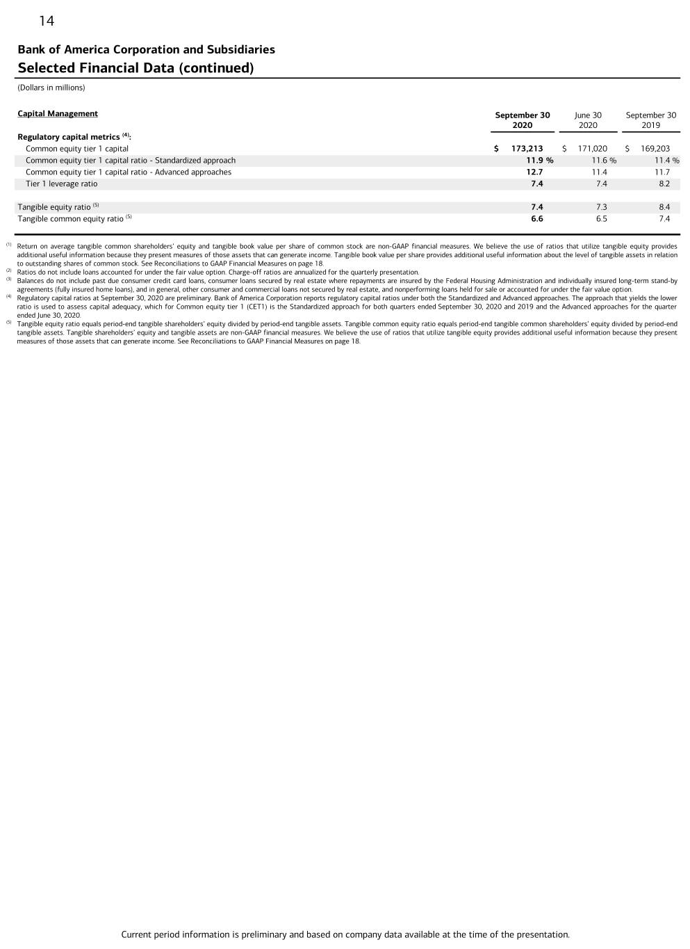 14 Bank of America Corporation and Subsidiaries Selected Financial Data (continued) (Dollars in millions) Capital Management September 30 June 30 September 30 2020 2020 2019 Regulatory capital metrics (4): Common equity tier 1 capital $ 173,213 $ 171,020 $ 169,203 Common equity tier 1 capital ratio - Standardized approach 11.9 % 11.6 % 11.4 % Common equity tier 1 capital ratio - Advanced approaches 12.7 11.4 11.7 Tier 1 leverage ratio 7.4 7.4 8.2 Tangible equity ratio (5) 7.4 7.3 8.4 Tangible common equity ratio (5) 6.6 6.5 7.4 (1) Return on average tangible common shareholders’ equity and tangible book value per share of common stock are non-GAAP financial measures. We believe the use of ratios that utilize tangible equity provides additional useful information because they present measures of those assets that can generate income. Tangible book value per share provides additional useful information about the level of tangible assets in relation to outstanding shares of common stock. See Reconciliations to GAAP Financial Measures on page 18. (2) Ratios do not include loans accounted for under the fair value option. Charge-off ratios are annualized for the quarterly presentation. (3) Balances do not include past due consumer credit card loans, consumer loans secured by real estate where repayments are insured by the Federal Housing Administration and individually insured long-term stand-by agreements (fully insured home loans), and in general, other consumer and commercial loans not secured by real estate, and nonperforming loans held for sale or accounted for under the fair value option. (4) Regulatory capital ratios at September 30, 2020 are preliminary. Bank of America Corporation reports regulatory capital ratios under both the Standardized and Advanced approaches. The approach that yields the lower ratio is used to assess capital adequacy, which for Common equity tier 1 (CET1) is the Standardized approach for both quarters ended September 30, 2020 and 2019 and the Advanced approaches for the quarter ended June 30, 2020. (5) Tangible equity ratio equals period-end tangible shareholders’ equity divided by period-end tangible assets. Tangible common equity ratio equals period-end tangible common shareholders’ equity divided by period-end tangible assets. Tangible shareholders’ equity and tangible assets are non-GAAP financial measures. We believe the use of ratios that utilize tangible equity provides additional useful information because they present measures of those assets that can generate income. See Reconciliations to GAAP Financial Measures on page 18. Current period information is preliminary and based on company data available at the time of the presentation.