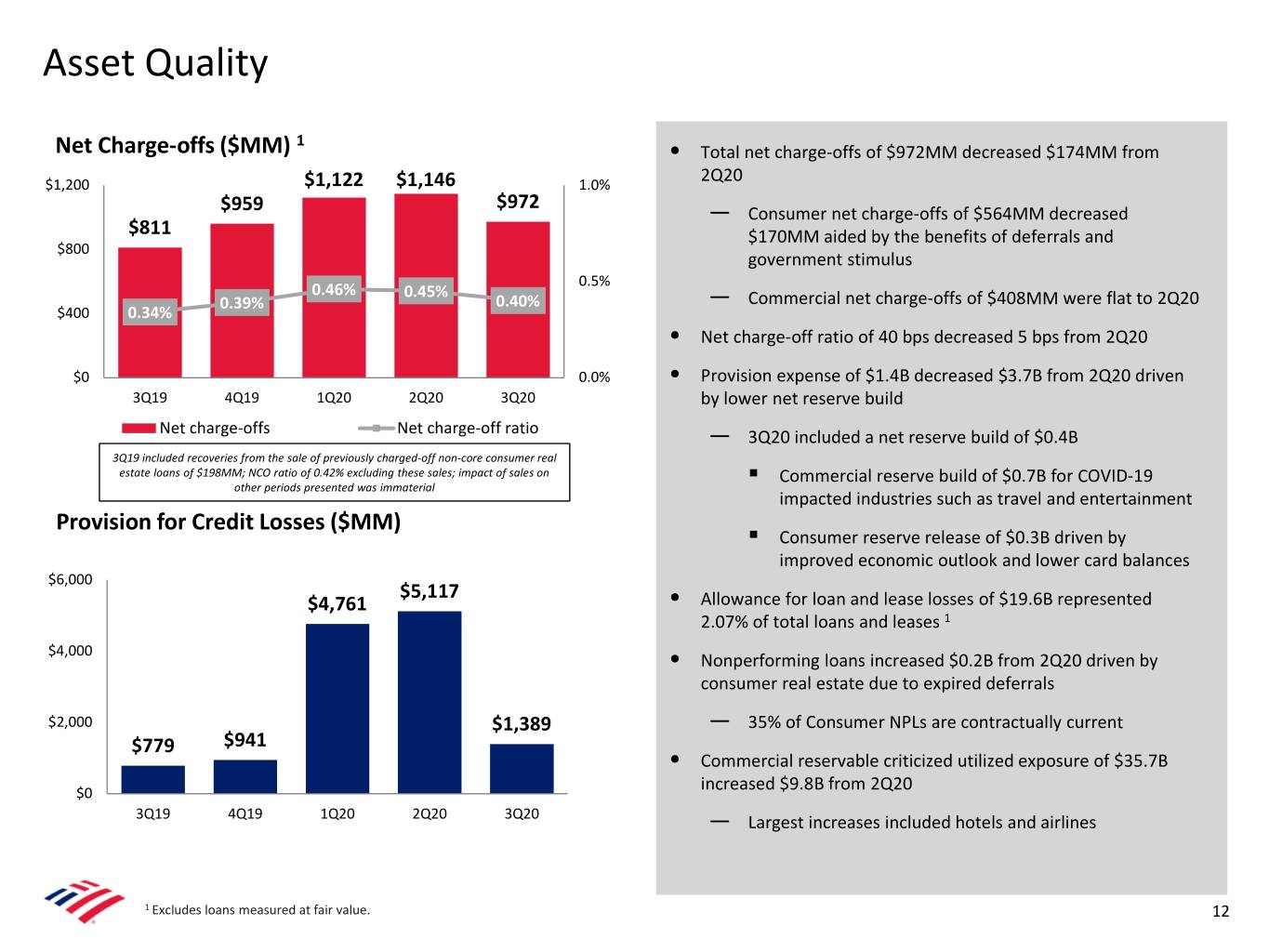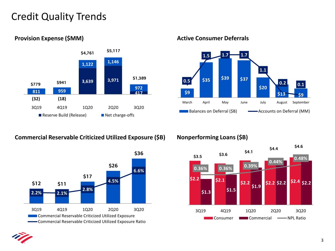 Credit Quality Trends Provision Expense ($MM) Active Consumer Deferrals $5,117 $4,761 1.5 1.7 1.7 1,146 1,122 1.1 $1,389 $39 3,639 3,971 0.5 $35 $37 $779 $941 0.2 0.1 972 $20 811 959 417 $9 $13 $9 (32) (18) March April May June July August September 3Q19 4Q19 1Q20 2Q20 3Q20 Balances on Deferral ($B) Accounts on Deferral (MM) Reserve Build (Release) Net charge-offs Commercial Reservable Criticized Utilized Exposure ($B) Nonperforming Loans ($B) $4.6 $4.4 $4.1 $36 $3.6 $3.5 0.48% 0.44% $26 0.39% 6.6% 0.36% 0.36% $17 4.5% $2.2 $2.1 $12 $11 $2.2 $2.2 $2.2 $2.4 $2.2 $1.9 2.8% $1.5 2.2% 2.1% $1.3 3Q19 4Q19 1Q20 2Q20 3Q20 3Q19 4Q19 1Q20 2Q20 3Q20 Commercial Reservable Criticized Utilized Exposure Consumer Commercial NPL Ratio Commercial Reservable Criticized Utilized Exposure Ratio 3