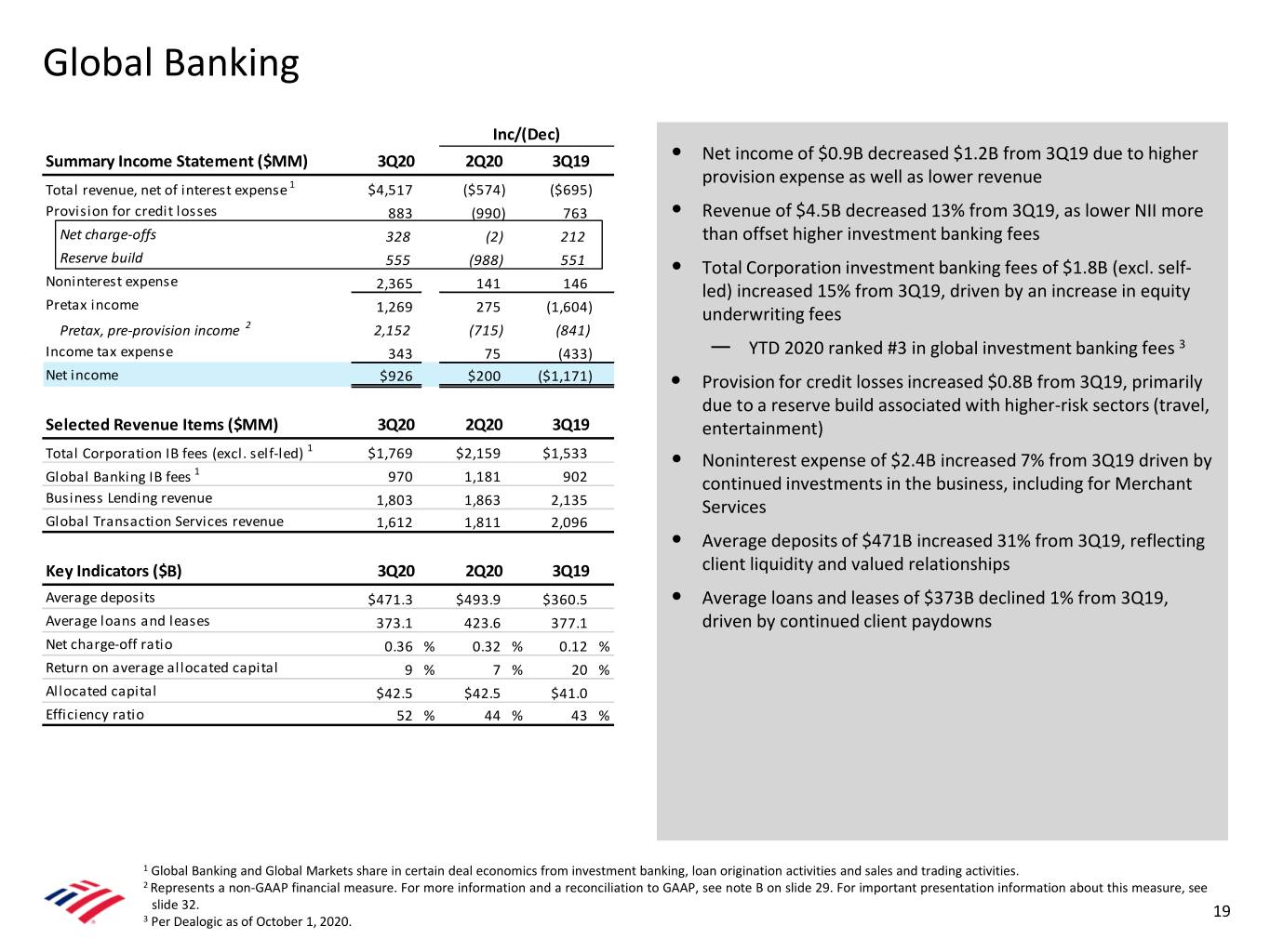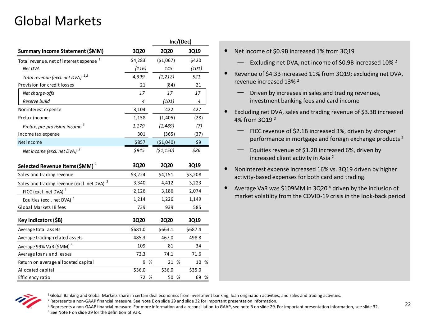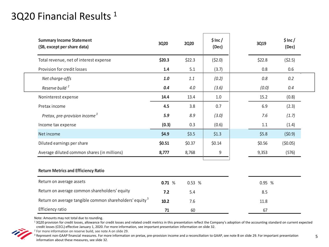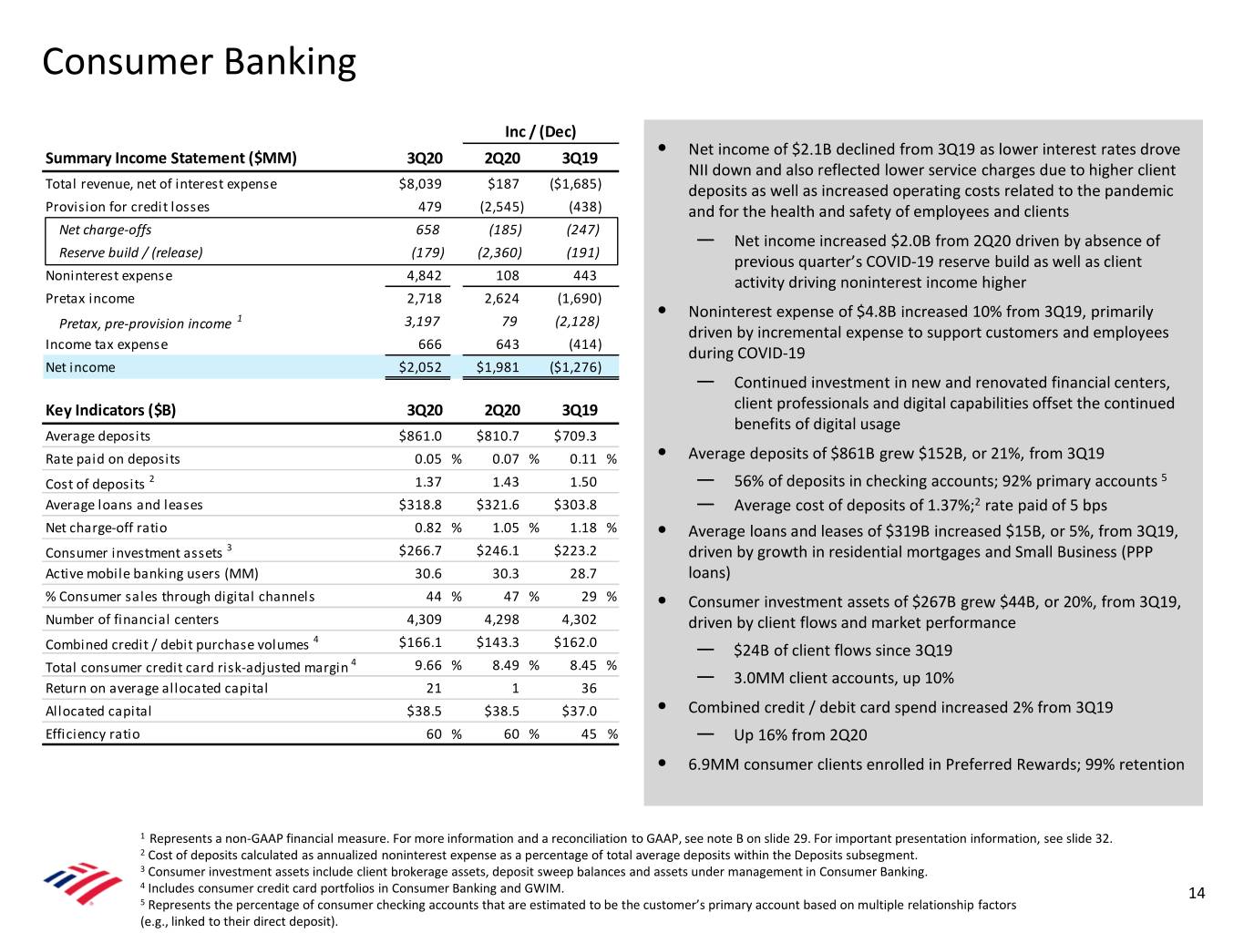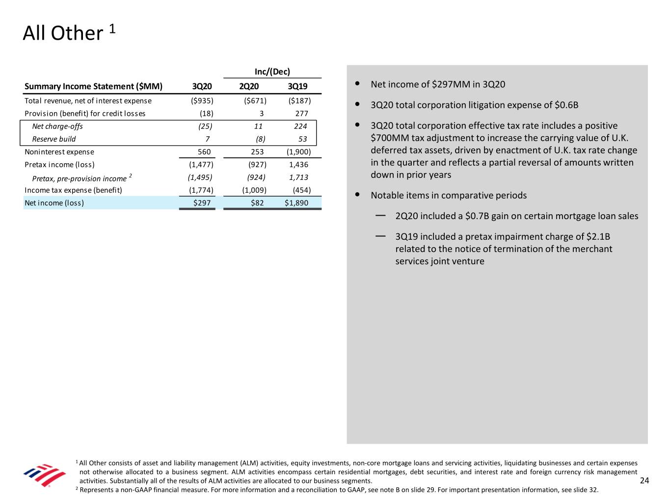Notes A Reserve Build (or Release) is calculated by subtracting net charge-offs for the period from the provision for credit losses recognized in that period. The period-end allowance, or reserve, for credit losses reflects the beginning of the period allowance adjusted for net charge-offs recorded in that period plus the provision for credit losses recognized in that period. B Pretax, pre-provision income (PTPI) at the consolidated level is a non-GAAP financial measure calculated by adjusting consolidated pretax income to add back provision for credit losses. Similarly, PTPI at the segment level is a non-GAAP financial measure calculated by adjusting the segments’ pretax income to add back provision for credit losses. Management believes that PTPI (both at the consolidated and segment level) is a useful financial measure as it enables an assessment of the Company’s ability to generate earnings to cover credit losses through a credit cycle as well as provides an additional basis for comparing the Company's results of operations between periods by isolating the impact of provision for credit losses, which can vary significantly between periods. See reconciliation below. 3Q20 2Q20 3Q19 Provision for Pretax, Pre- Provision for Pretax, Pre- Provision for Pretax, Pre- $ Millions Pretax Income Credit Losses provision Income Pretax Income Credit Losses provision Income Pretax Income Credit Losses provision Income Consumer Banking $ 2,718 $ 479 $ 3,197 $ 94 $ 3,024 $ 3,118 $ 4,408 $ 917 $ 5,325 Global Wealth & Investment Management 992 24 1,016 826 136 962 1,453 37 1,490 Global Banking 1,269 883 2,152 994 1,873 2,867 2,873 120 2,993 Global Markets 1,158 21 1,179 2,563 105 2,668 1,186 - 1,186 All Other (1,477) (18) (1,495) (550) (21) (571) (2,913) (295) (3,208) Total Corporation (GAAP) $ 4,546 $ 1,389 $ 5,935 $ 3,799 $ 5,117 $ 8,916 $ 6,859 $ 779 $ 7,638 C Global Liquidity Sources (GLS) include cash and high-quality, liquid, unencumbered securities, inclusive of U.S. government securities, U.S. agency securities, U.S. agency MBS, and a select group of non-U.S. government and supranational securities, and other investment-grade securities, and are readily available to meet funding requirements as they arise. It does not include Federal Reserve Discount Window or Federal Home Loan Bank borrowing capacity. Transfers of liquidity among legal entities may be subject to certain regulatory and other restrictions. D The non-cash impairment charge related to the notice of termination of the merchant services joint venture reduced 3Q19 net income by $1.7B, which included an increase in noninterest expense and a reduction in pretax income of $2.1B and a reduction in income tax expense of $373MM. The impairment charge negatively impacted the Company’s 3Q19 efficiency ratio by 909 bps. E Revenue for all periods included net debit valuation adjustments (DVA) on derivatives, as well as amortization of own credit portion of purchase discount and realized DVA on structured liabilities. Net DVA gains (losses) were ($116MM), ($261MM) and ($15MM) for 3Q20, 2Q20 and 3Q19, respectively, and ($77MM), ($136MM), ($214MM) and ($310MM) for 2020 YTD, 2019 YTD, 2018 YTD and 2017 YTD, respectively. Net DVA gains (losses) included in FICC revenue were ($107MM), ($245MM) and ($18MM) for 3Q20, 2Q20 and 3Q19, respectively and ($78MM), ($127MM), ($187MM) and ($282MM) for 2020 YTD, 2019 YTD, 2018 YTD and 2017 YTD, respectively. Net DVA gains (losses) included in Equities revenue were ($9MM), ($16MM) and $3MM for 3Q20, 2Q20 and 3Q19, respectively and $1MM, ($9MM), ($27MM) and ($28MM) for 2020 YTD, 2019 YTD, 2018 YTD and 2017 YTD, respectively. F VaR model uses historical simulation approach based on three years of historical data and an expected shortfall methodology equivalent to a 99% confidence level. Using a 95% confidence level, average VaR was $22MM, $21MM and $19MM for 3Q20, 2Q20 and 3Q19, respectively, and $23MM, $20MM, $18MM and $21MM for 2020 YTD, 2019 YTD, 2018 YTD and 2017 YTD, respectively. 29