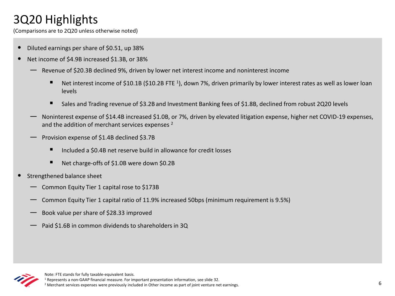 3Q20 Financial Results 1 Summary Income Statement $ Inc / $ Inc / 3Q20 2Q20 3Q19 ($B, except per share data) (Dec) (Dec) Total revenue, net of interest expense $20.3 $22.3 ($2.0) $22.8 ($2.5) Provision for credit losses 1.4 5.1 (3.7) 0.8 0.6 Net charge-offs 1.0 1.1 (0.2) 0.8 0.2 Reserve build 2 0.4 4.0 (3.6) (0.0) 0.4 Noninterest expense 14.4 13.4 1.0 15.2 (0.8) Pretax income 4.5 3.8 0.7 6.9 (2.3) Pretax, pre-provision income 3 5.9 8.9 (3.0) 7.6 (1.7) Income tax expense (0.3) 0.3 (0.6) 1.1 (1.4) Net income $4.9 $3.5 $1.3 $5.8 ($0.9) Diluted earnings per share $0.51 $0.37 $0.14 $0.56 ($0.05) Average diluted common shares (in millions) 8,777 8,768 9 9,353 (576) Return Metrics and Efficiency Ratio Return on average assets 0.71 % 0.53 % 0.95 % Return on average common shareholders' equity 7.2 5.4 8.5 3 Return on average tangible common shareholders' equity 10.2 7.6 11.8 Efficiency ratio 71 60 67 Note: Amounts may not total due to rounding. 1 3Q20 provision for credit losses, allowance for credit losses and related credit metrics in this presentation reflect the Company’s adoption of the accounting standard on current expected credit losses (CECL) effective January 1, 2020. For more information, see important presentation information on slide 32. 2 For more information on reserve build, see note A on slide 29. 3 Represent non-GAAP financial measures. For more information on pretax, pre-provision income and a reconciliation to GAAP, see note B on slide 29. For important presentation 5 information about these measures, see slide 32.