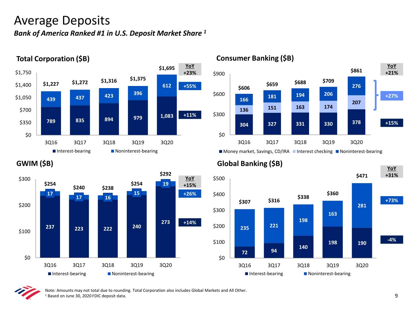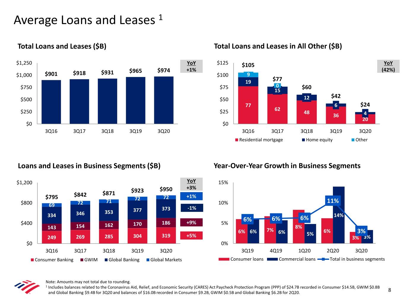 Average Loans and Leases 1 Total Loans and Leases ($B) Total Loans and Leases in All Other ($B) $1,250 YoY $125 $105 YoY $965 $974 +1% (42%) $1,000 $901 $918 $931 $100 9 19 $77 $750 $75 0 $60 15 $42 $500 $50 12 77 6 $24 62 $250 $25 48 36 4 20 $0 $0 3Q16 3Q17 3Q18 3Q19 3Q20 3Q16 3Q17 3Q18 3Q19 3Q20 Residential mortgage Home equity Other Loans and Leases in Business Segments ($B) Year-Over-Year Growth in Business Segments $1,200 YoY 15% $950 +3% $871 $923 $795 $842 72 +1% 71 72 11% $800 69 72 10% 373 -1% 353 377 334 346 14% 6% 6% 6% $400 170 186 +9% 5% 143 154 162 8% 7% 6% 6% 6% 6% 5% 3% 249 269 285 304 319 +5% 3% 3% $0 0% 3Q16 3Q17 3Q18 3Q19 3Q20 3Q19 4Q19 1Q20 2Q20 3Q20 Consumer Banking GWIM Global Banking Global Markets Consumer loans Commercial loans Total in business segments Note: Amounts may not total due to rounding. 1 Includes balances related to the Coronavirus Aid, Relief, and Economic Security (CARES) Act Paycheck Protection Program (PPP) of $24.7B recorded in Consumer $14.5B, GWIM $0.8B and Global Banking $9.4B for 3Q20 and balances of $16.0B recorded in Consumer $9.2B, GWIM $0.5B and Global Banking $6.2B for 2Q20. 8