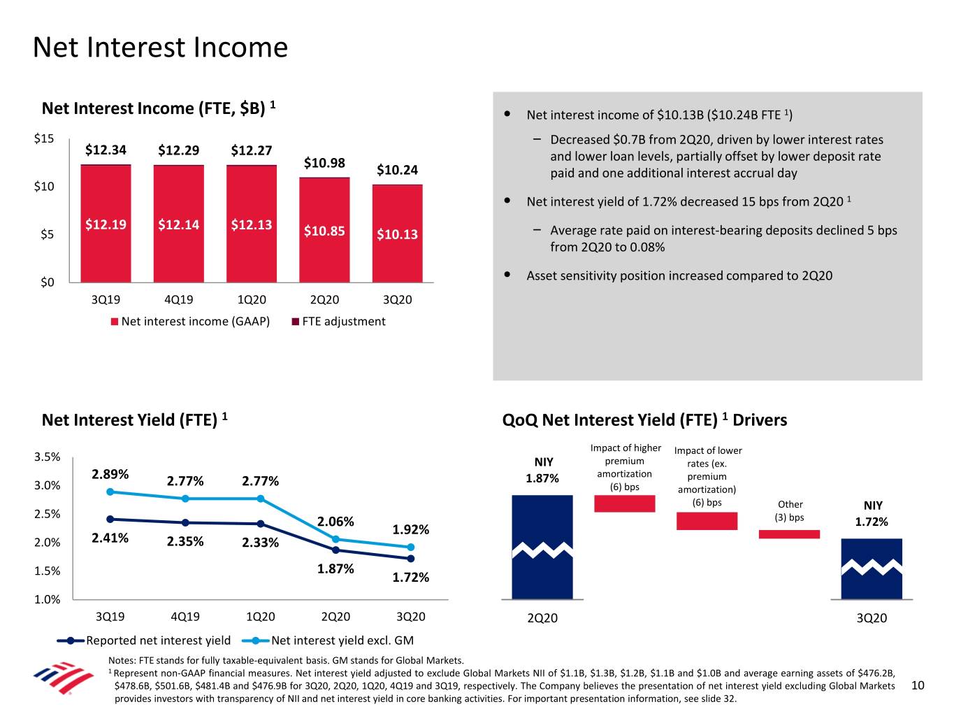 Average Deposits Bank of America Ranked #1 in U.S. Deposit Market Share 1 Total Corporation ($B) Consumer Banking ($B) YoY YoY $1,695 $861 $1,750 +23% $900 +21% $1,316 $1,375 $709 $1,400 $1,227 $1,272 $659 $688 612 +55% $606 276 423 396 $600 194 206 +27% $1,050 439 437 181 166 207 174 $700 136 151 163 $300 979 1,083 +11% 789 835 894 $350 304 327 331 330 378 +15% $0 $0 3Q16 3Q17 3Q18 3Q19 3Q20 3Q16 3Q17 3Q18 3Q19 3Q20 Interest-bearing Noninterest-bearing Money market, Savings, CD/IRA Interest checking Noninterest-bearing GWIM ($B) Global Banking ($B) YoY $292 $471 +31% $300 YoY $500 $254 $254 19 $240 $238 +15% 17 15 +26% $400 $360 17 16 $338 $307 $316 +73% $200 281 $300 163 273 +14% 198 237 240 $200 235 221 $100 223 222 -4% $100 198 190 140 72 94 $0 $0 3Q16 3Q17 3Q18 3Q19 3Q20 3Q16 3Q17 3Q18 3Q19 3Q20 Interest-bearing Noninterest-bearing Interest-bearing Noninterest-bearing Note: Amounts may not total due to rounding. Total Corporation also includes Global Markets and All Other. 1 Based on June 30, 2020 FDIC deposit data. 9