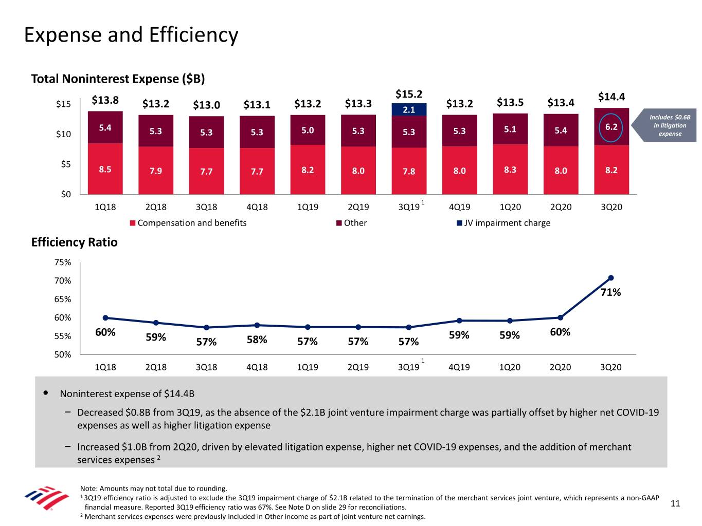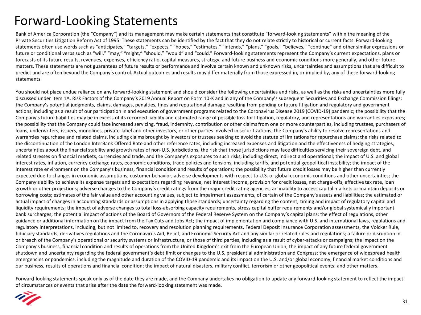 Forward-Looking Statements Bank of America Corporation (the “Company”) and its management may make certain statements that constitute “forward-looking statements” within the meaning of the Private Securities Litigation Reform Act of 1995. These statements can be identified by the fact that they do not relate strictly to historical or current facts. Forward-looking statements often use words such as “anticipates,” “targets,” “expects,” “hopes,” “estimates,” “intends,” “plans,” “goals,” “believes,” “continue” and other similar expressions or future or conditional verbs such as “will,” “may,” “might,” “should,” “would” and “could.” Forward-looking statements represent the Company’s current expectations, plans or forecasts of its future results, revenues, expenses, efficiency ratio, capital measures, strategy, and future business and economic conditions more generally, and other future matters. These statements are not guarantees of future results or performance and involve certain known and unknown risks, uncertainties and assumptions that are difficult to predict and are often beyond the Company’s control. Actual outcomes and results may differ materially from those expressed in, or implied by, any of these forward-looking statements. You should not place undue reliance on any forward-looking statement and should consider the following uncertainties and risks, as well as the risks and uncertainties more fully discussed under Item 1A. Risk Factors of the Company’s 2019 Annual Report on Form 10-K and in any of the Company’s subsequent Securities and Exchange Commission filings: the Company’s potential judgments, claims, damages, penalties, fines and reputational damage resulting from pending or future litigation and regulatory and government actions, including as a result of our participation in and execution of government programs related to the Coronavirus Disease 2019 (COVID-19) pandemic; the possibility that the Company’s future liabilities may be in excess of its recorded liability and estimated range of possible loss for litigation, regulatory, and representations and warranties exposures; the possibility that the Company could face increased servicing, fraud, indemnity, contribution or other claims from one or more counterparties, including trustees, purchasers of loans, underwriters, issuers, monolines, private-label and other investors, or other parties involved in securitizations; the Company’s ability to resolve representations and warranties repurchase and related claims, including claims brought by investors or trustees seeking to avoid the statute of limitations for repurchase claims; the risks related to the discontinuation of the London InterBank Offered Rate and other reference rates, including increased expenses and litigation and the effectiveness of hedging strategies; uncertainties about the financial stability and growth rates of non-U.S. jurisdictions, the risk that those jurisdictions may face difficulties servicing their sovereign debt, and related stresses on financial markets, currencies and trade, and the Company’s exposures to such risks, including direct, indirect and operational; the impact of U.S. and global interest rates, inflation, currency exchange rates, economic conditions, trade policies and tensions, including tariffs, and potential geopolitical instability; the impact of the interest rate environment on the Company’s business, financial condition and results of operations; the possibility that future credit losses may be higher than currently expected due to changes in economic assumptions, customer behavior, adverse developments with respect to U.S. or global economic conditions and other uncertainties; the Company’s ability to achieve its expense targets and expectations regarding revenue, net interest income, provision for credit losses, net charge-offs, effective tax rate, loan growth or other projections; adverse changes to the Company’s credit ratings from the major credit rating agencies; an inability to access capital markets or maintain deposits or borrowing costs; estimates of the fair value and other accounting values, subject to impairment assessments, of certain of the Company’s assets and liabilities; the estimated or actual impact of changes in accounting standards or assumptions in applying those standards; uncertainty regarding the content, timing and impact of regulatory capital and liquidity requirements; the impact of adverse changes to total loss-absorbing capacity requirements, stress capital buffer requirements and/or global systemically important bank surcharges; the potential impact of actions of the Board of Governors of the Federal Reserve System on the Company’s capital plans; the effect of regulations, other guidance or additional information on the impact from the Tax Cuts and Jobs Act; the impact of implementation and compliance with U.S. and international laws, regulations and regulatory interpretations, including, but not limited to, recovery and resolution planning requirements, Federal Deposit Insurance Corporation assessments, the Volcker Rule, fiduciary standards, derivatives regulations and the Coronavirus Aid, Relief, and Economic Security Act and any similar or related rules and regulations; a failure or disruption in or breach of the Company’s operational or security systems or infrastructure, or those of third parties, including as a result of cyber-attacks or campaigns; the impact on the Company’s business, financial condition and results of operations from the United Kingdom's exit from the European Union; the impact of any future federal government shutdown and uncertainty regarding the federal government’s debt limit or changes to the U.S. presidential administration and Congress; the emergence of widespread health emergencies or pandemics, including the magnitude and duration of the COVID-19 pandemic an